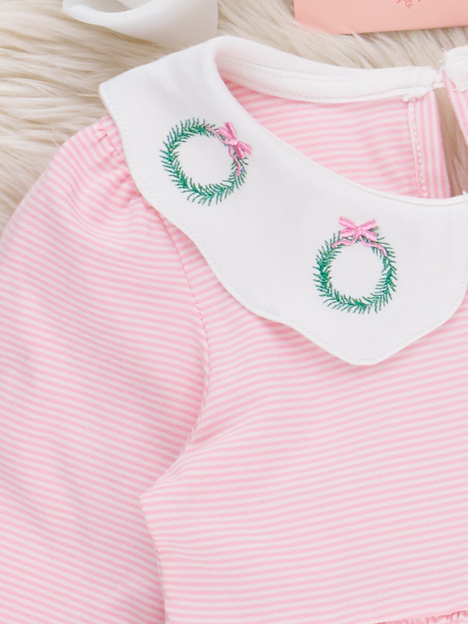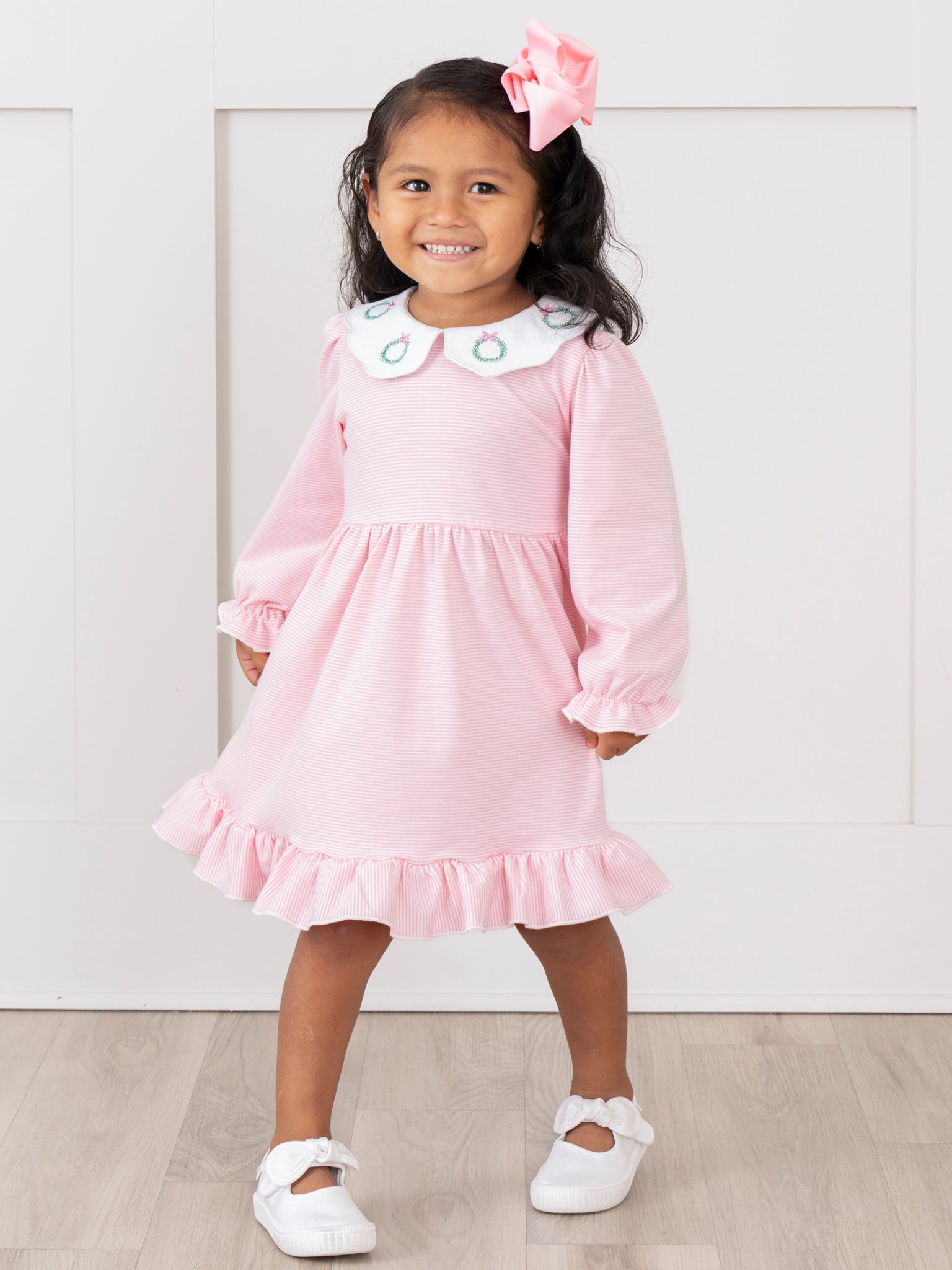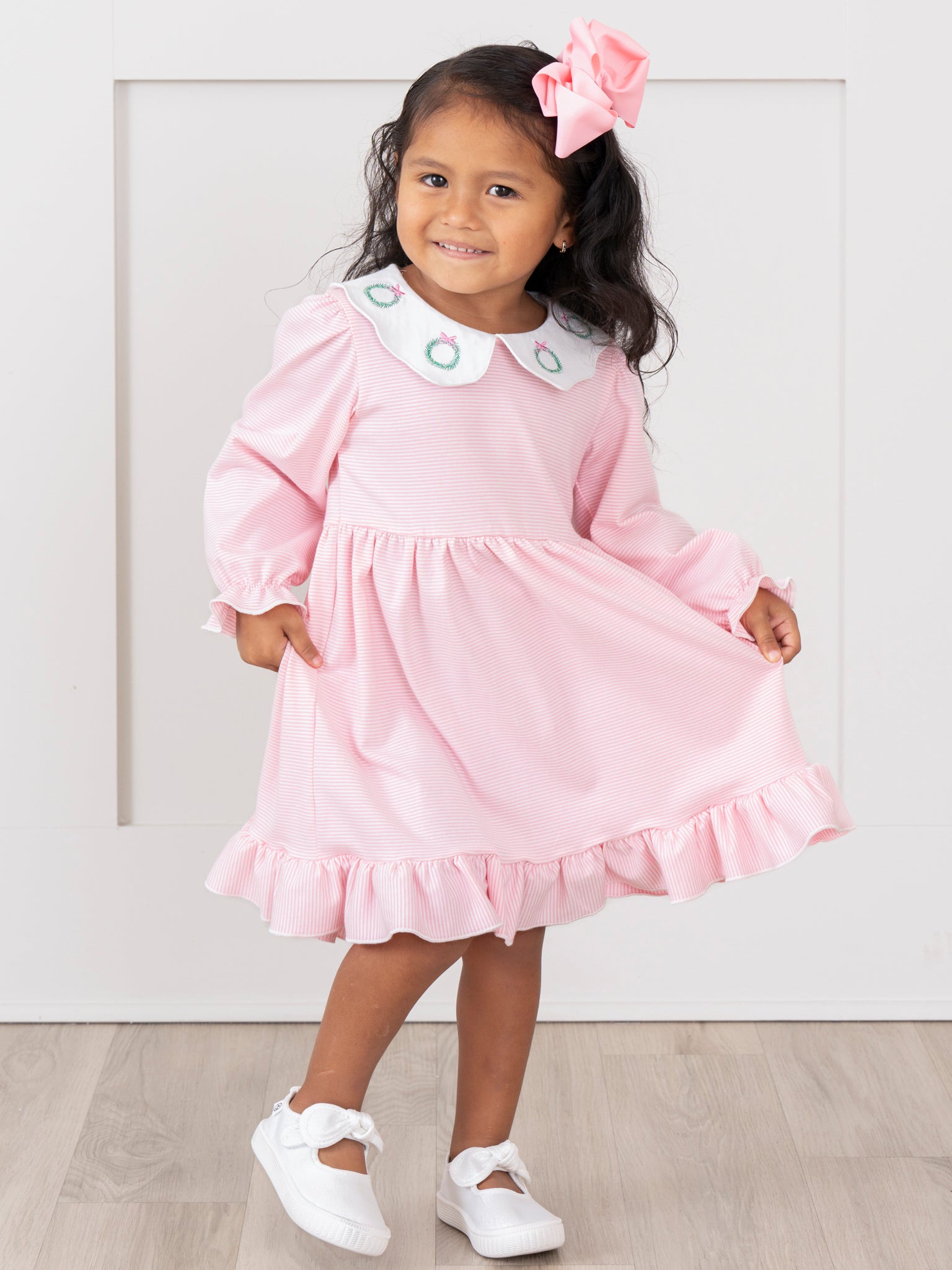 Get your little girl in the festive spirit with our Pink Holiday Wreath Scallop Collar Dress! This adorable girls dress is made of soft fabric with pink stripes and features embroidered holiday wreaths on a unique scallop style collar. Perfect for Christmas, this dress also has a cute blow sleeve detail, ruffle hem and perfectly pairs with our matching sister set.