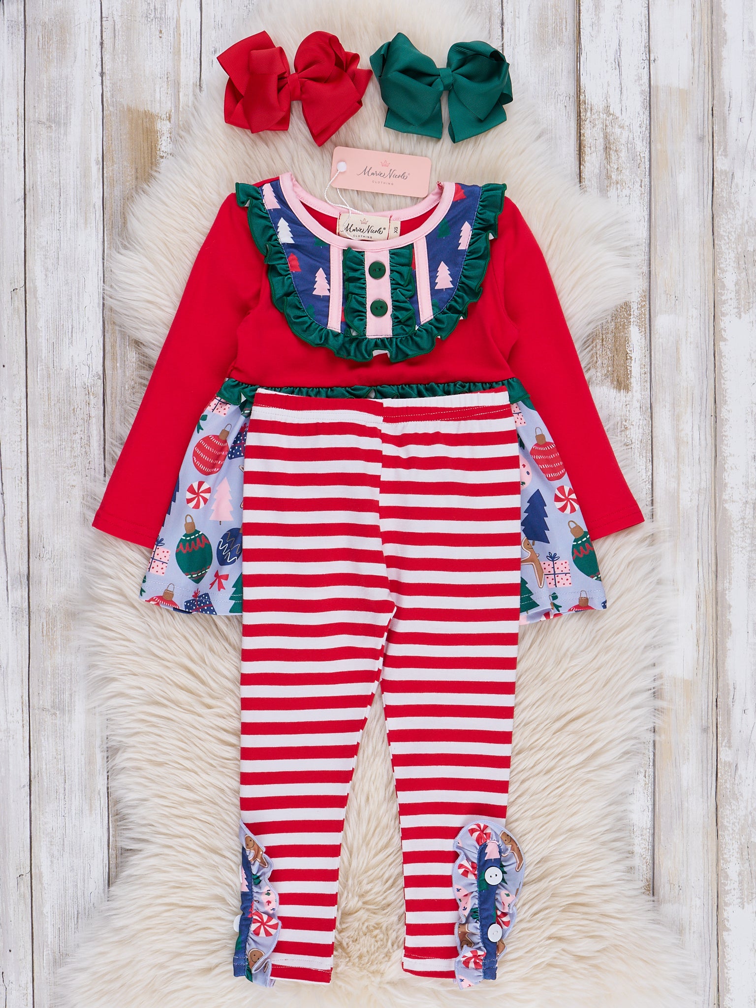 Looking for sibling style? Dress your little ones in this eye-catching Red & Light Blue Holiday Joy Ruffle Outfit by Marie Nicole Clothing! Featuring a top with a sweet red bodice and festive green ruffles, plus an ornament print peplum detail. The top pairs perfectly with the candy cane stripe ruffle leggings to really get them in the holiday spirit! They'll be ready for family photoshoots and yuletide fun!