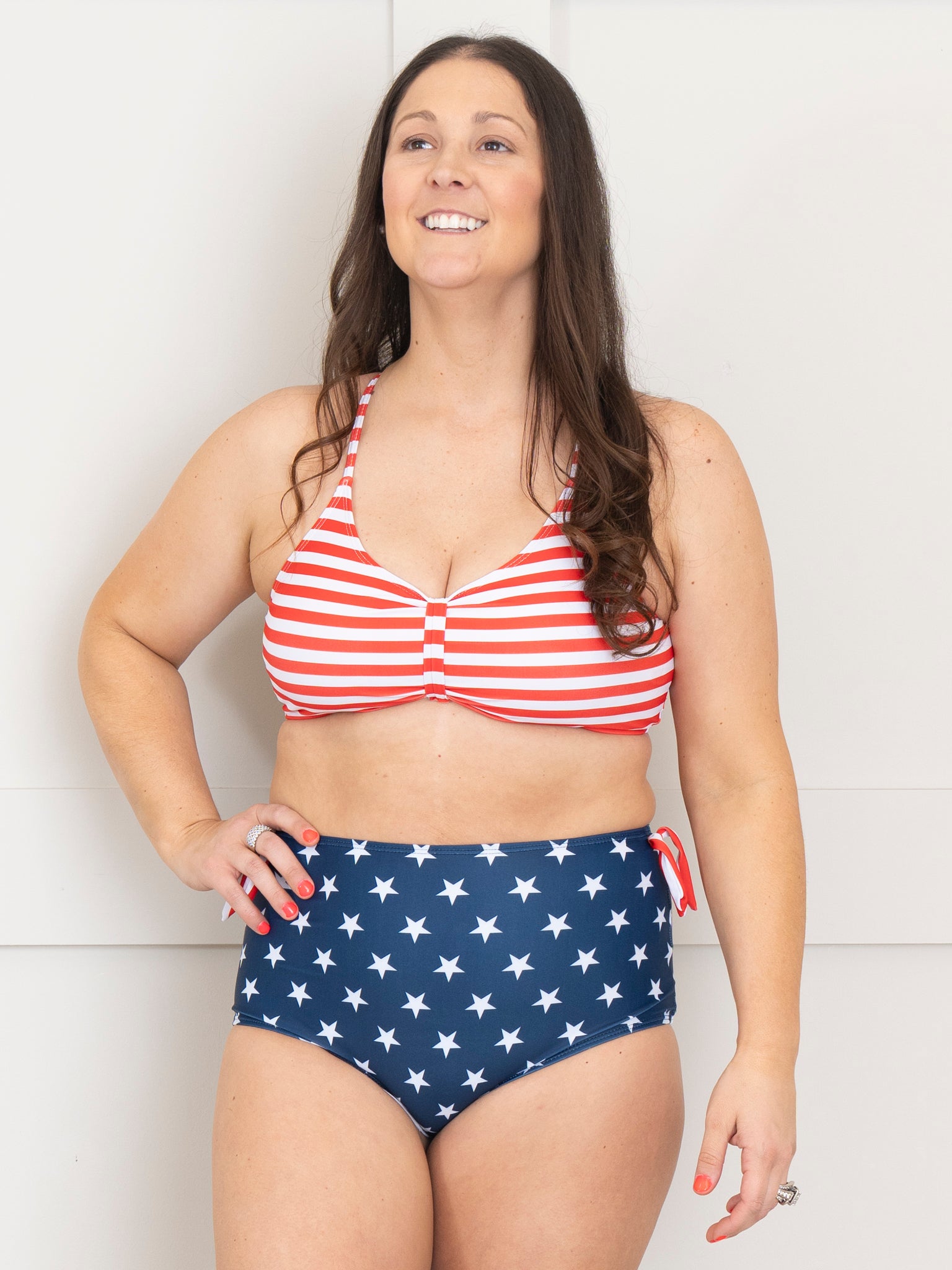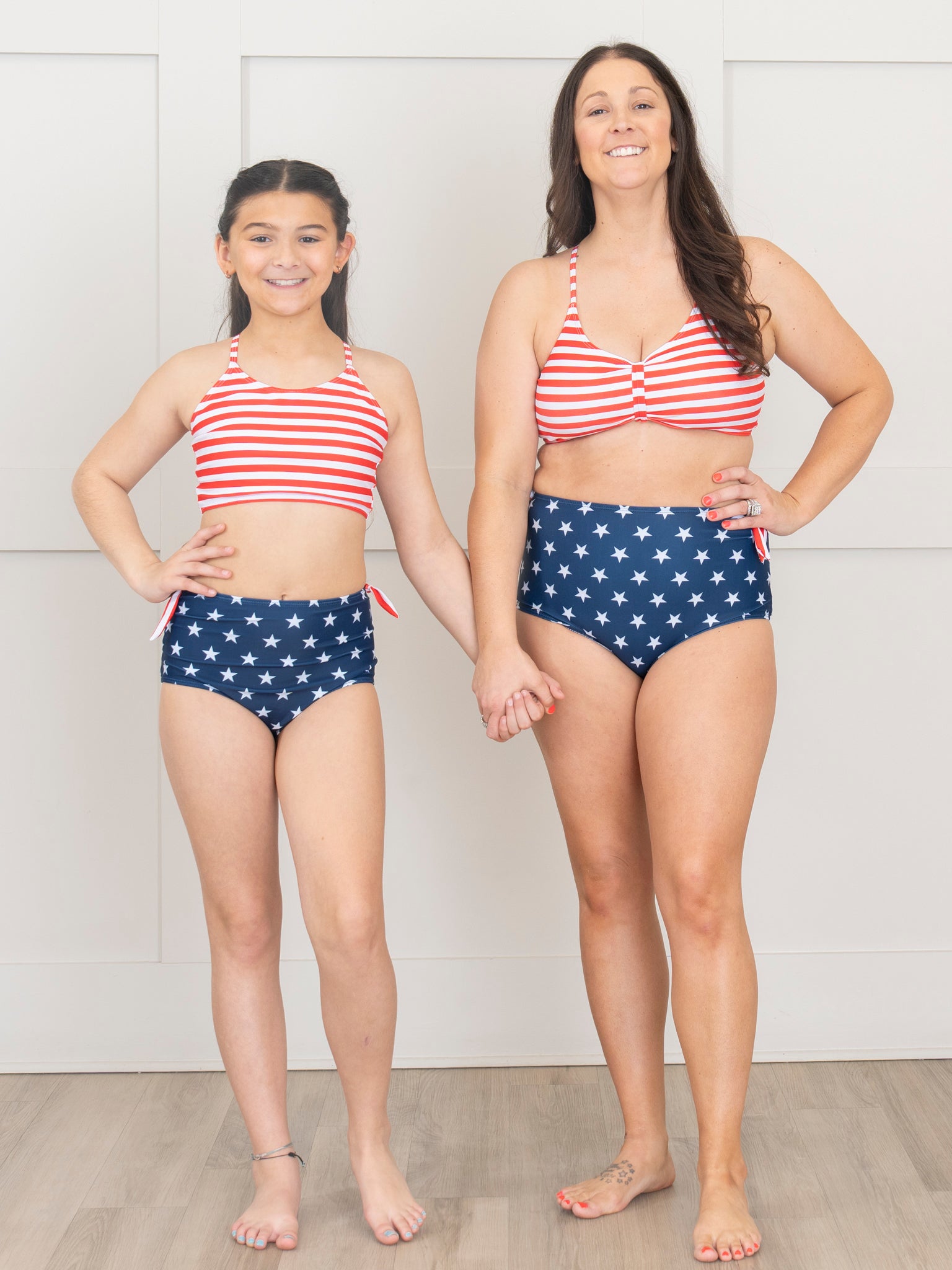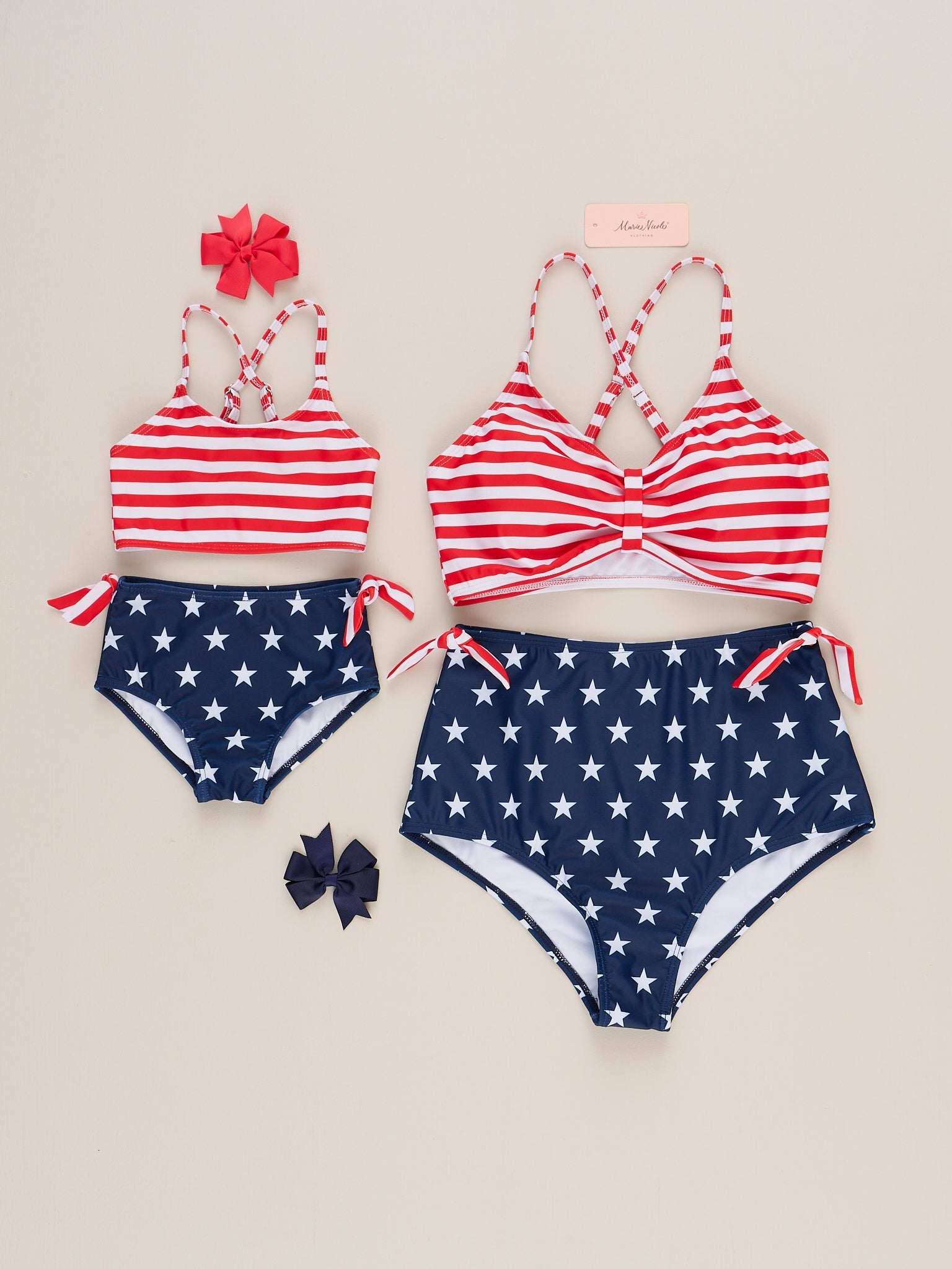 Get ready to show off your patriotic spirit in this Mom & Me Patriotic Halter Swimsuit set from Marie Nicole Clothing. The comfy halter top features bold stripes & padding while the high waist bottom is adorned with stars. Perfect for summertime fun and celebrating Independence Day with your mini-me!