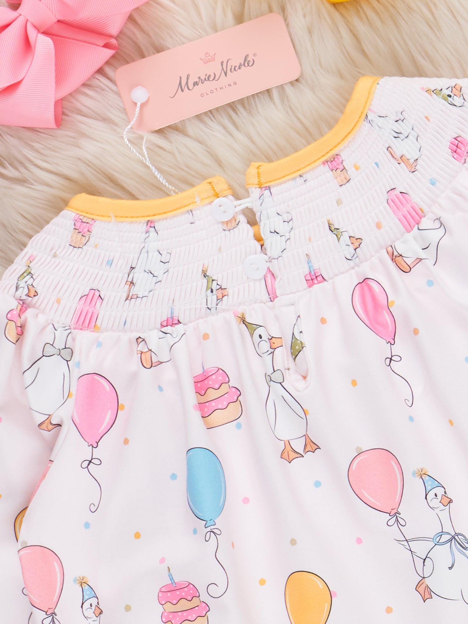 The Balloon Bash Smocked Dress by Marie Nicole features balloon and goose print and a decorative collar with smocked accents. Long gathered sleeves at the sides add comfort and playful charm, making this dress perfect for your silly little goose's birthday celebrations and everyday adventure!