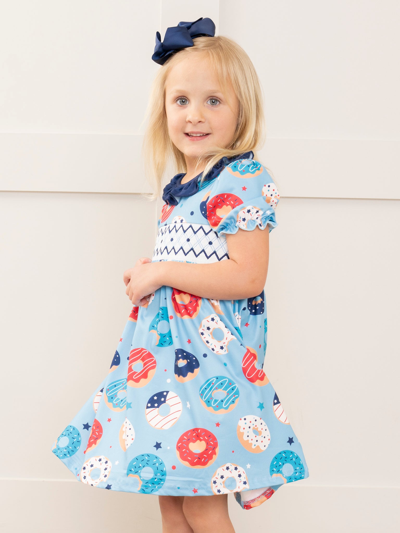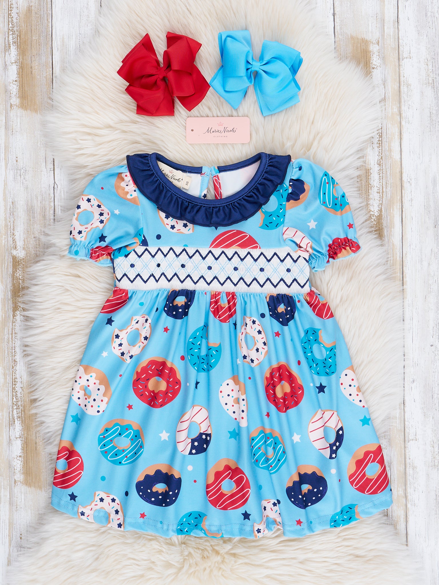 Get ready for some sweet summer fun with this playful sister set! Featuring a patriotic print of delicious donuts, this dress is perfect for your little girl. The smocked design adds a touch of whimsy while keeping her cool and comfortable. Perfect for playdates, picnics, and more!