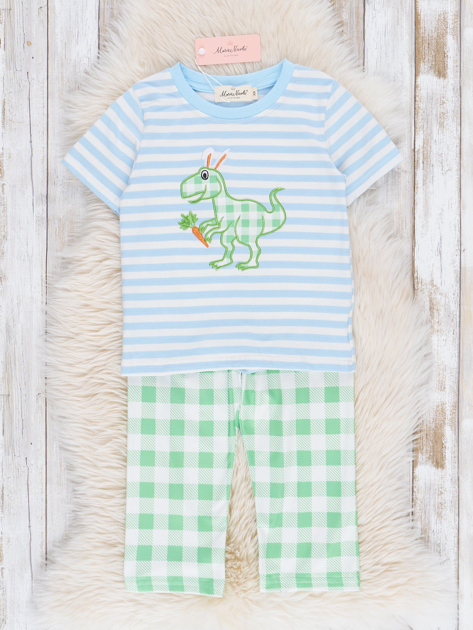 Blue & Green Gingham Embroidered T-Rex Outfit