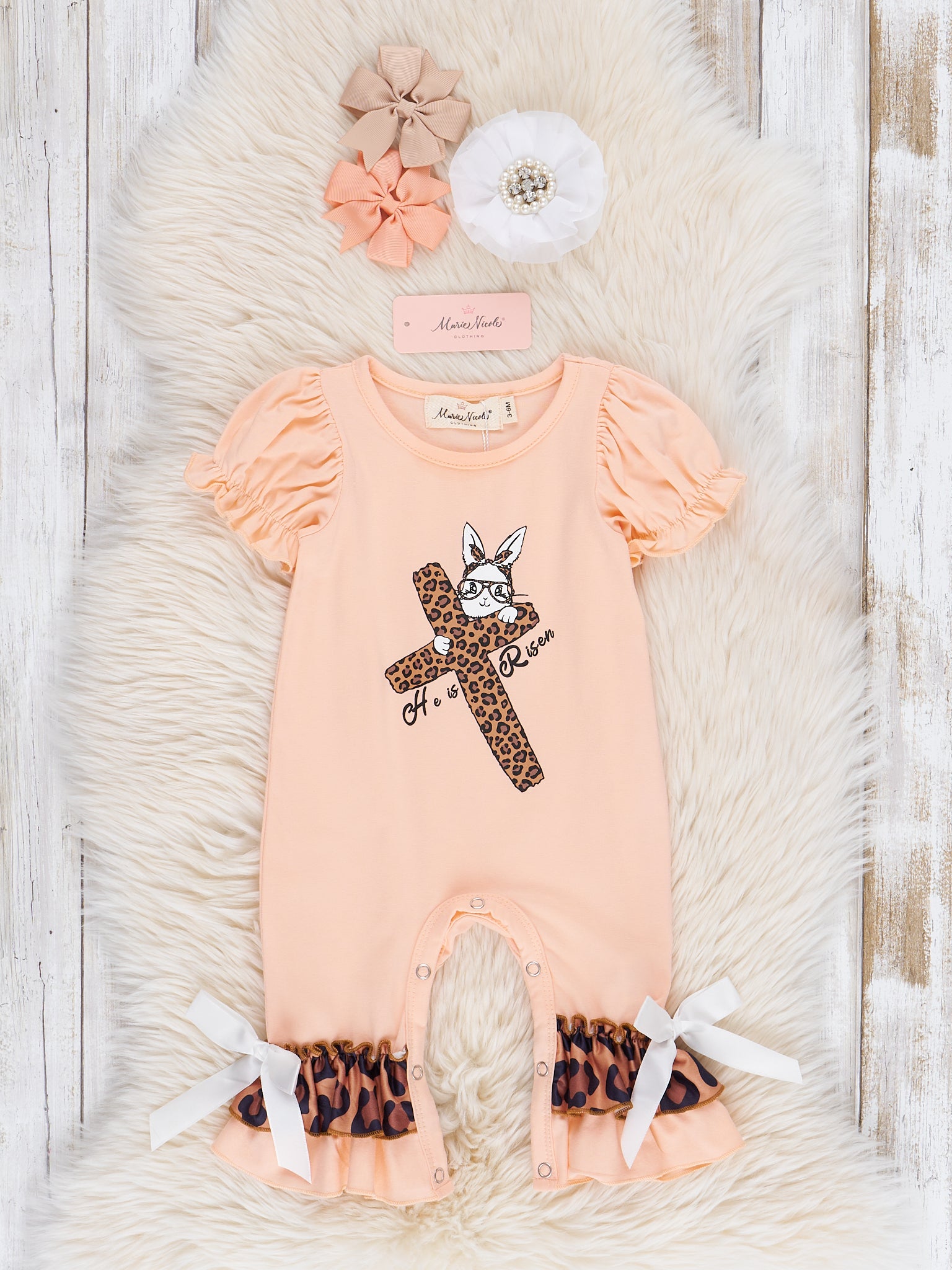 Peach & Leopard "He is Risen" Ruffle Romper