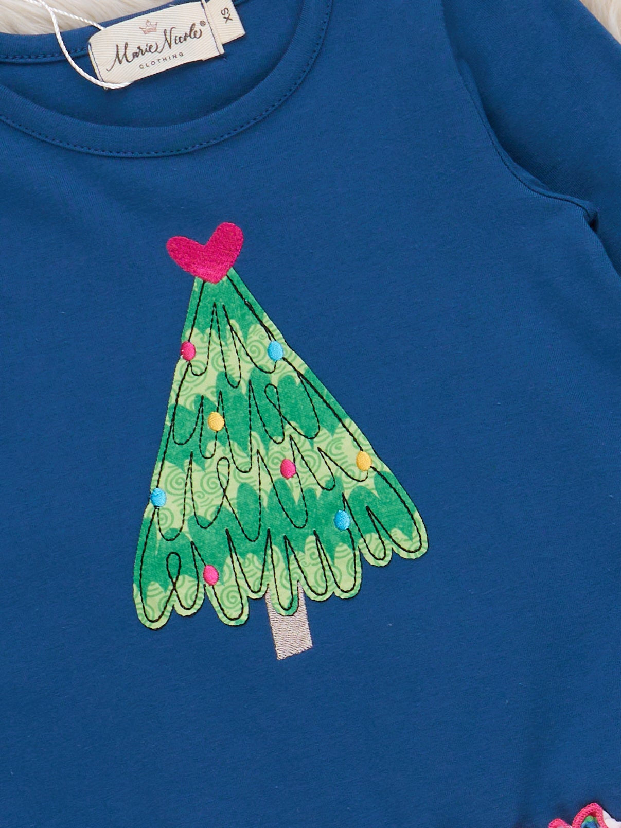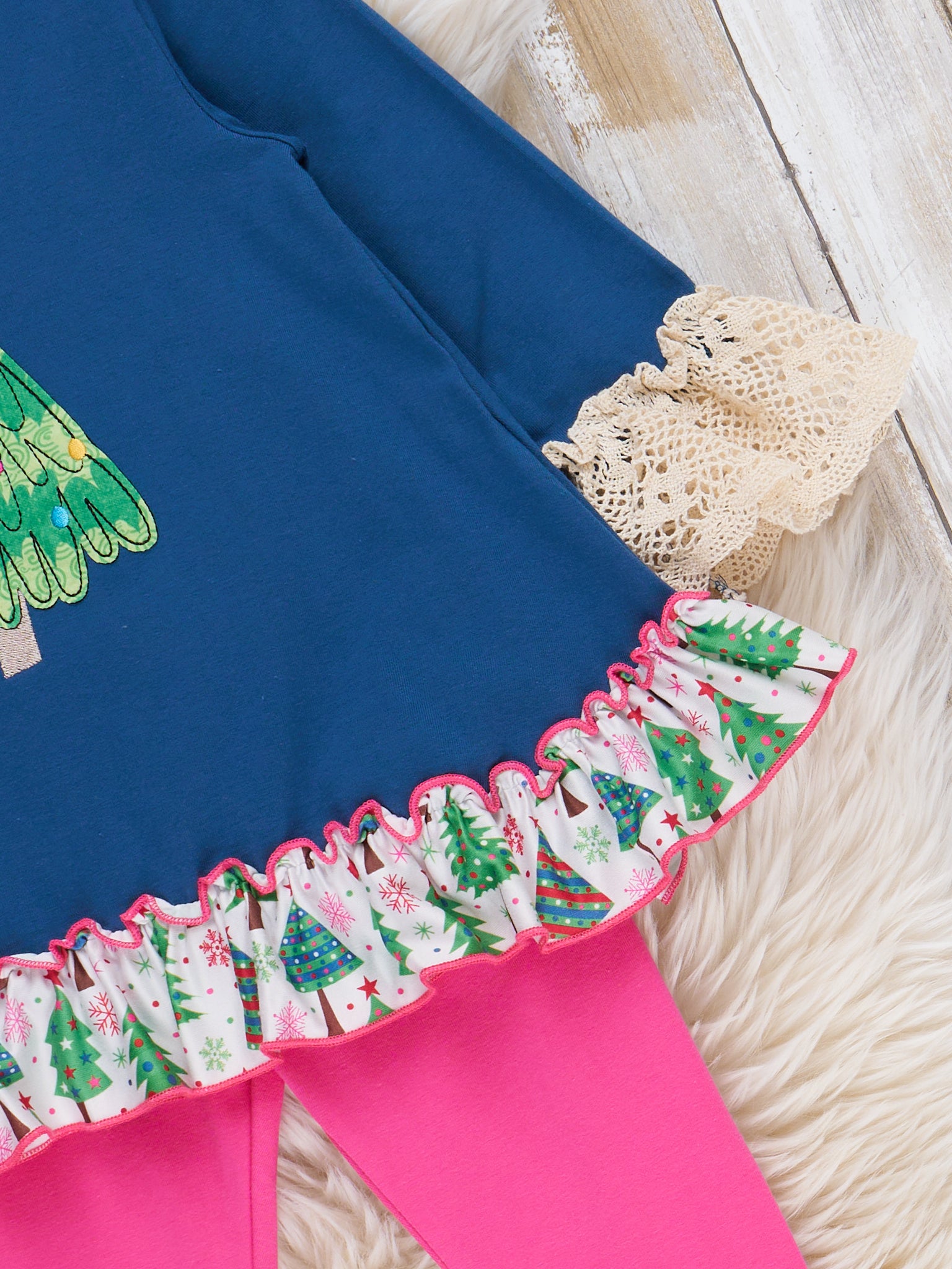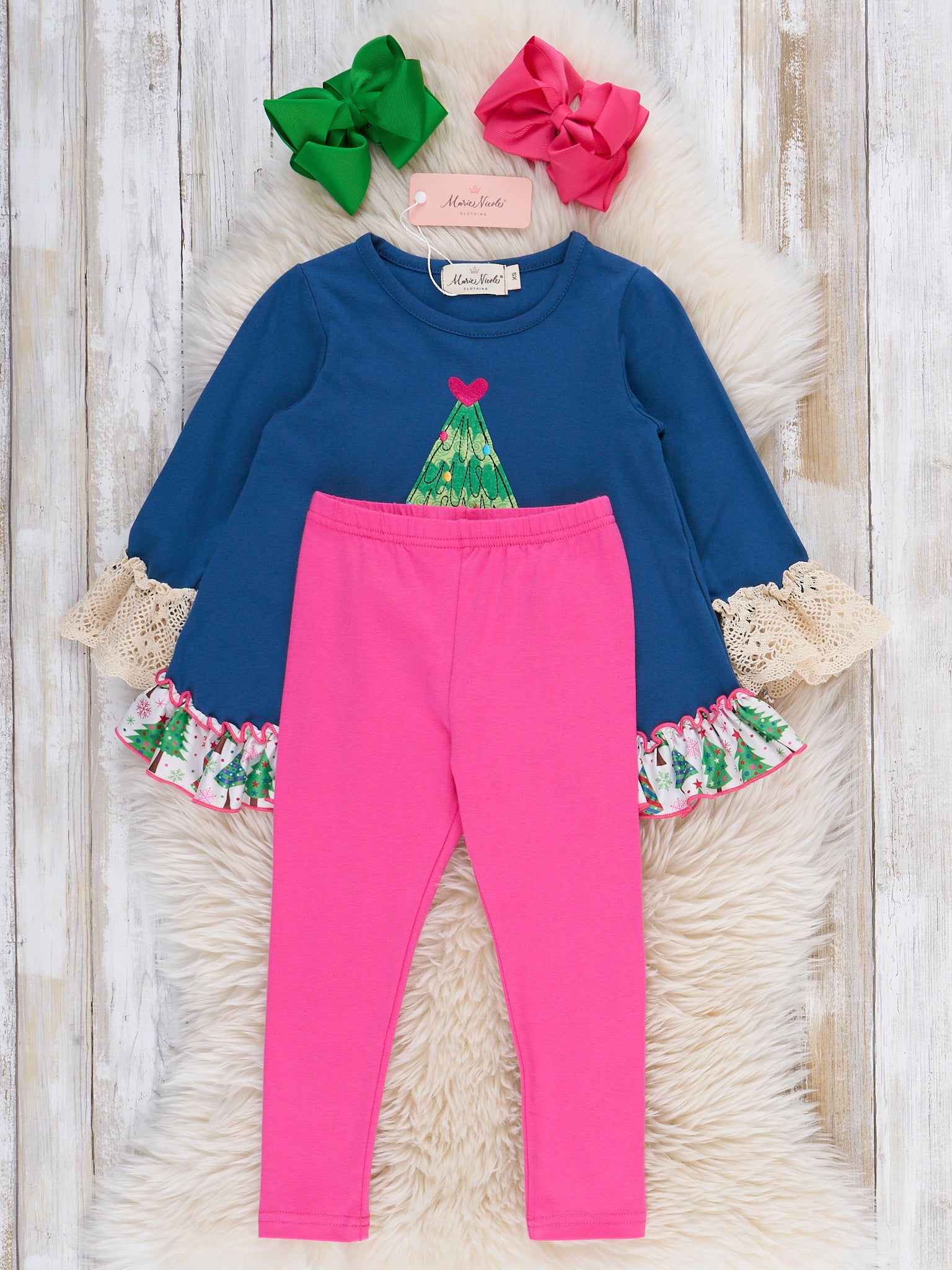 Get ready to sleigh the holiday season with our Around the Christmas Tree Ruffle Outfit! This adorable outfit features a navy top with an embroidered tree and a playful ruffle hem. Paired with leggings, your little girl will be the cutest present under the tree. Double the fun with the matching sister set!