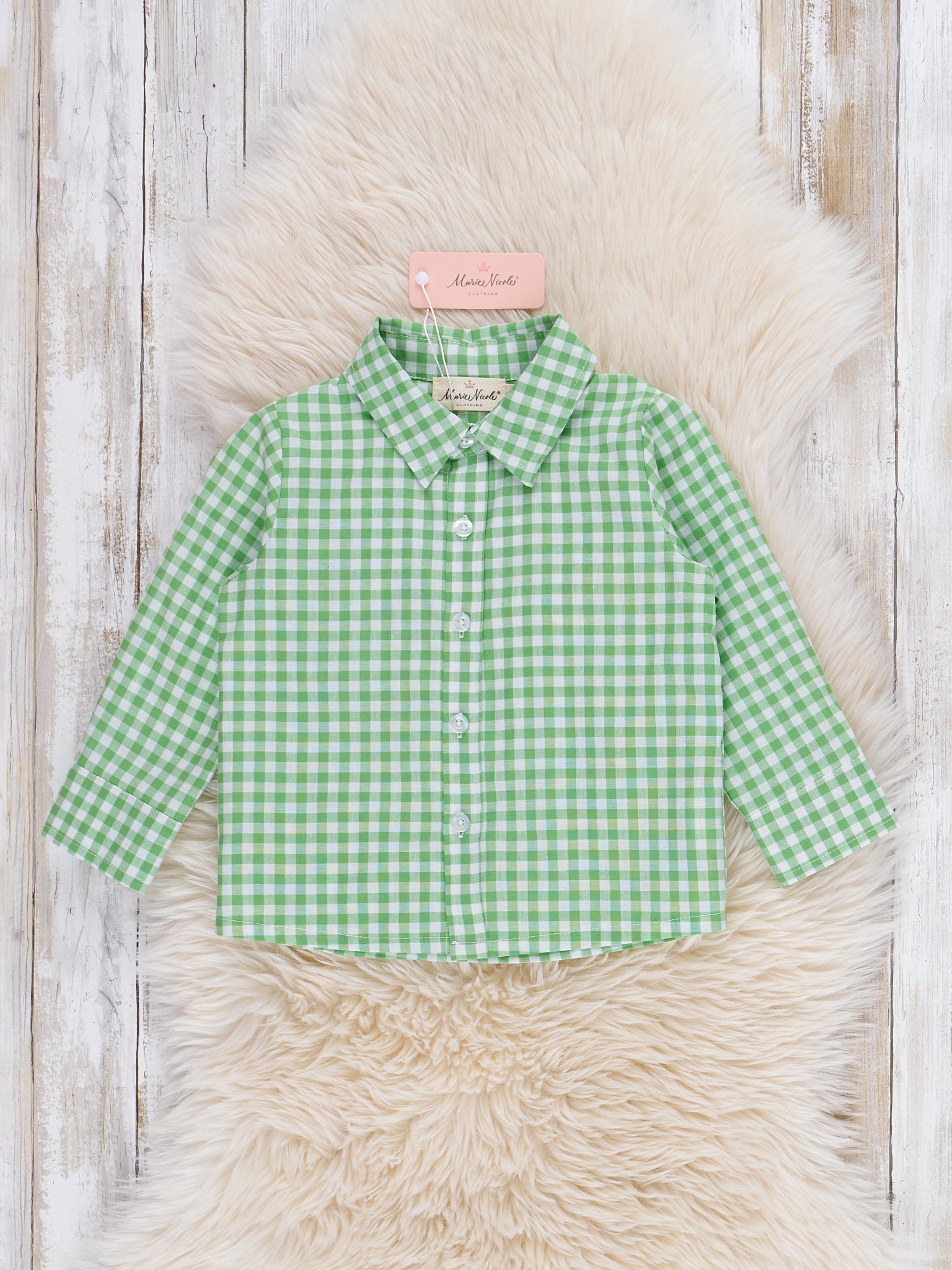 Gather the kiddos around the tree in this Evergreen Gingham Button-Up Shirt! This shirt boasts a charming kelly gingham print with functional buttons.