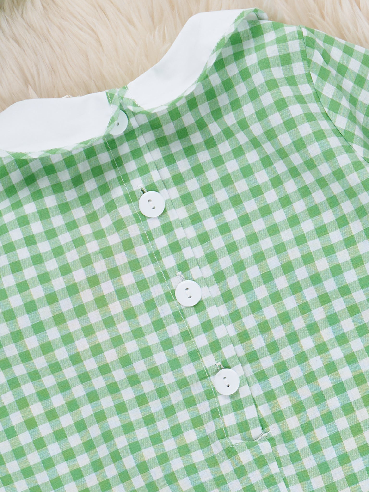 Gather the kiddos around the tree in this Evergreen Gingham Dress! This dress boasts a beautiful kelly green gingham print with peter pan collar and embroidered Christmas tree.