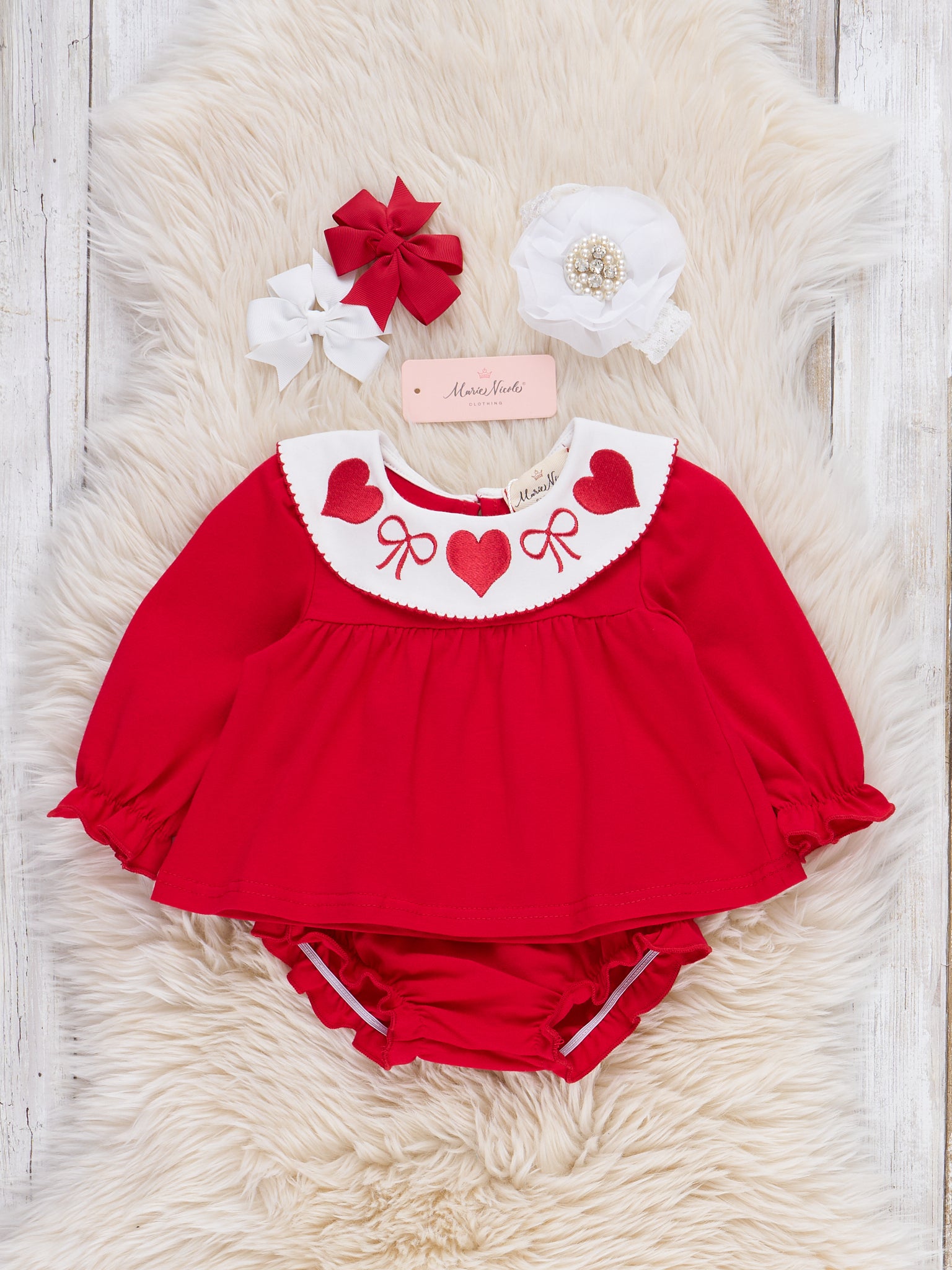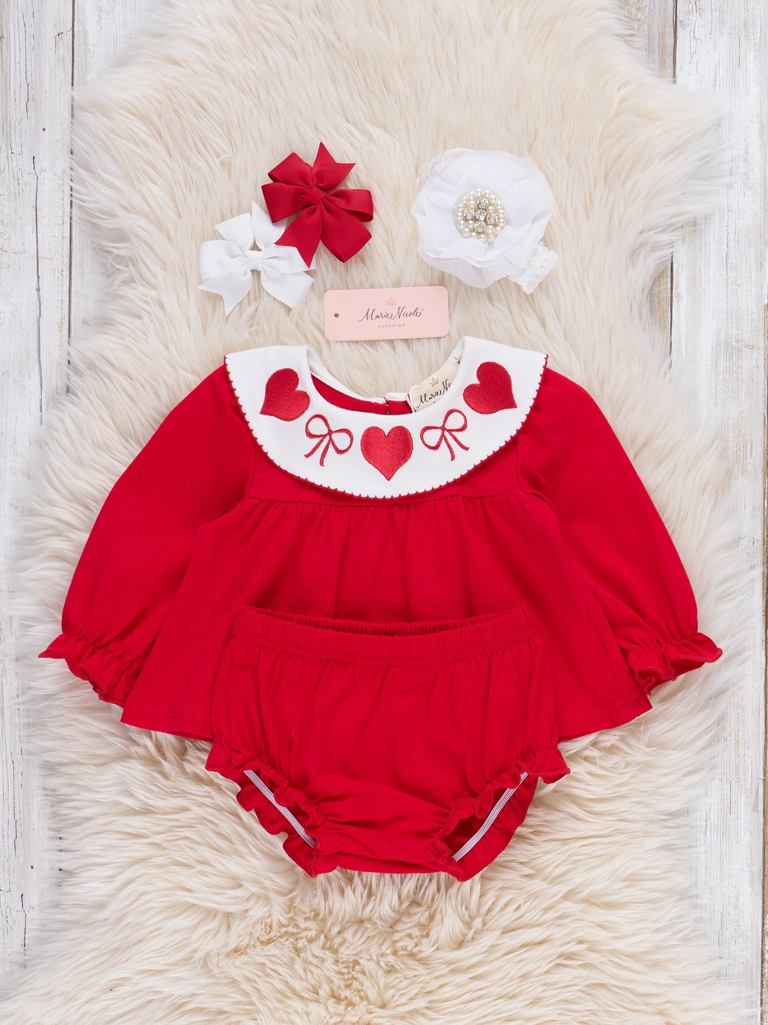 Ribbons & Hearts Embroidered Bloomers Outfit by Marie Nicole Clothing features a sweet gathered top with a statement collar accented by delicately embroidered hearts and bows. Coordinated bloomers complete the look, creating a classic, charming set that's perfect for special celebrations, memorable Valentine's Day photos, or everyday moments filled with love.