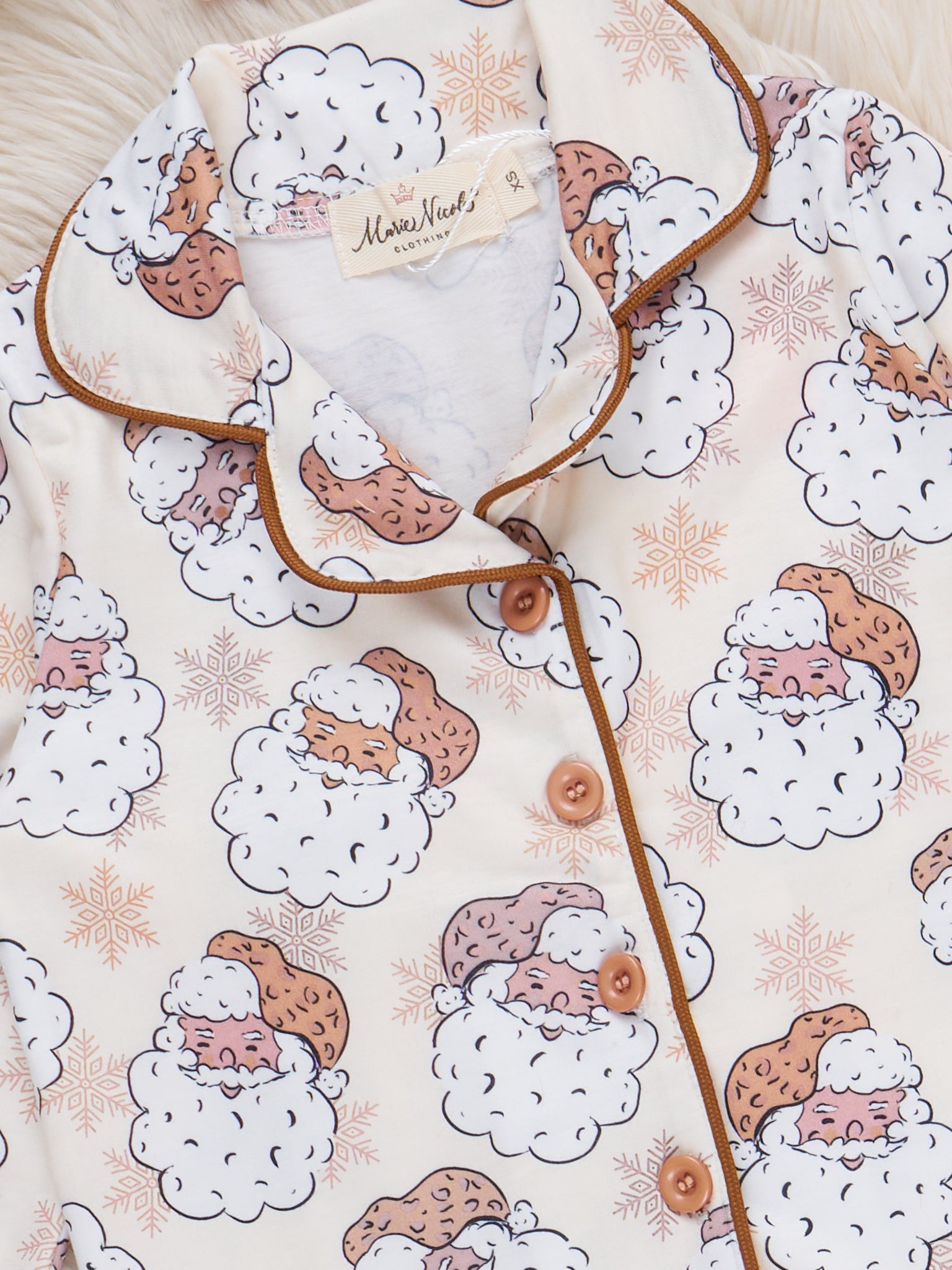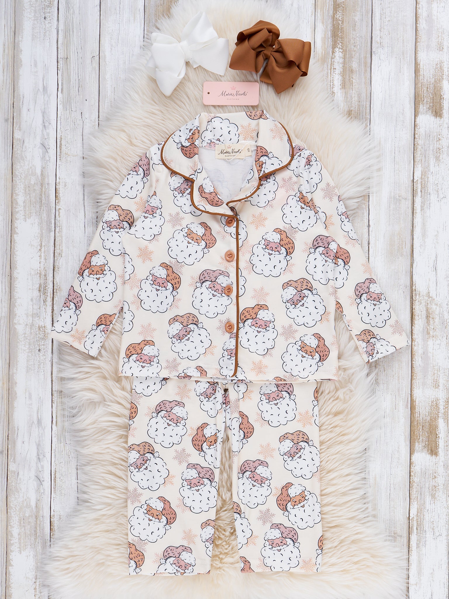 The Santa Snow Cloud Pajamas by Marie Nicole features a classic collared long-sleeve top paired with matching pants, both adorned in an adorable allover print of fluffy bearded Santas and snowflakes. Designed for holiday dreams and winter charm, this two-piece pajama set brings a cozy Christmas theme to bedtime.