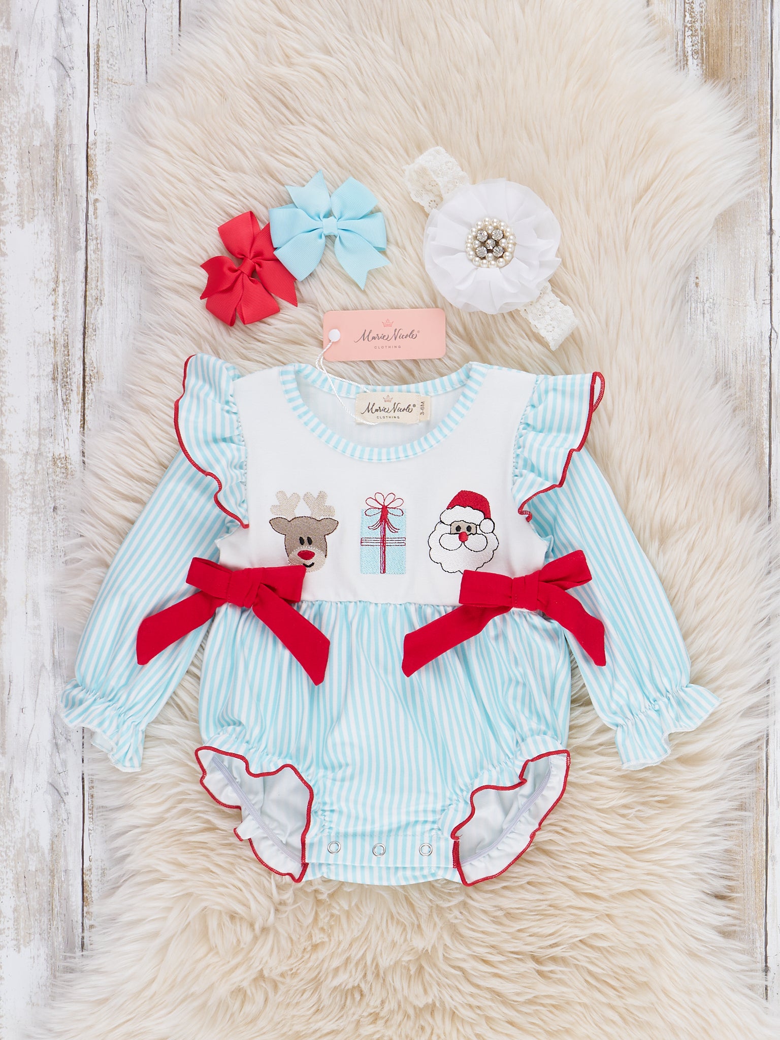 Get festive and coordinate with this Season's Greetings Embroidered Bubble Romper! This girls' ruffle bubble by Marie Nicole Clothing features light pin stripes, trim, and bow accents. Plus, the embroidered holiday motif adds a playful touch. Complete your family's holiday wardrobe with this adorable bubble.
