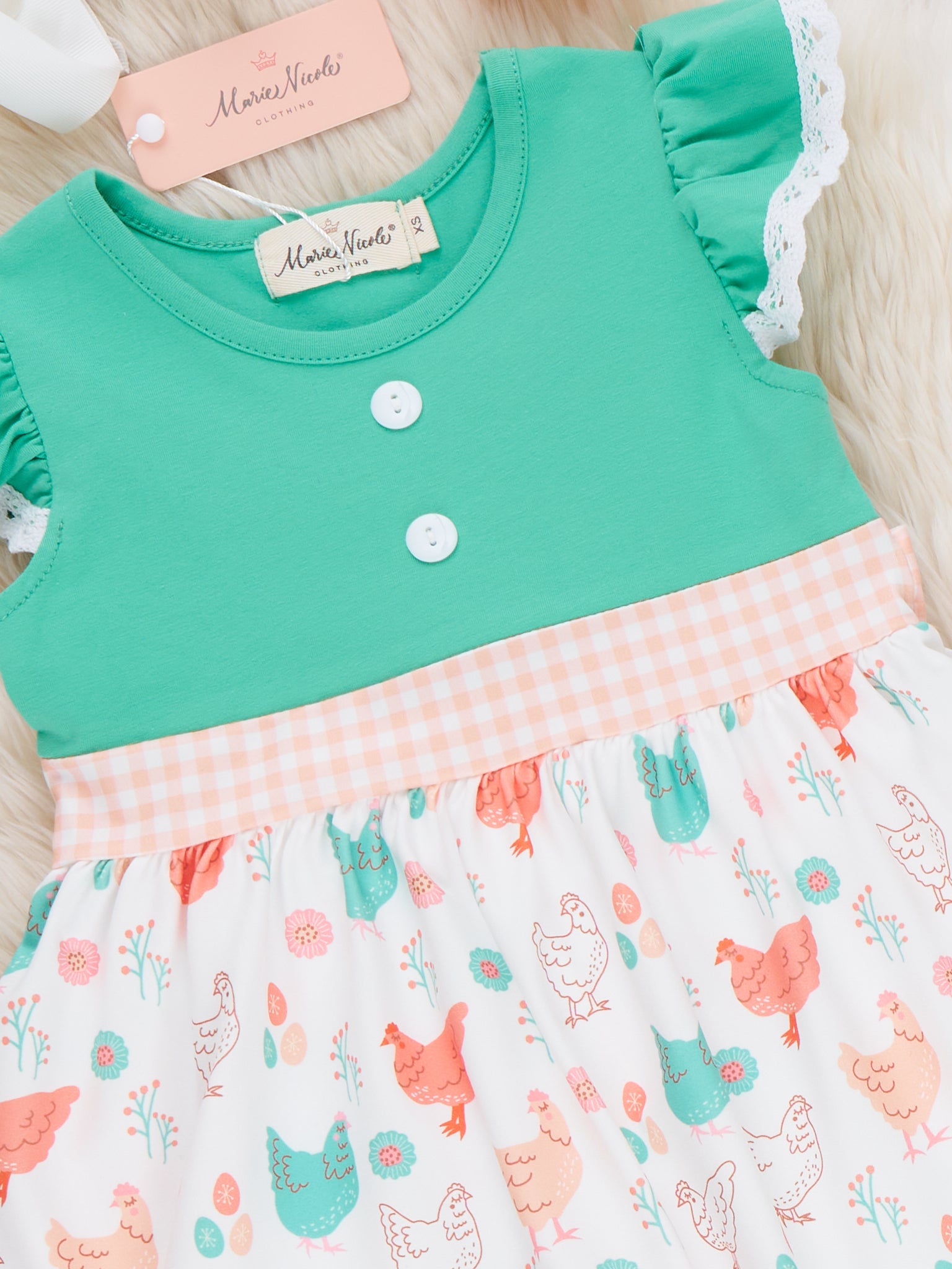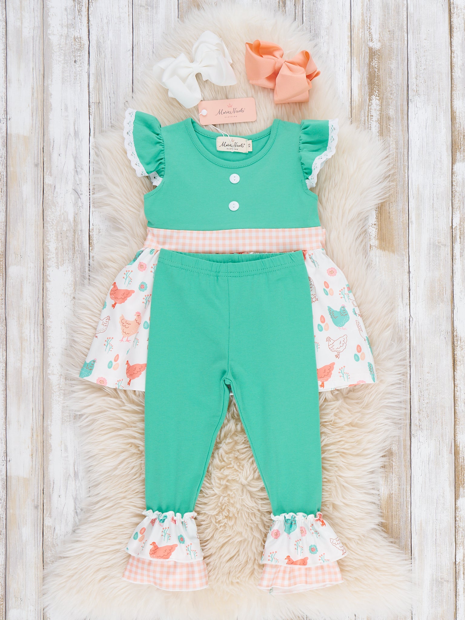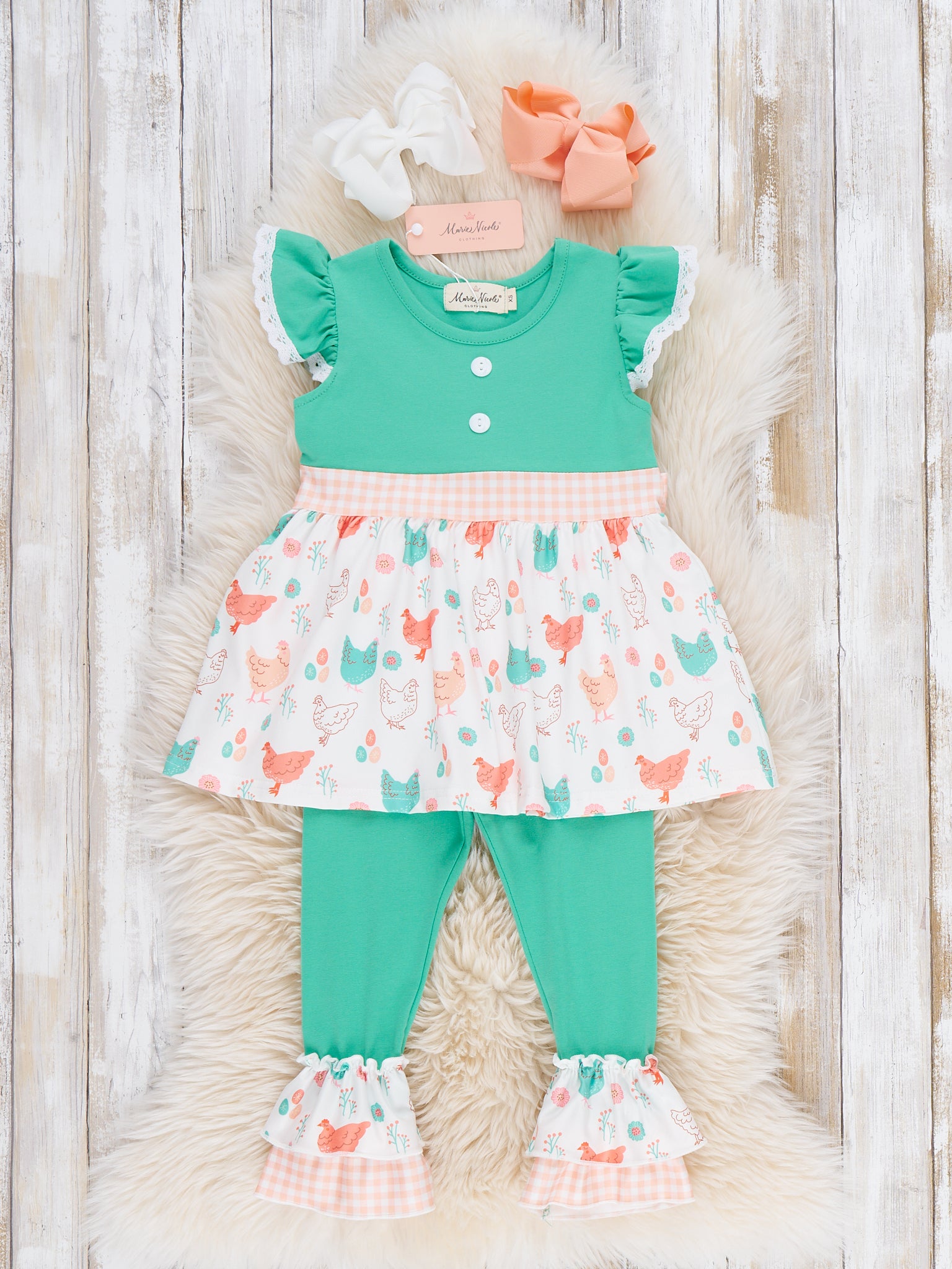 Springtime Coop Ruffle Outfit by Marie Nicole Clothing includes a flutter sleeve top with gingham sash and a skirt printed with cheerful hens and chicks, paired with ruffle-trim legging pants for a complete farm-inspired look. This playful, comfortable set is perfect for spring activities, farm visits, or everyday fun. Functional ties and soft, stretchy fabric ensure easy movement and charming style all day.
