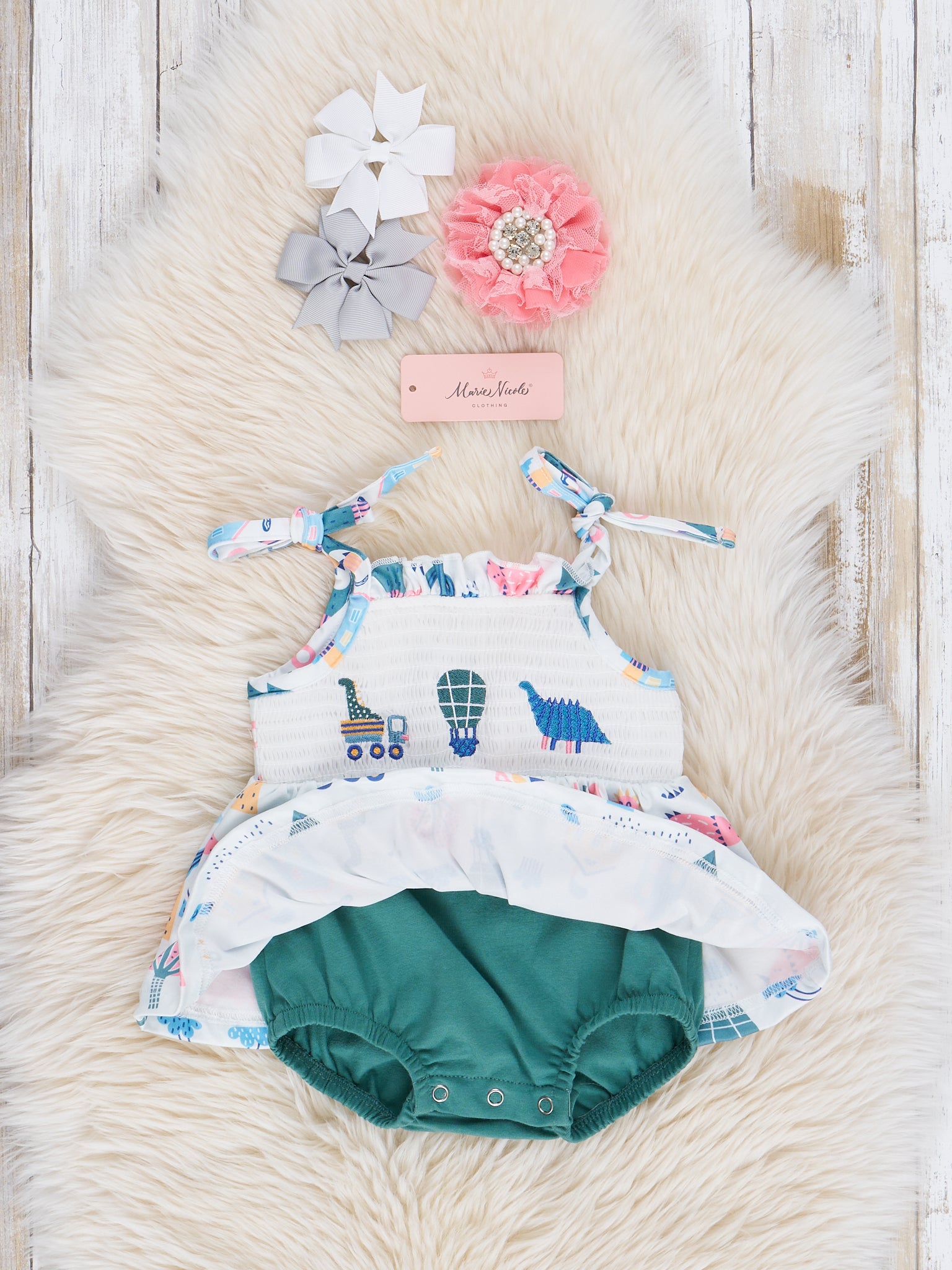 Hunter Green Stripes Smocked Dinosaur Friends Romper