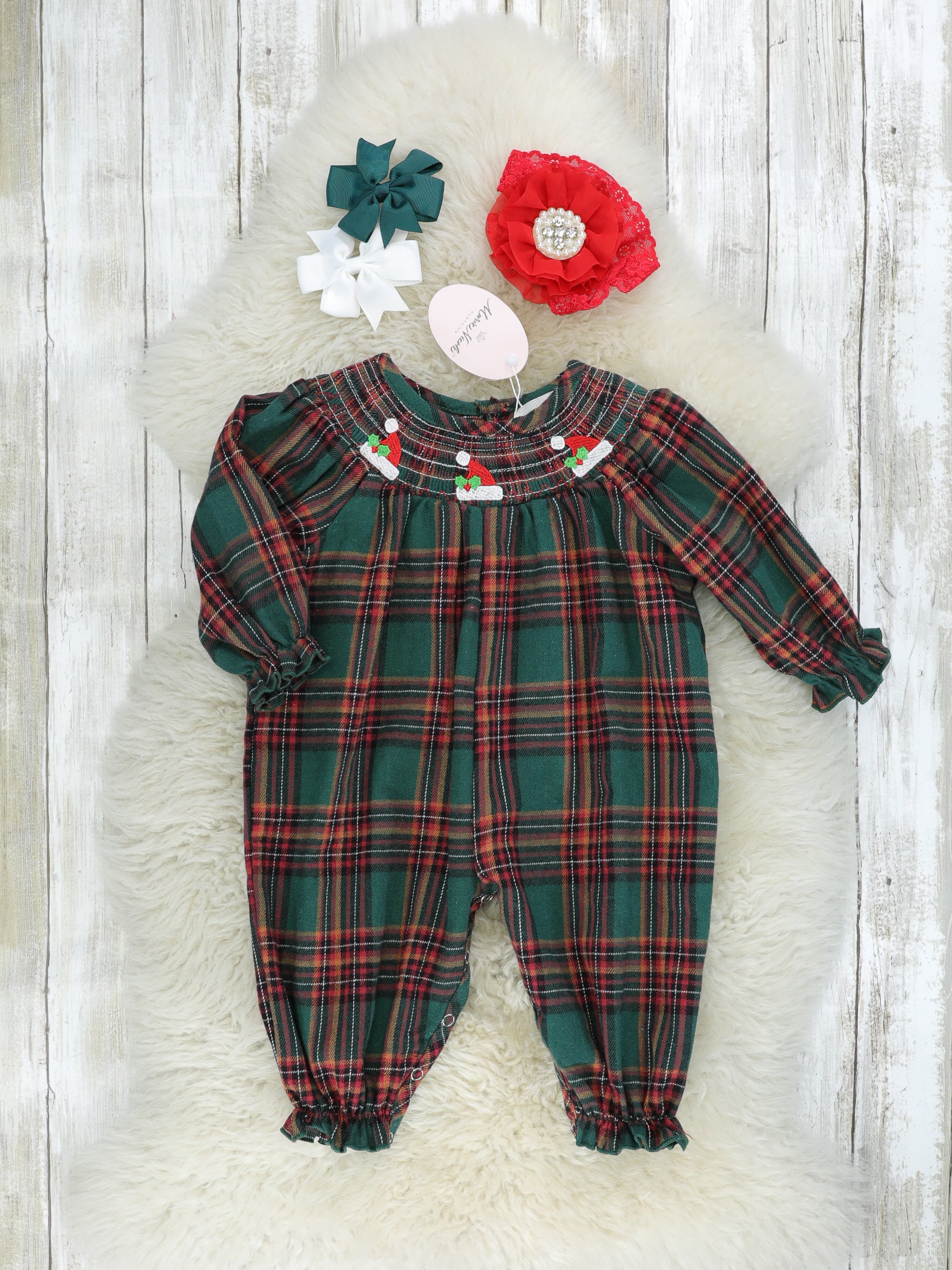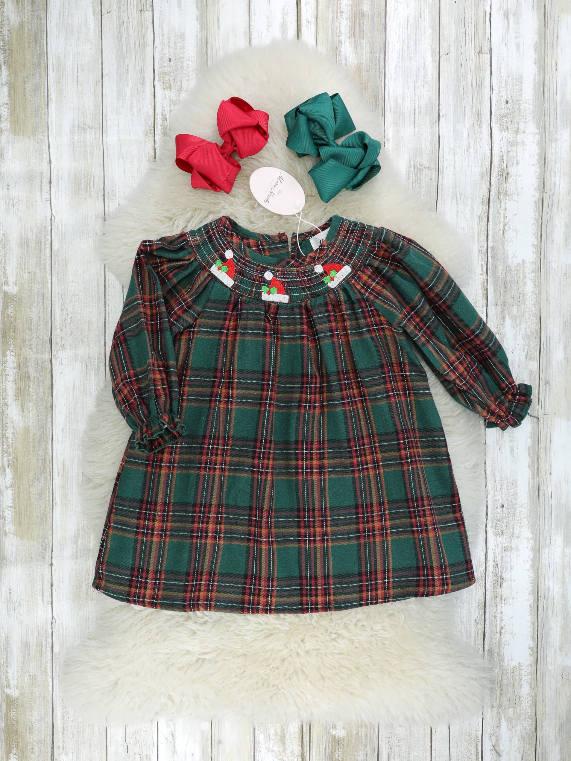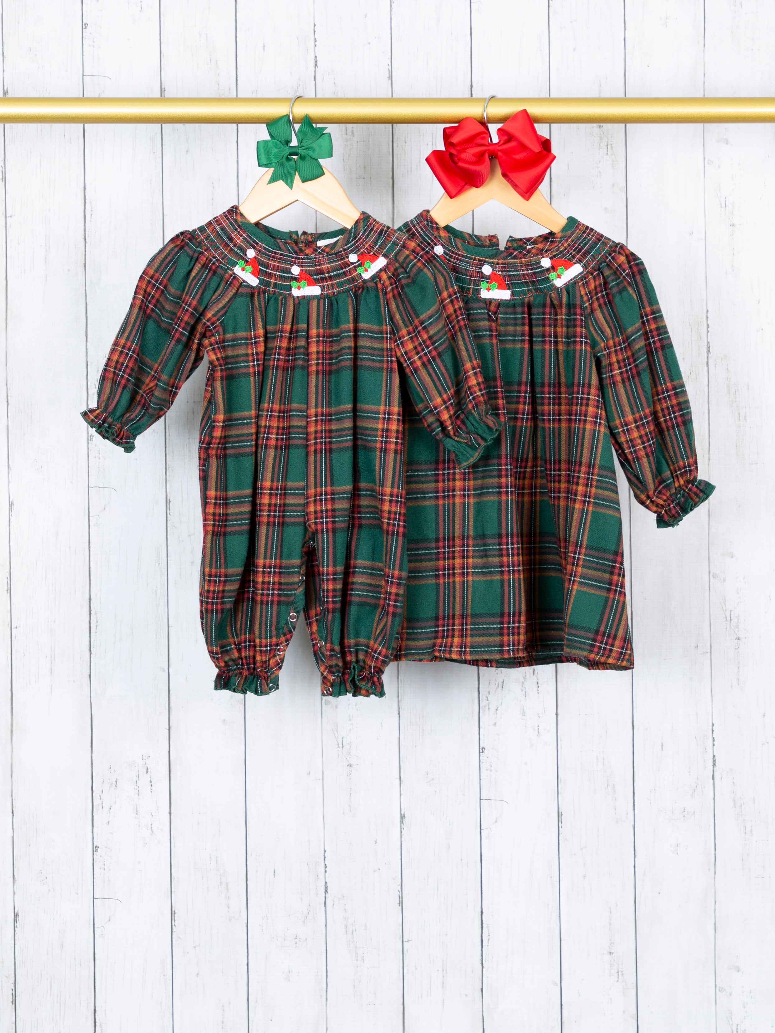 Hunter Green Smocked Plaid Santa Hat Sister Set