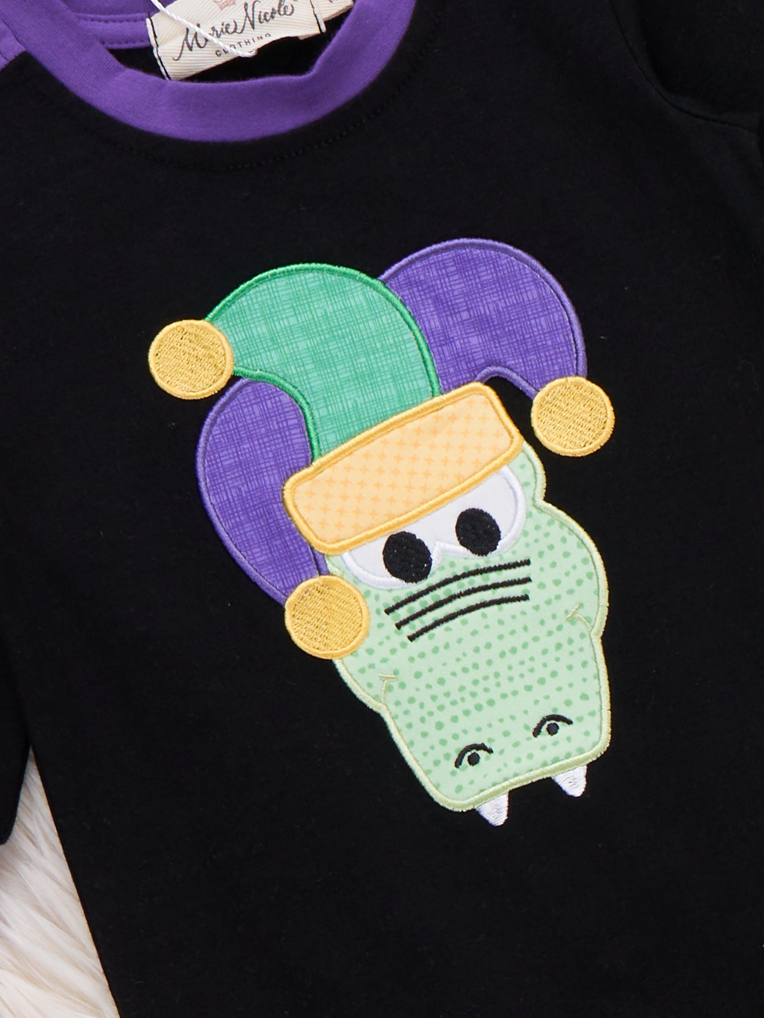 Step into festive fun with the Little Jester Alligator Embroidered Romper by Marie Nicole Clothing. This playful romper features an adorable alligator in a classic jester hat, accented with vibrant cuffs for a burst of Mardi Gras cheer. Designed for comfort and joy-filled adventures, it’s perfect for little ones making the most of every carnival celebration and costume moment.