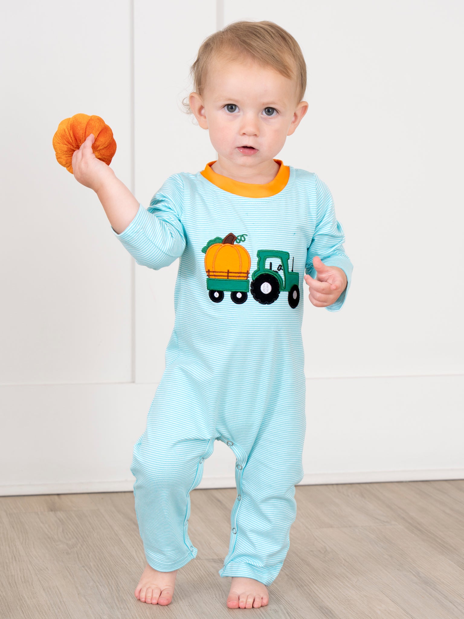 Light Blue Stripes Pumpkin Tractor Romper