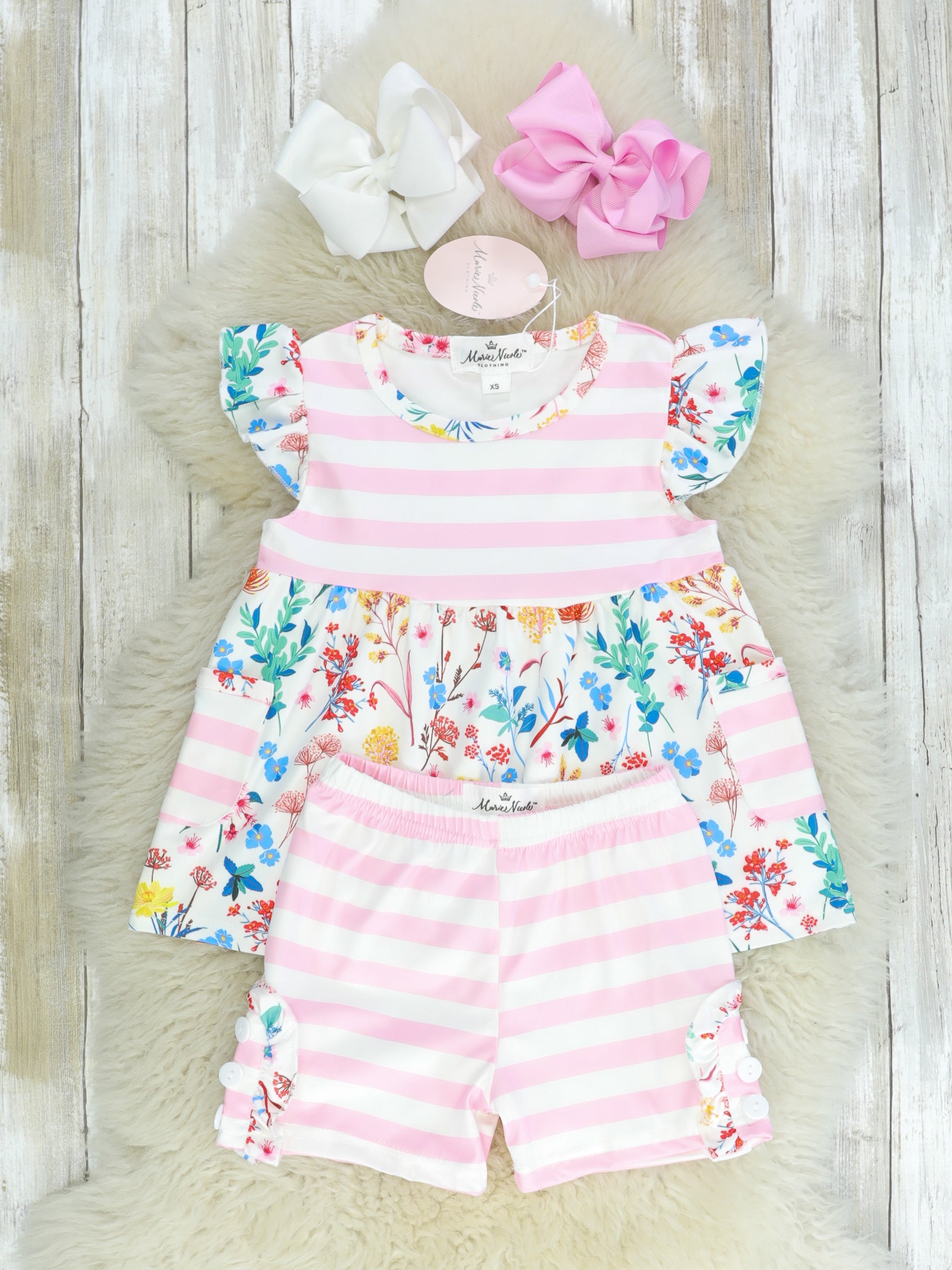 Light Pink Striped Floral Ruffle Shorts Outfit