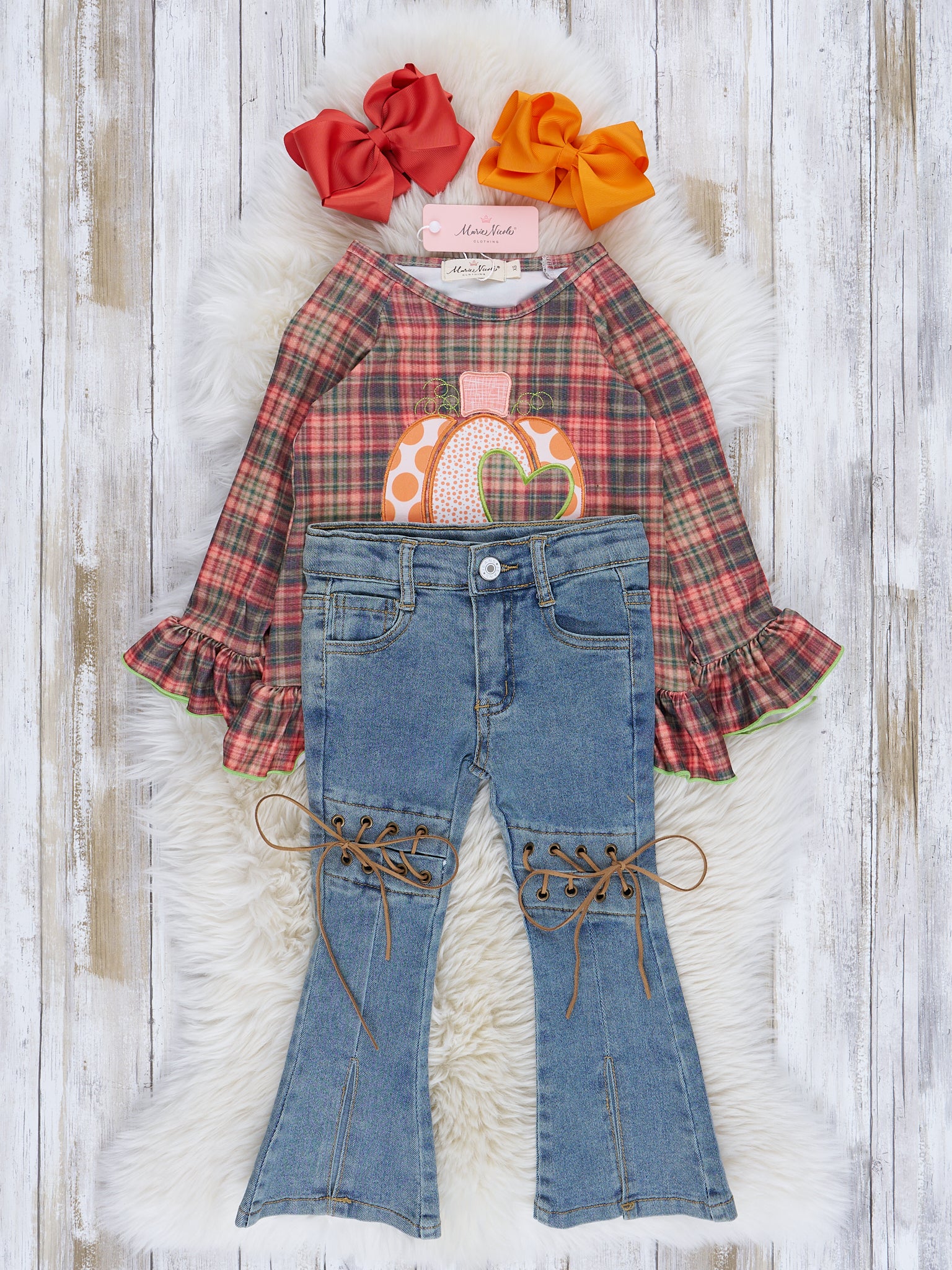 Lime & Brown Plaid Embroidered Pumpkin Outfit w/ Denim