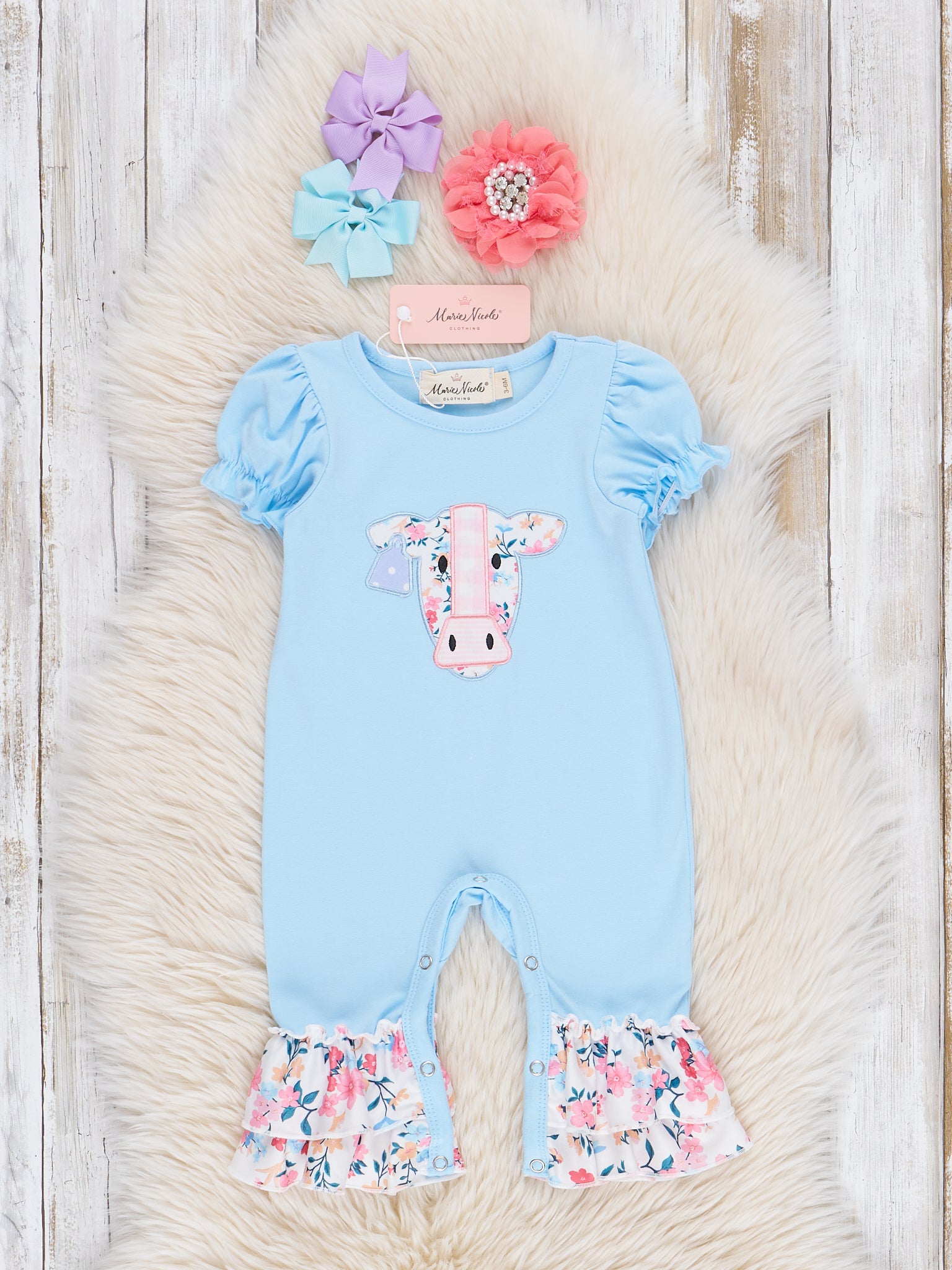 Soft Blue & Orange Gingham Patch Ruffle Romper