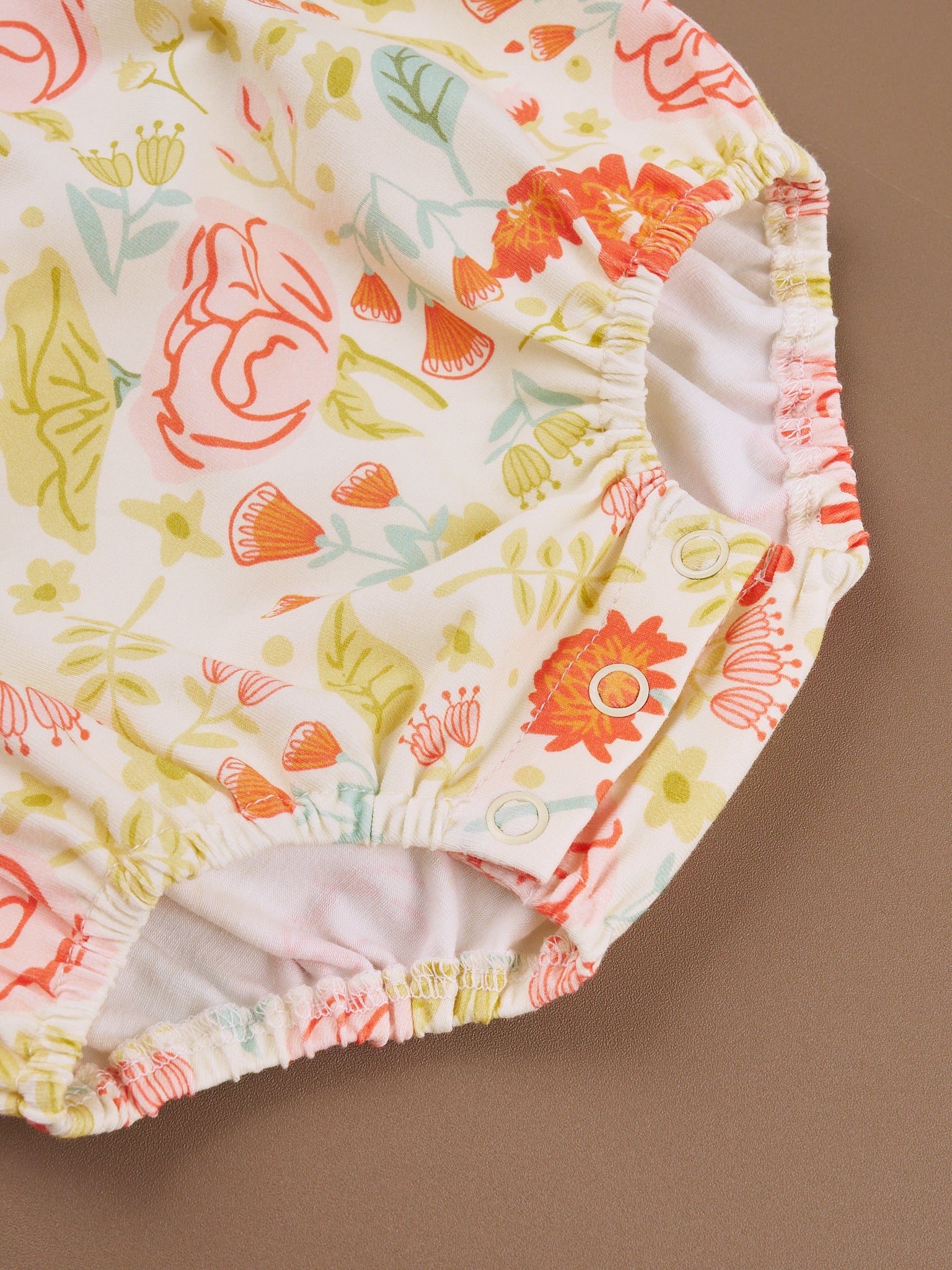 This bubble features the Lottie Dots print with polka dot printed bib collar, and button detail. The perfectly matched orange ric-rac trim along the collar and flutter sleeves are a delight to this adorable bubble.