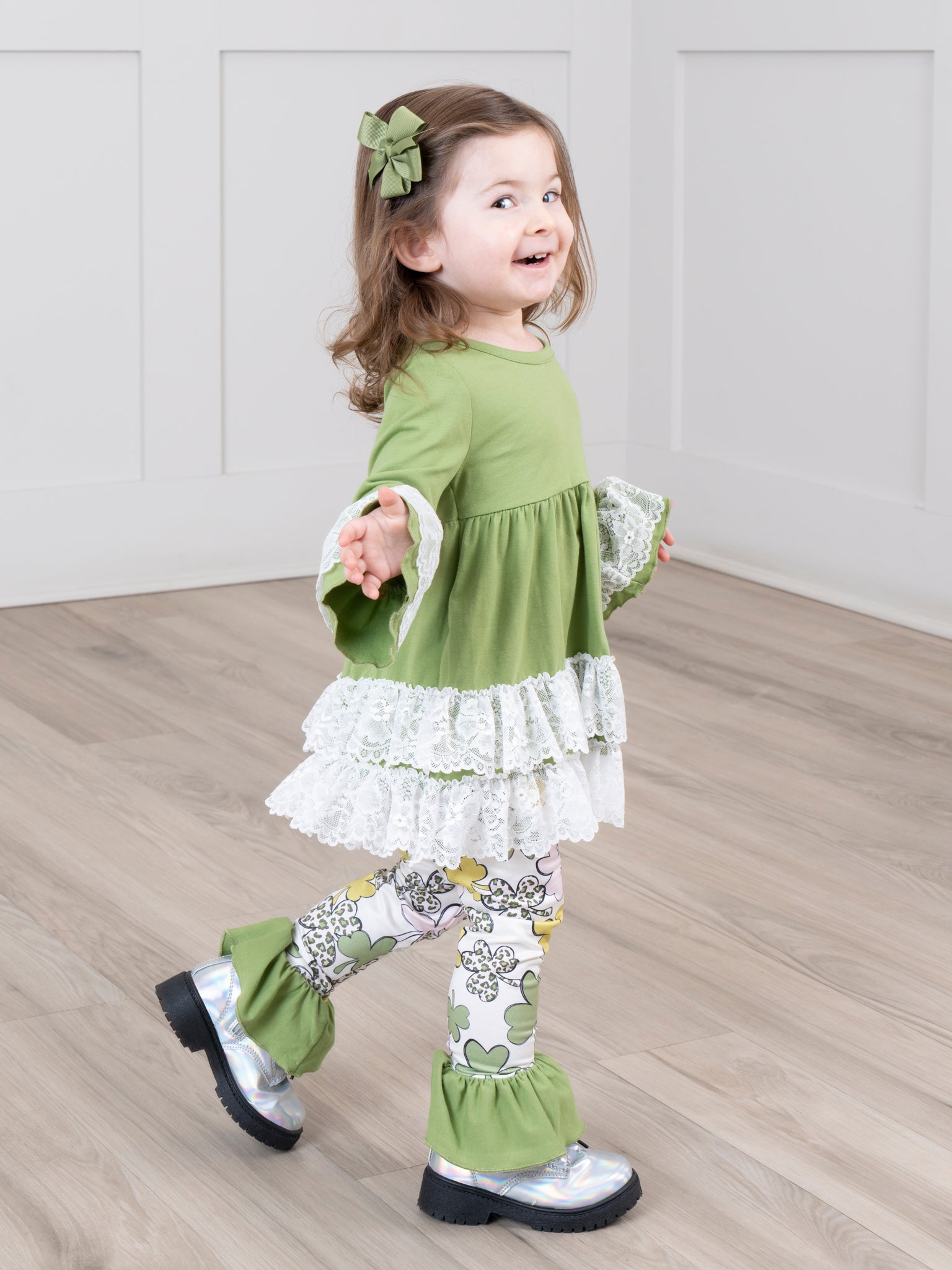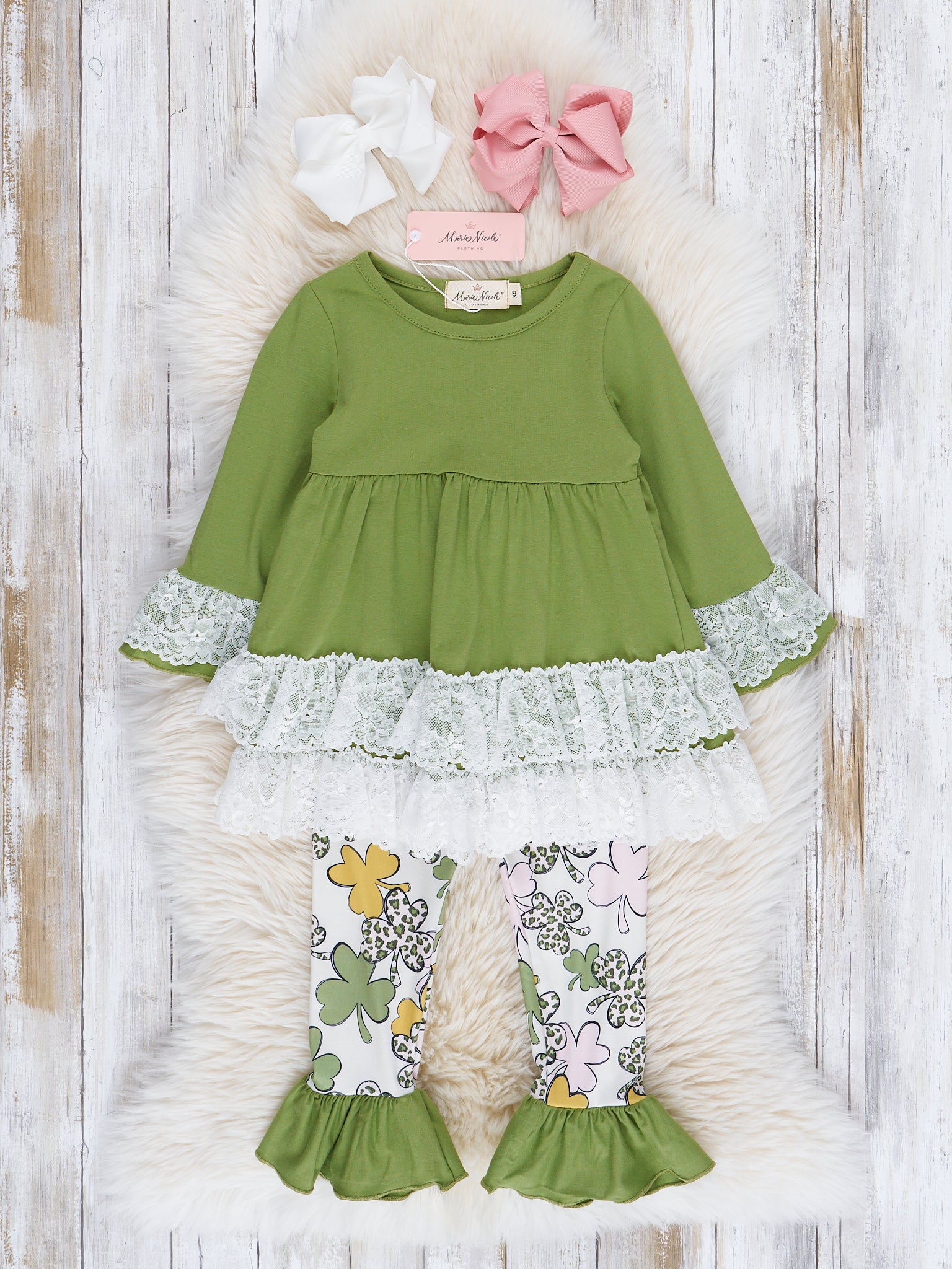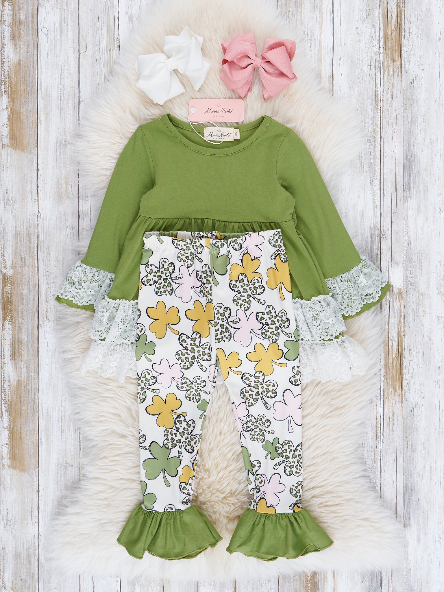 Lucky Pink & Green Clovers Lacy Ruffle Outfit