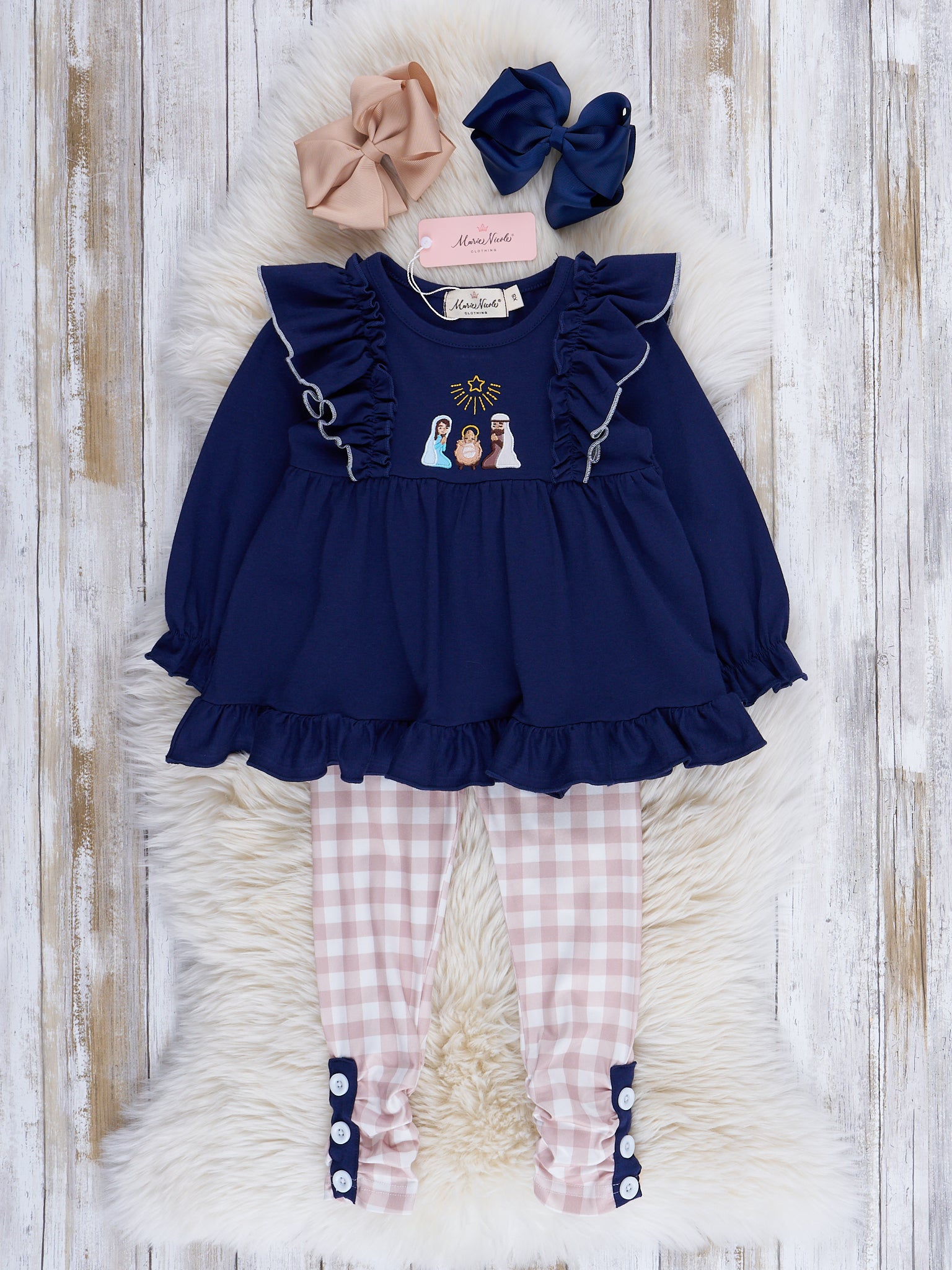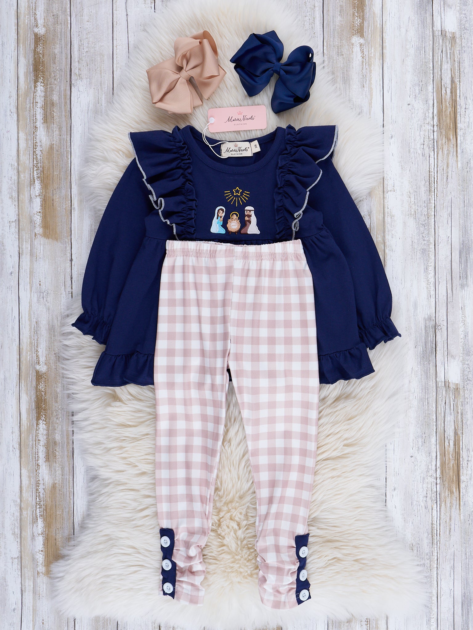 Midnight Blue & Tan Gingham Embroidered Nativity Ruffle Outfit