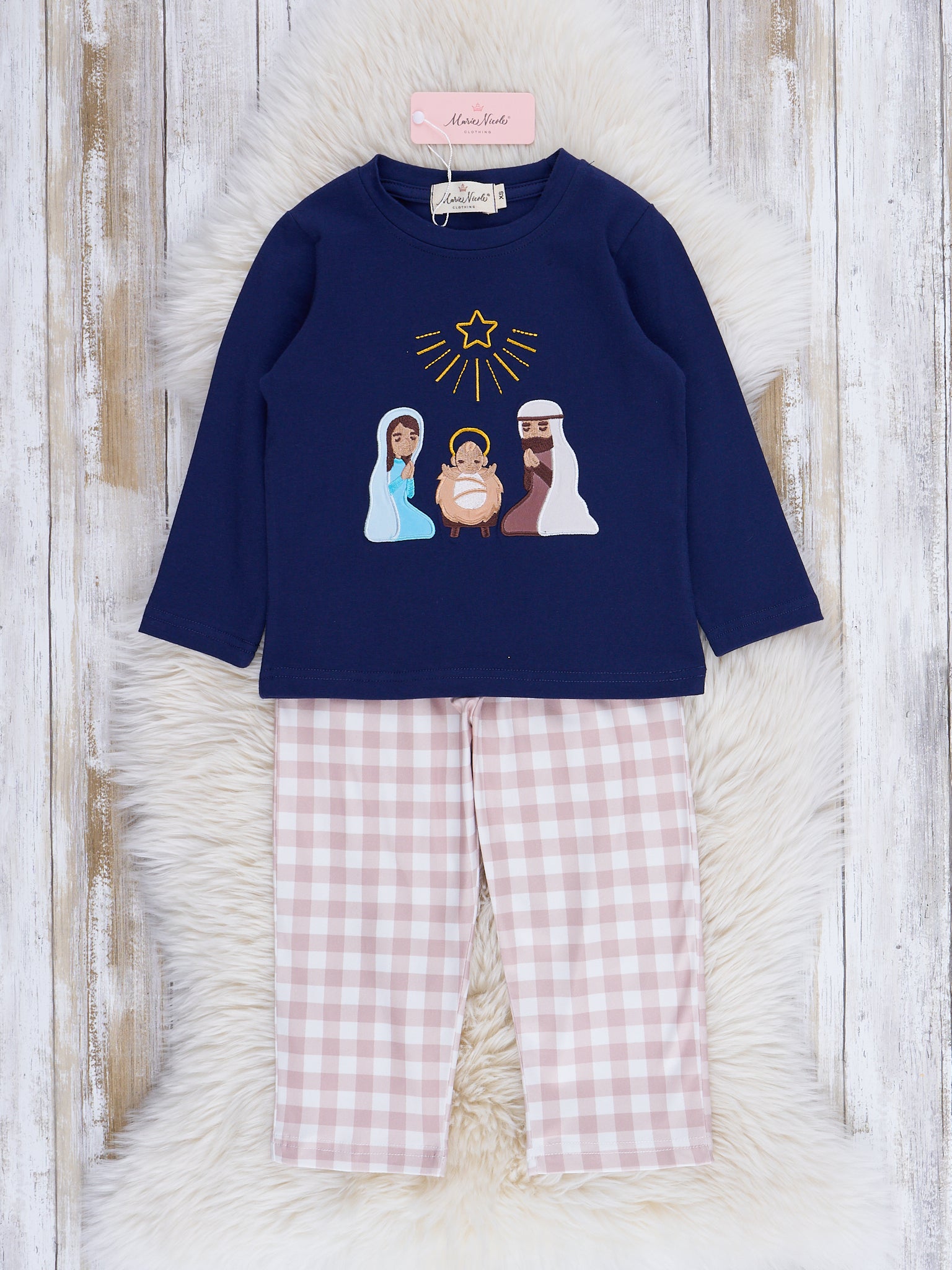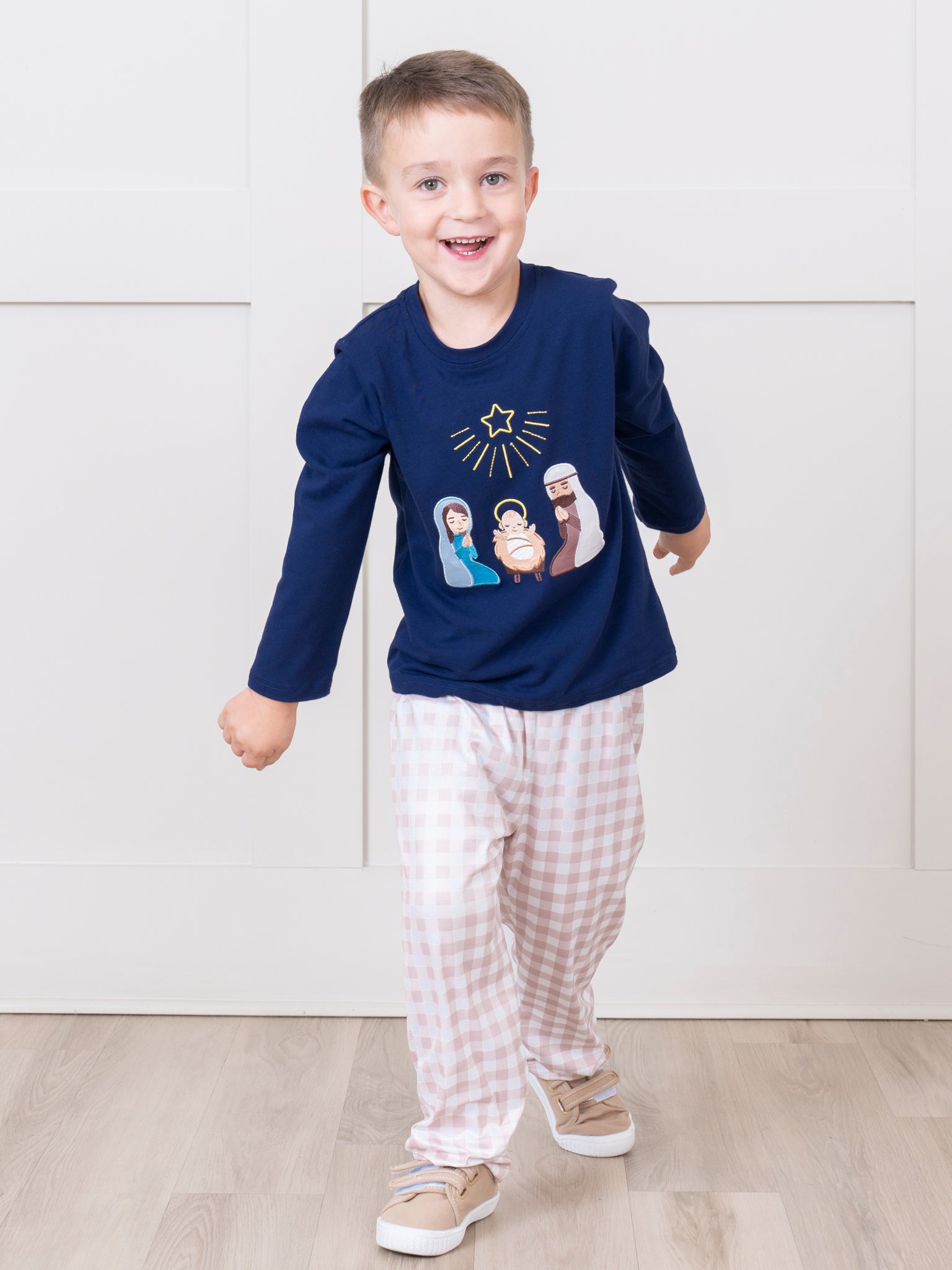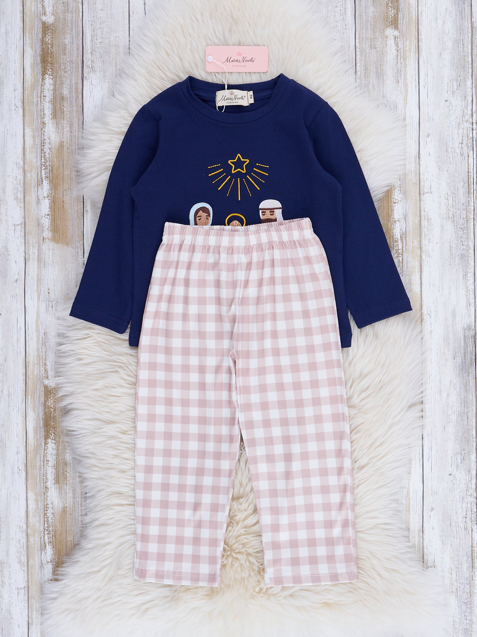 Midnight Blue & Tan Gingham Embroidered Nativity Sibling Set
