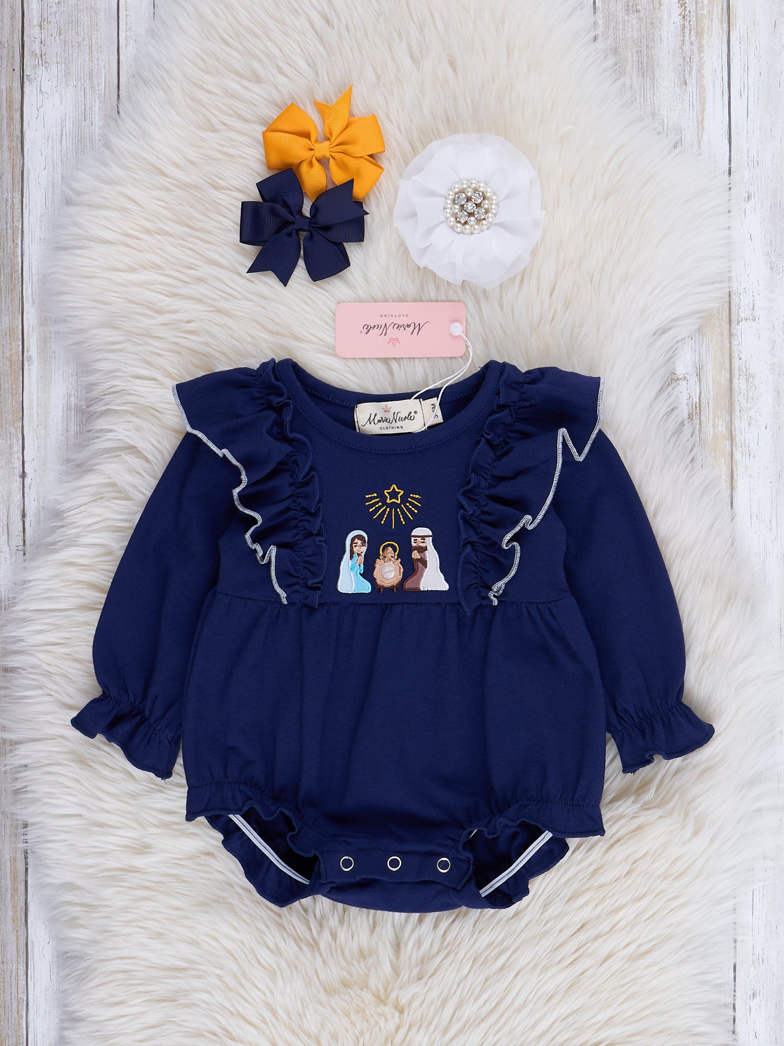 Midnight Blue & Tan Gingham Embroidered Nativity Ruffle Bubble