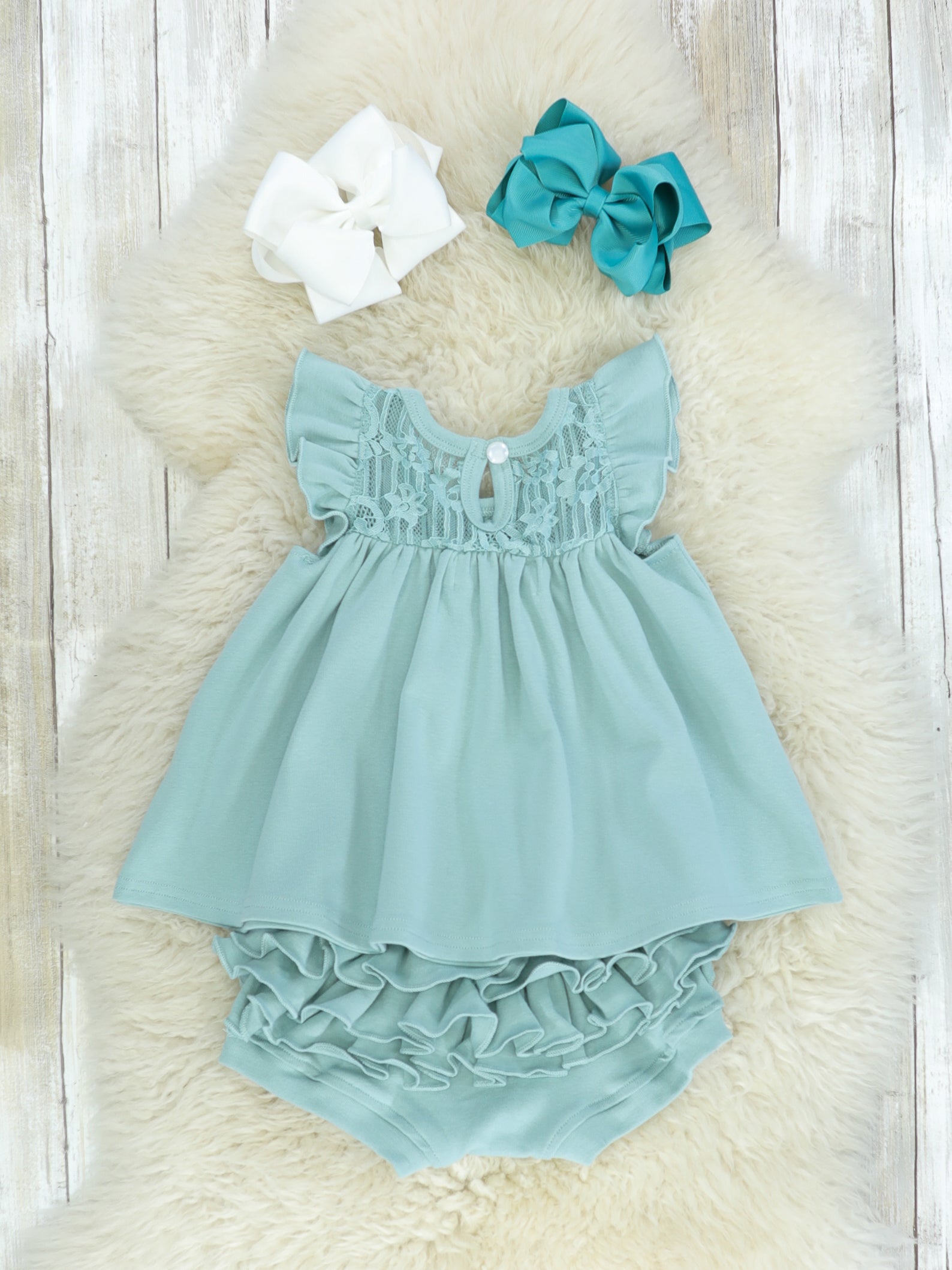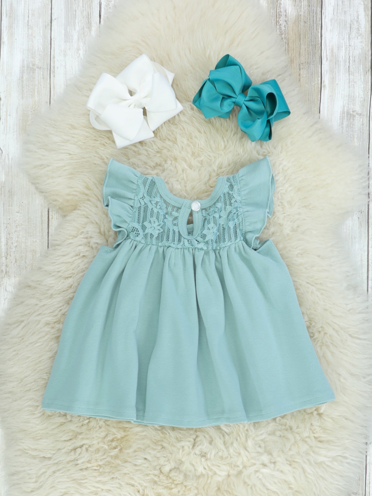 MNC's lace flutter sleeve top in nile blue! This swing style top features the prettiest lace details and a functional button on the nape of the neck for easy on and off.