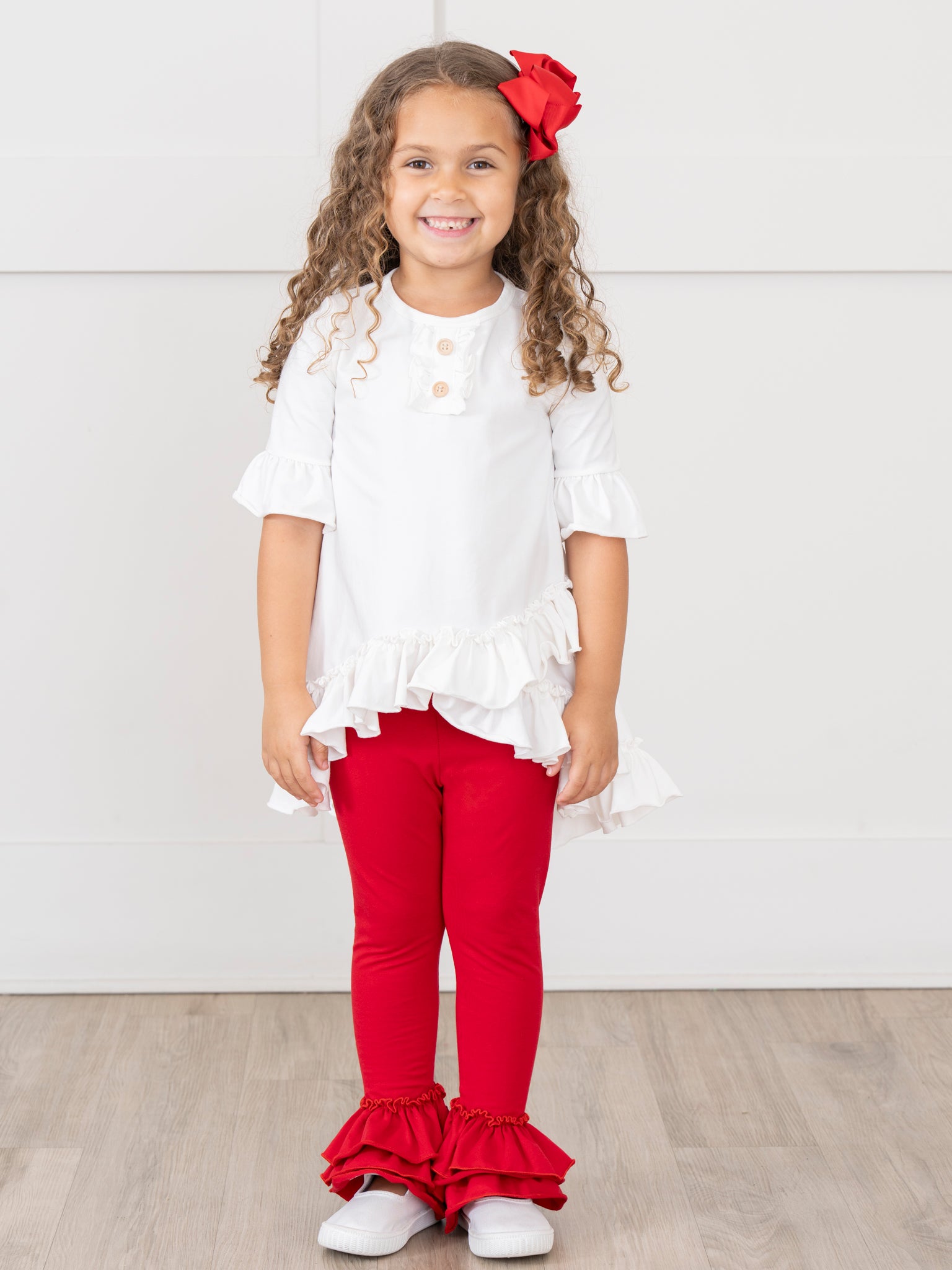 The Cotton Bell Ruffle Leggings in Red are the perfect closet staple with a brilliant pop of color. This pair of leggings from Marie Nicole Clothing features tiered ruffle bottoms. Crafted with soft, comfortable cotton, your girl can look and feel great all day, and you can match them with any of our MNC-exclusive swing tops and tunics. Shop all MNCxBASICS here!