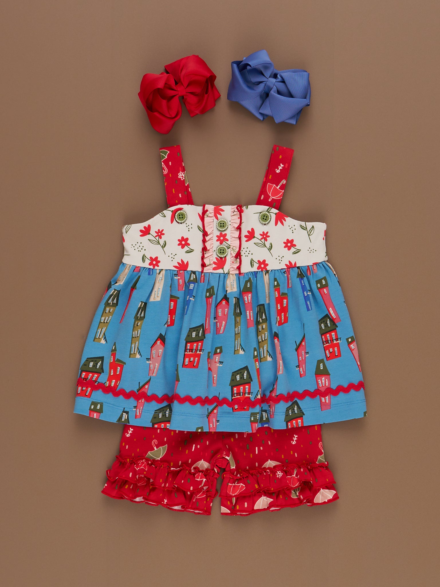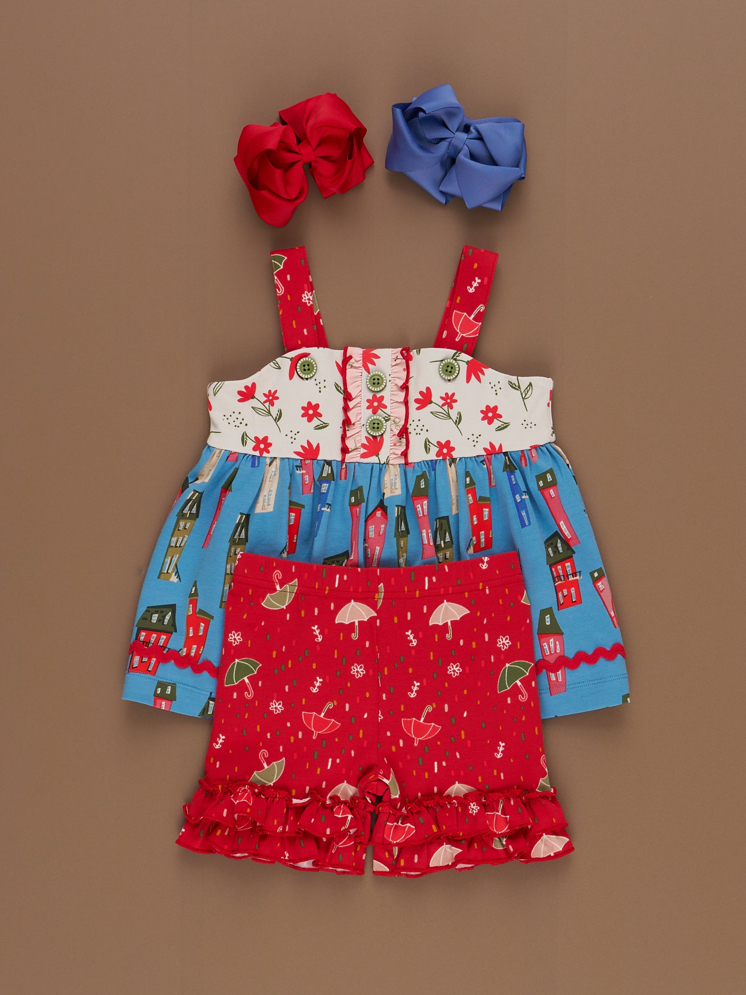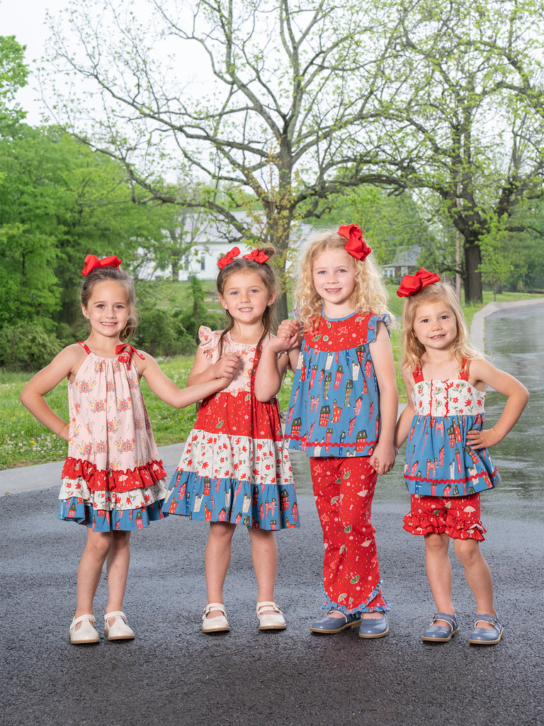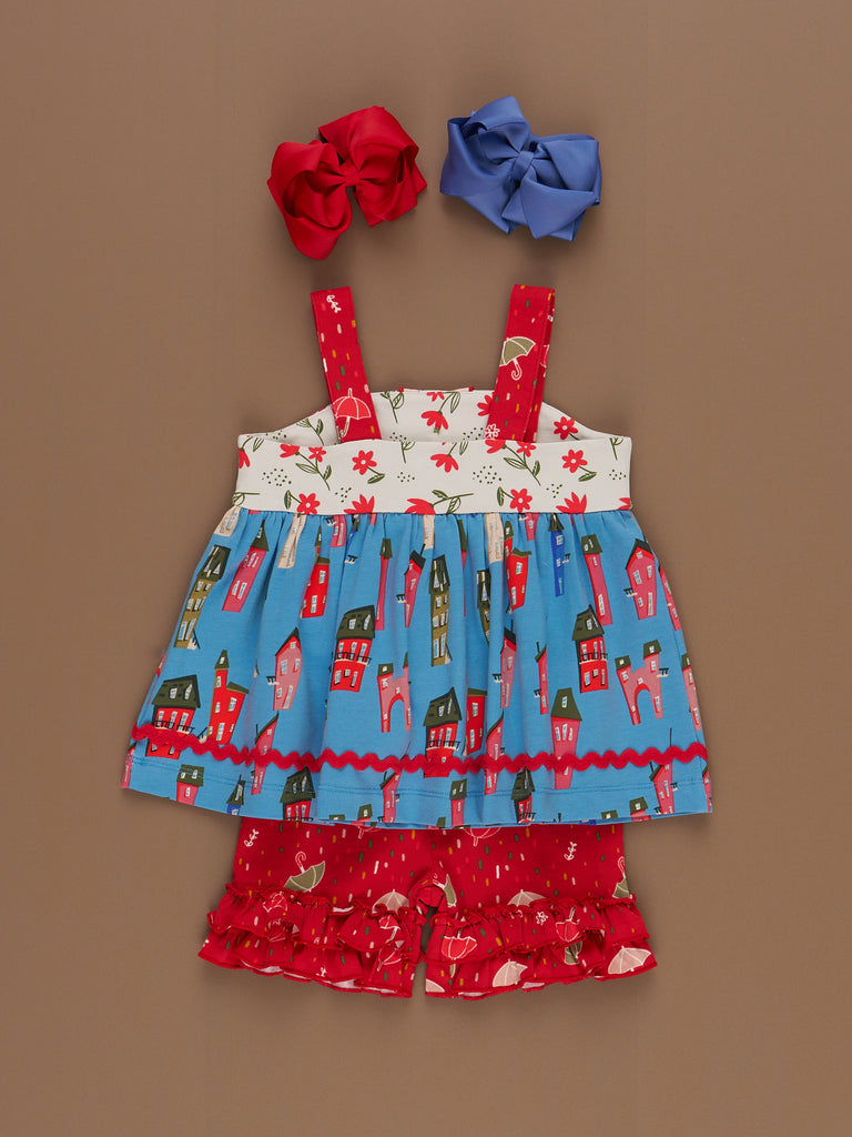 Sweeten up her summer style with our Storybook Lane Cupcake Ruffle Outfit. This girls set from our MNC Exclusive Storybook Lane Collection features a strappy swing top with dainty button details, floral accents, and our signature storybook village print. The coordinating ruffle shorts are covered in cheerful umbrellas and finished with double layers of frilly fun. Perfect for warm-weather adventures, birthday parties, and making magical memories. Sister sets never looked so sweet!