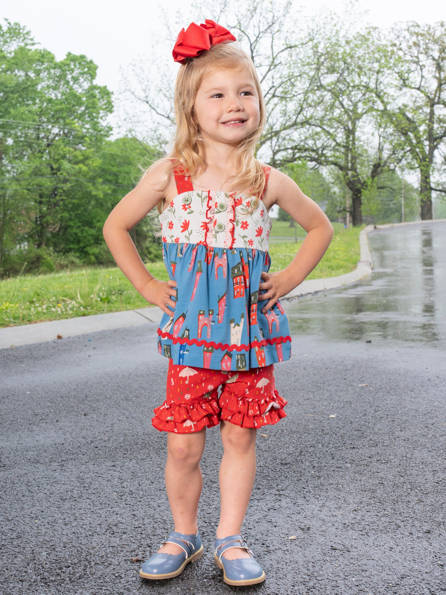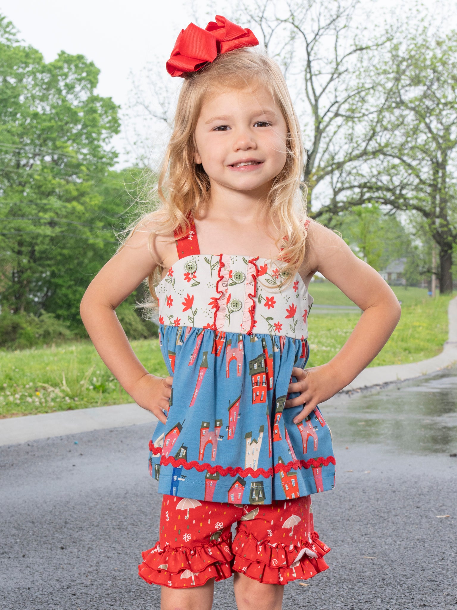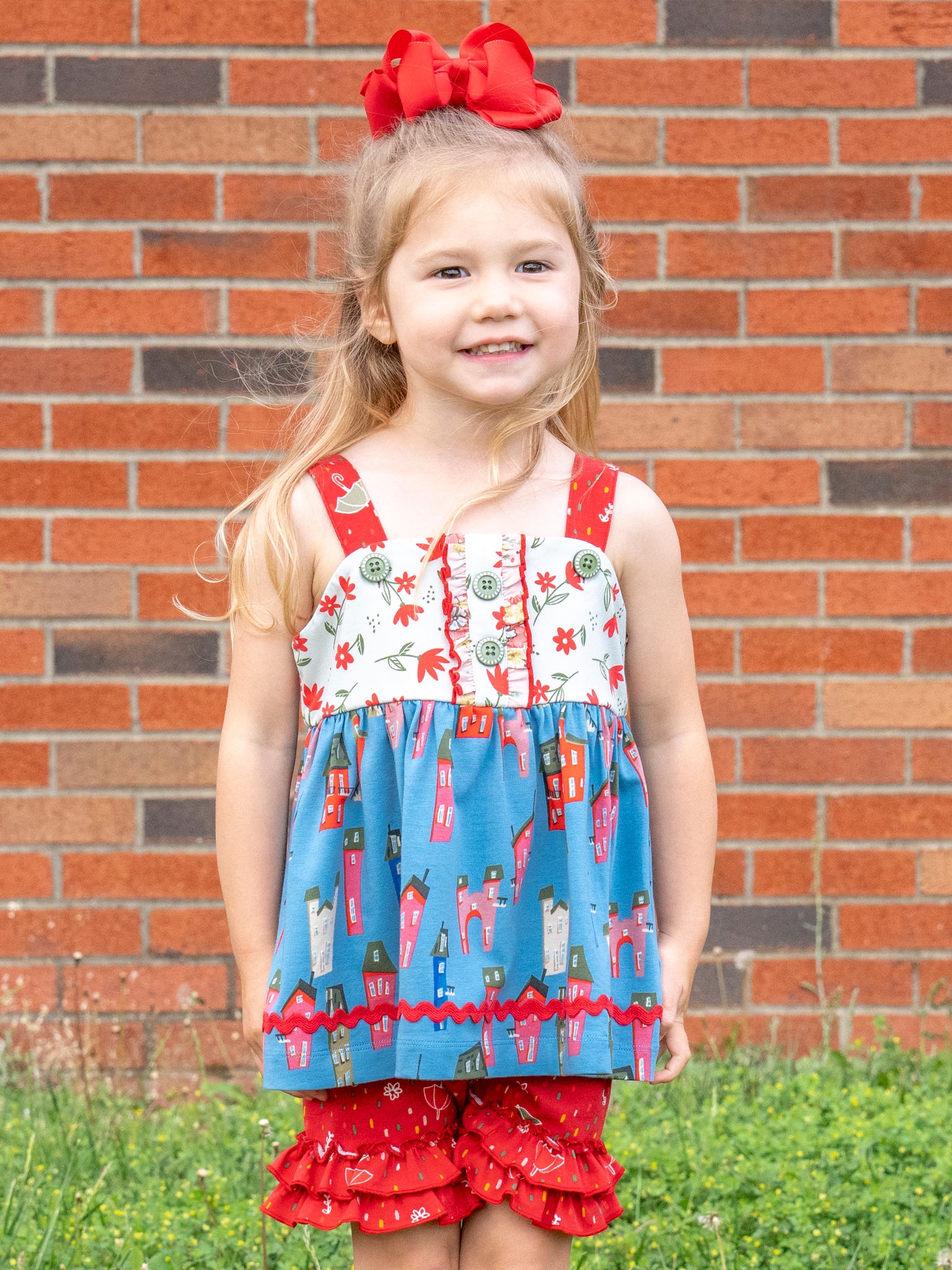 Sweeten up her summer style with our Storybook Lane Cupcake Ruffle Outfit. This girls set from our MNC Exclusive Storybook Lane Collection features a strappy swing top with dainty button details, floral accents, and our signature storybook village print. The coordinating ruffle shorts are covered in cheerful umbrellas and finished with double layers of frilly fun. Perfect for warm-weather adventures, birthday parties, and making magical memories. Sister sets never looked so sweet!