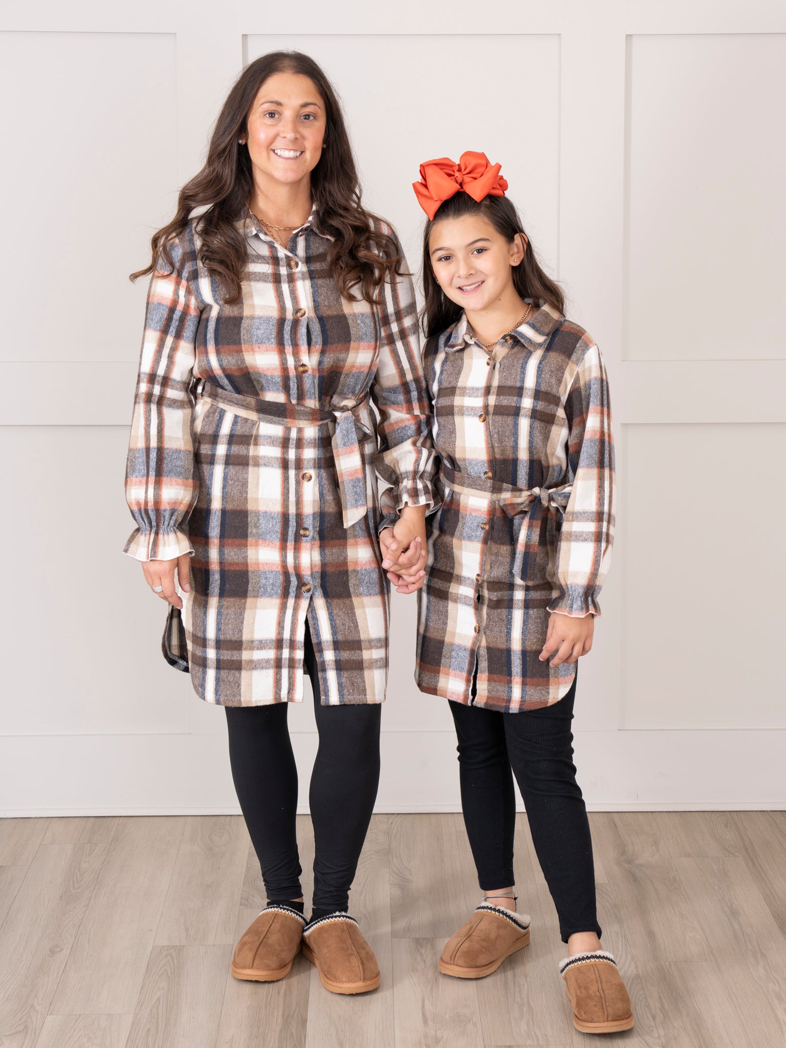 This Mom & Me Long Flannel Tunic is the perfect autumn addition to your wardrobe. The flannel material will keep you cozy, and the included belt adds a touch of style. With a playful dark brown and rust plaid pattern, you and your mini-me will be the ultimate fashion duo!