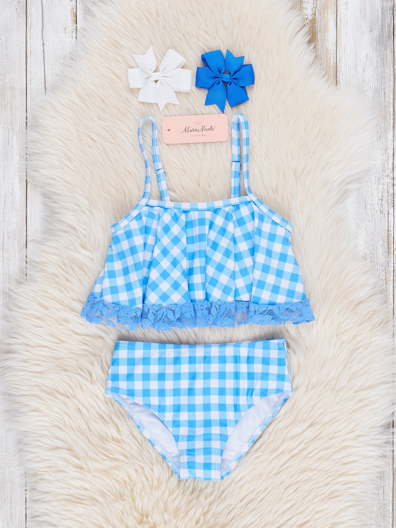 Get ready to make a splash this summer with our Summer Gingham Lacy Swimsuit! This two-piece set features a stylish blue gingham print that is perfect for any beach day. The adjustable strap top with lace trim provides a comfortable and customizable fit, while the high waist bottoms offer a flattering silhouette. Plus, it's a Mom & Me set, so you and your little one can match in style. Get yours from Marie Nicole Clothing now!