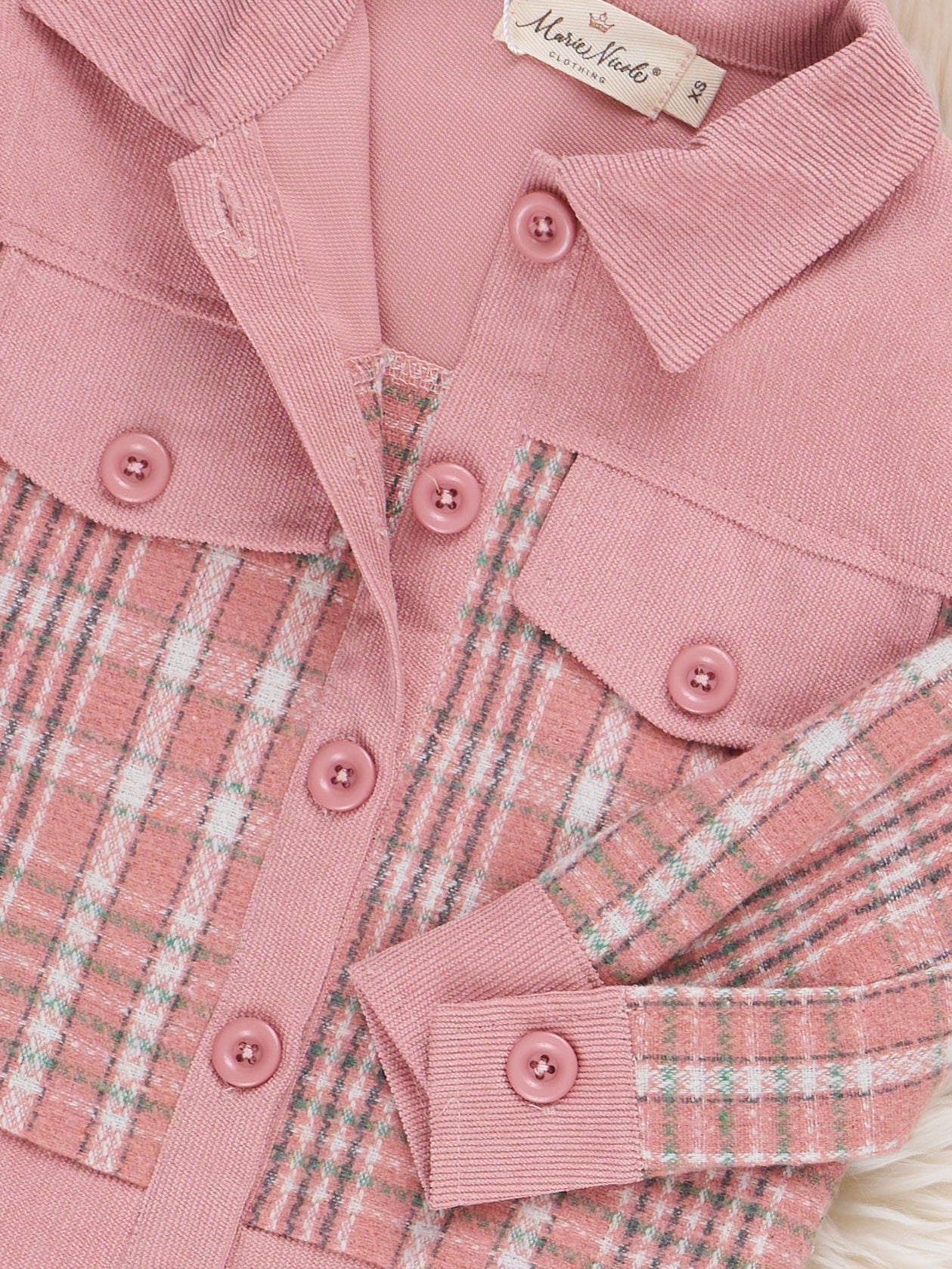 The Urban Rose Plaid Jacket by Marie Nicole Clothing features a classic collared design with button-front closures and patch pockets. The front and sleeves are adorned with a timeless plaid pattern, while solid panels and cuffs add tailored detail, creating a versatile piece for stylish adventures.
