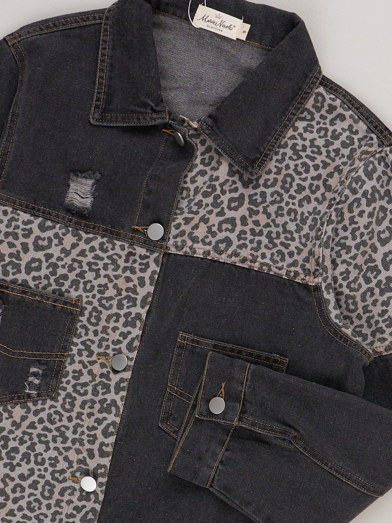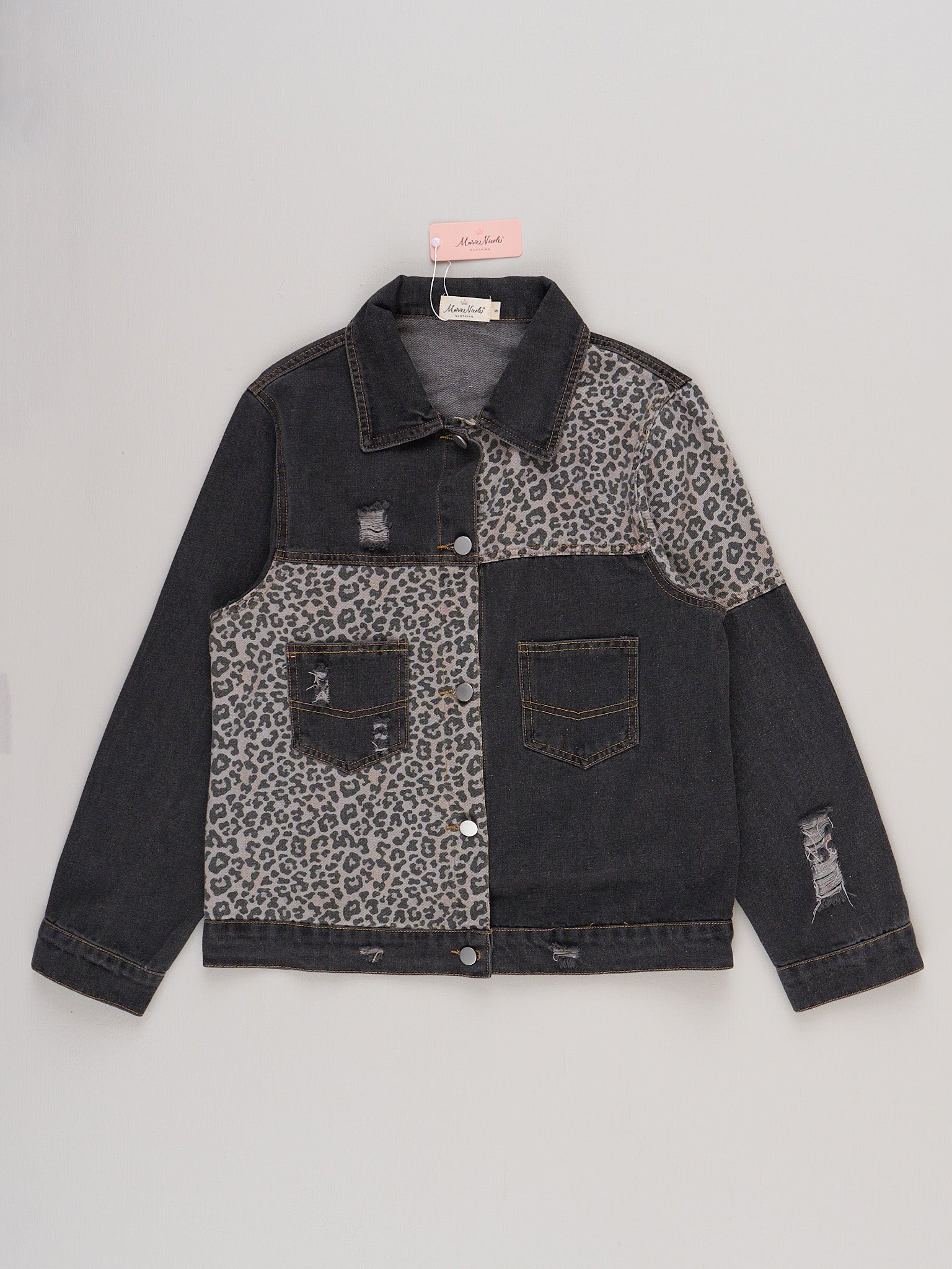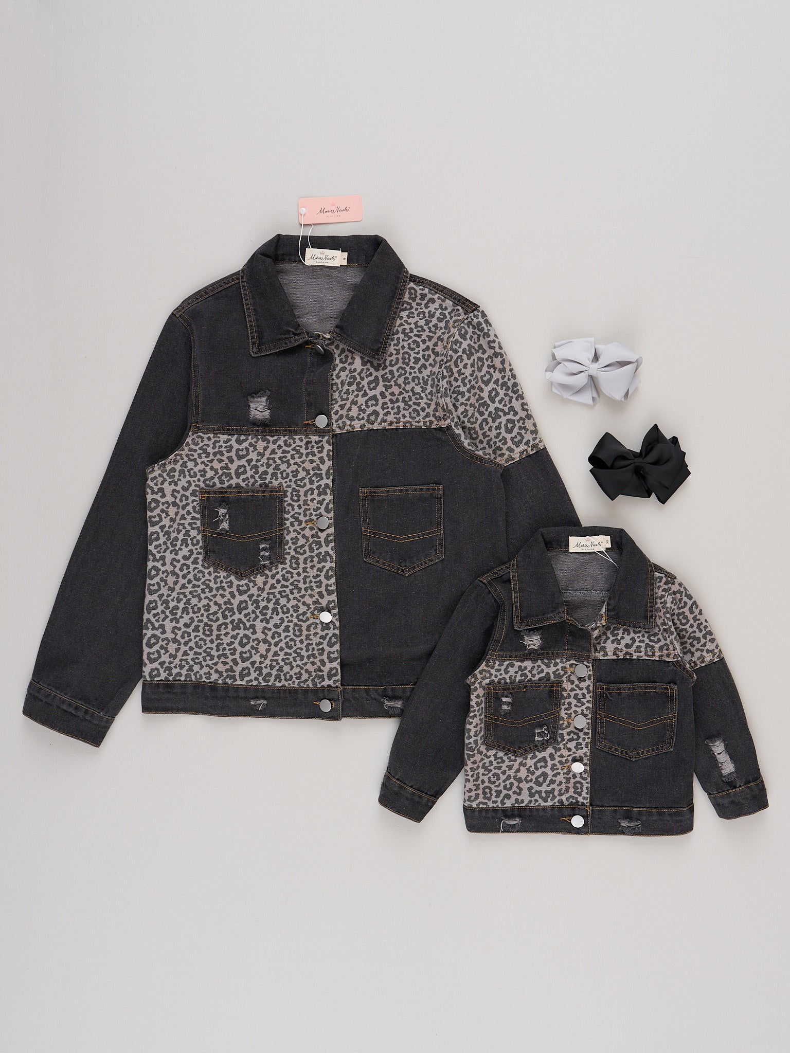 The Mom & Me City Safari Denim Jacket by Marie Nicole Clothing features a unique mix of bold animal print panels and solid denim sections, complete with classic button-front closures, collared necklines, and practical patch pockets. This coordinated jacket set brings adventurous style and urban flair for family outings
