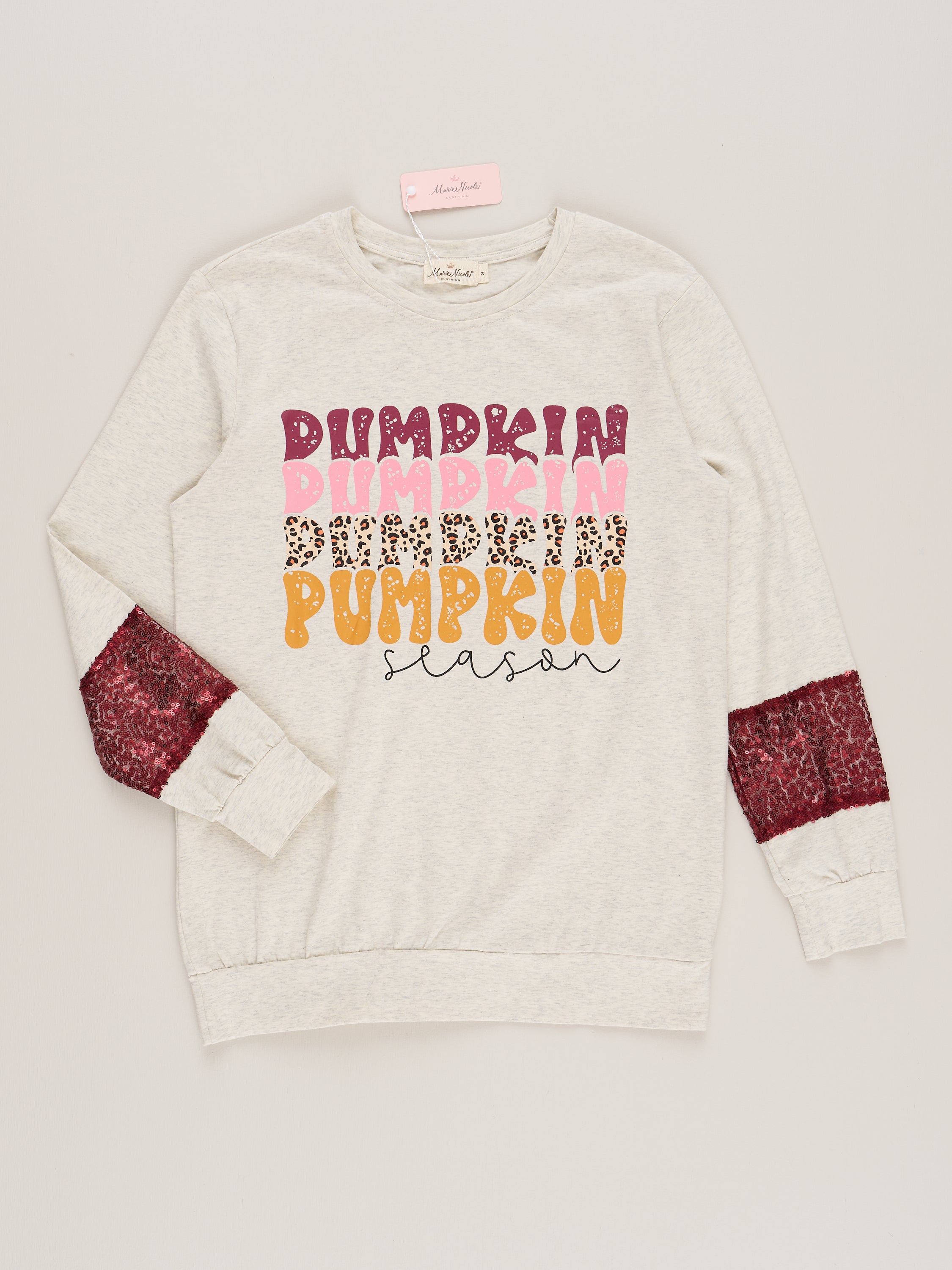 Get ready for pumpkin season with this quirky and playful "Mom & Me" grey shirt! Featuring sequin sleeve detail, this top is perfect for matching with your little one. Embrace the fun and cozy vibes of fall with this trendy shirt. Fall never looked so cute!