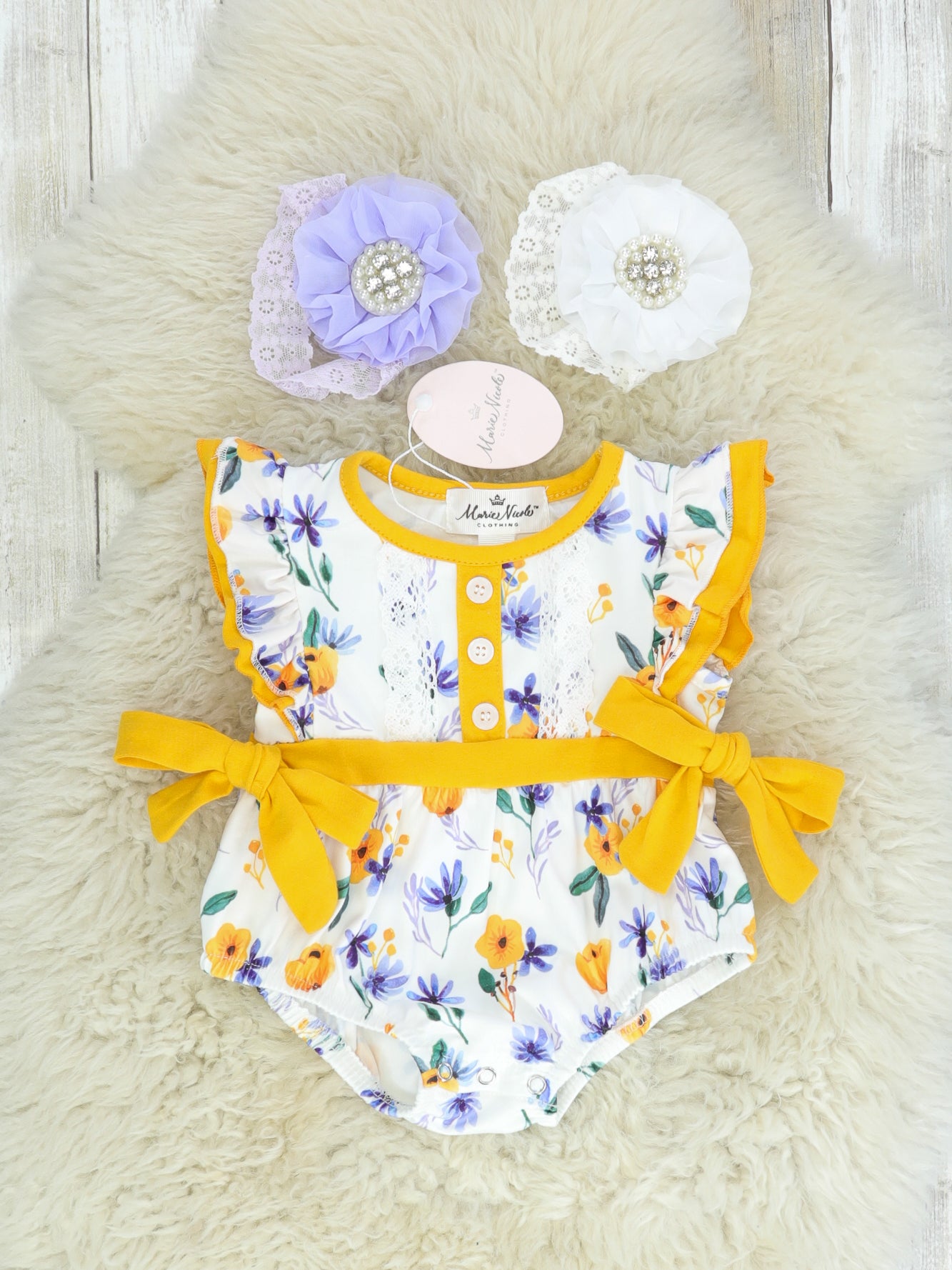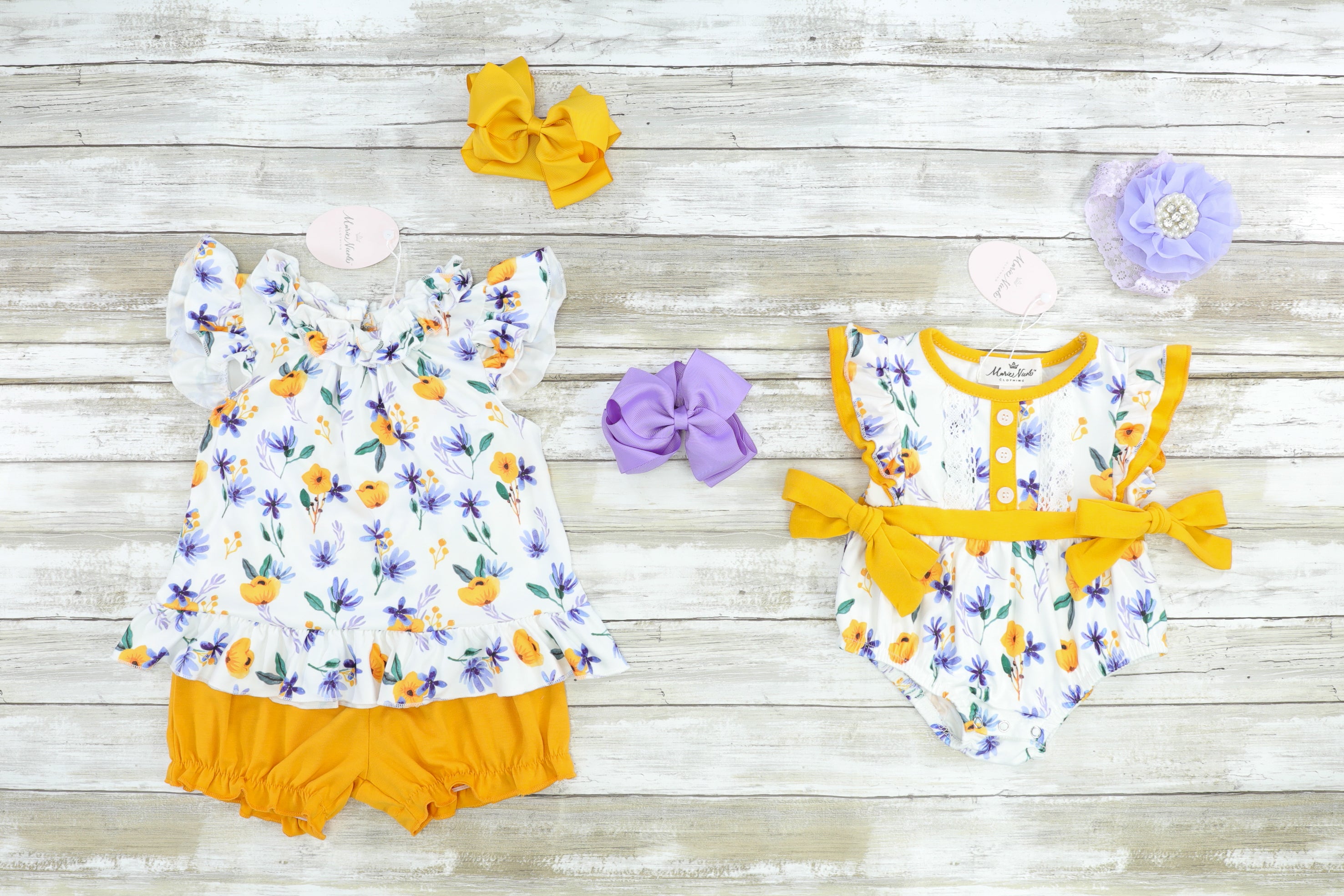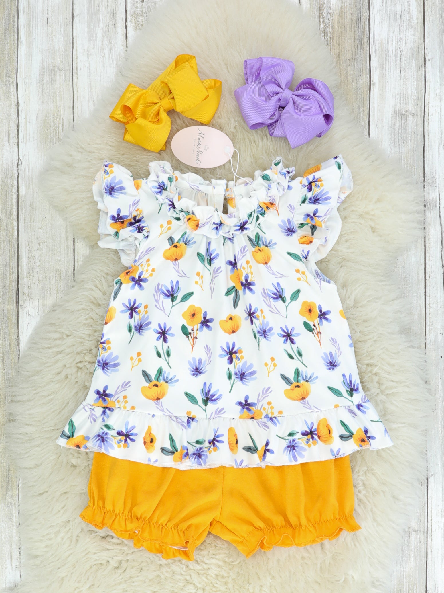 Mustard & Purple Floral Ruffle Top & Shorts Outfit