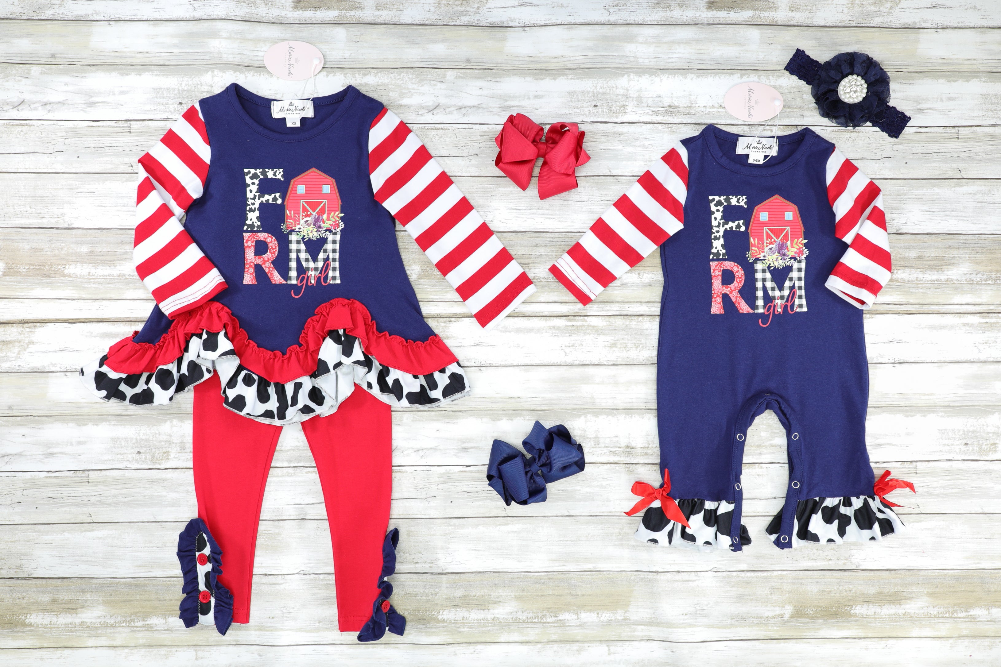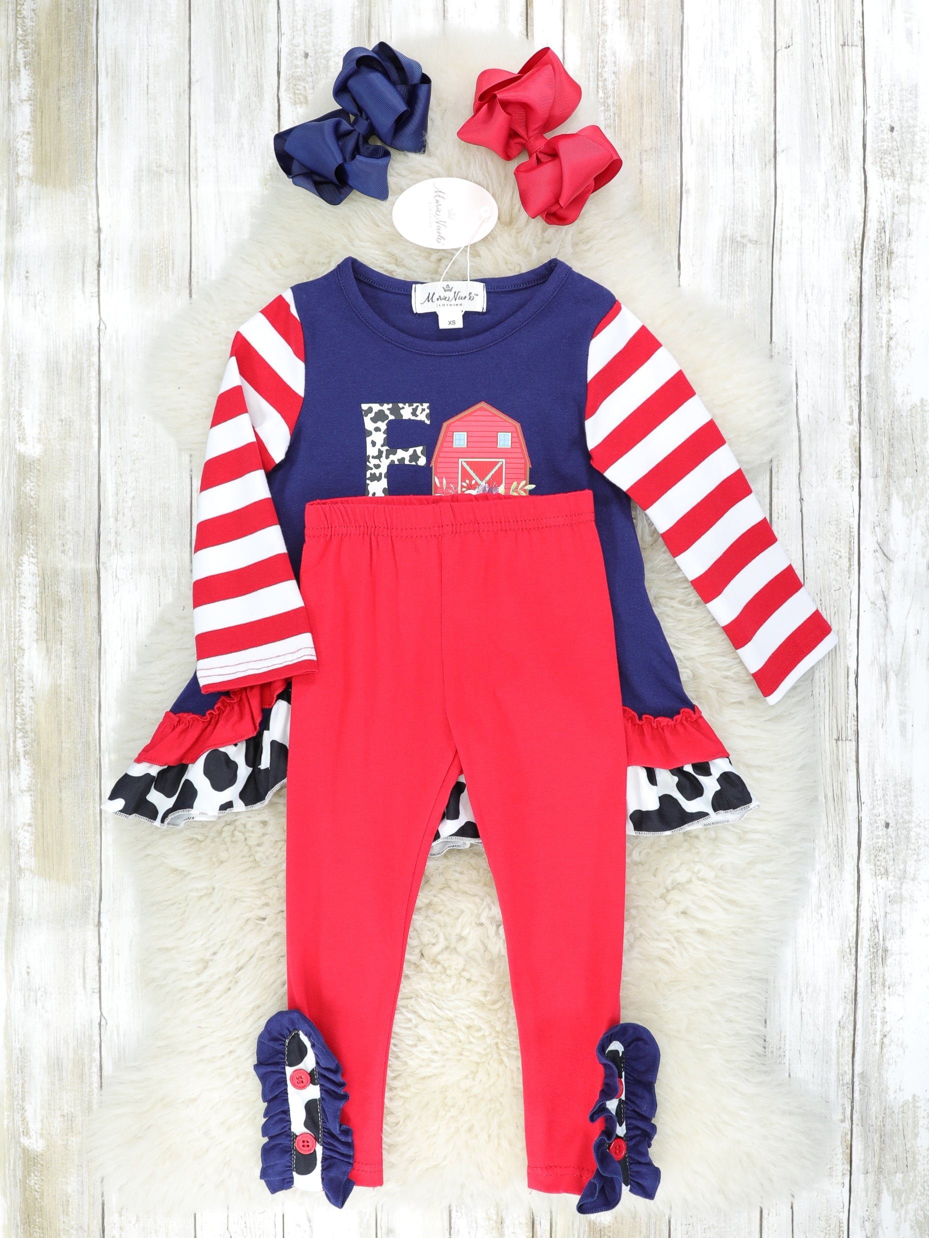 Navy "Farm" Cow Print Ruffle Top & Red Bottoms Outfit