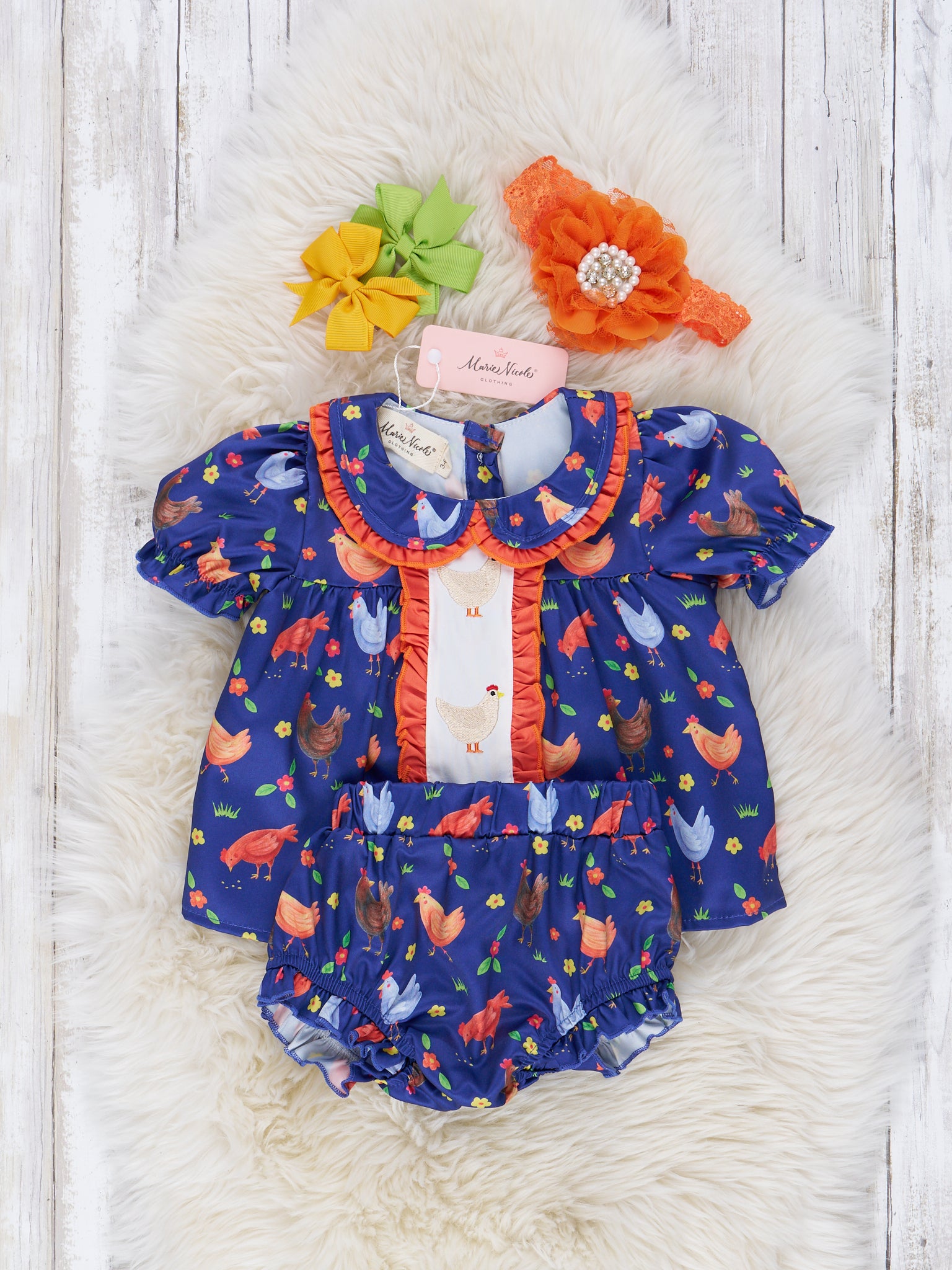 Navy & Orange Embroidered Chicken Ruffle Bloomer Outfit