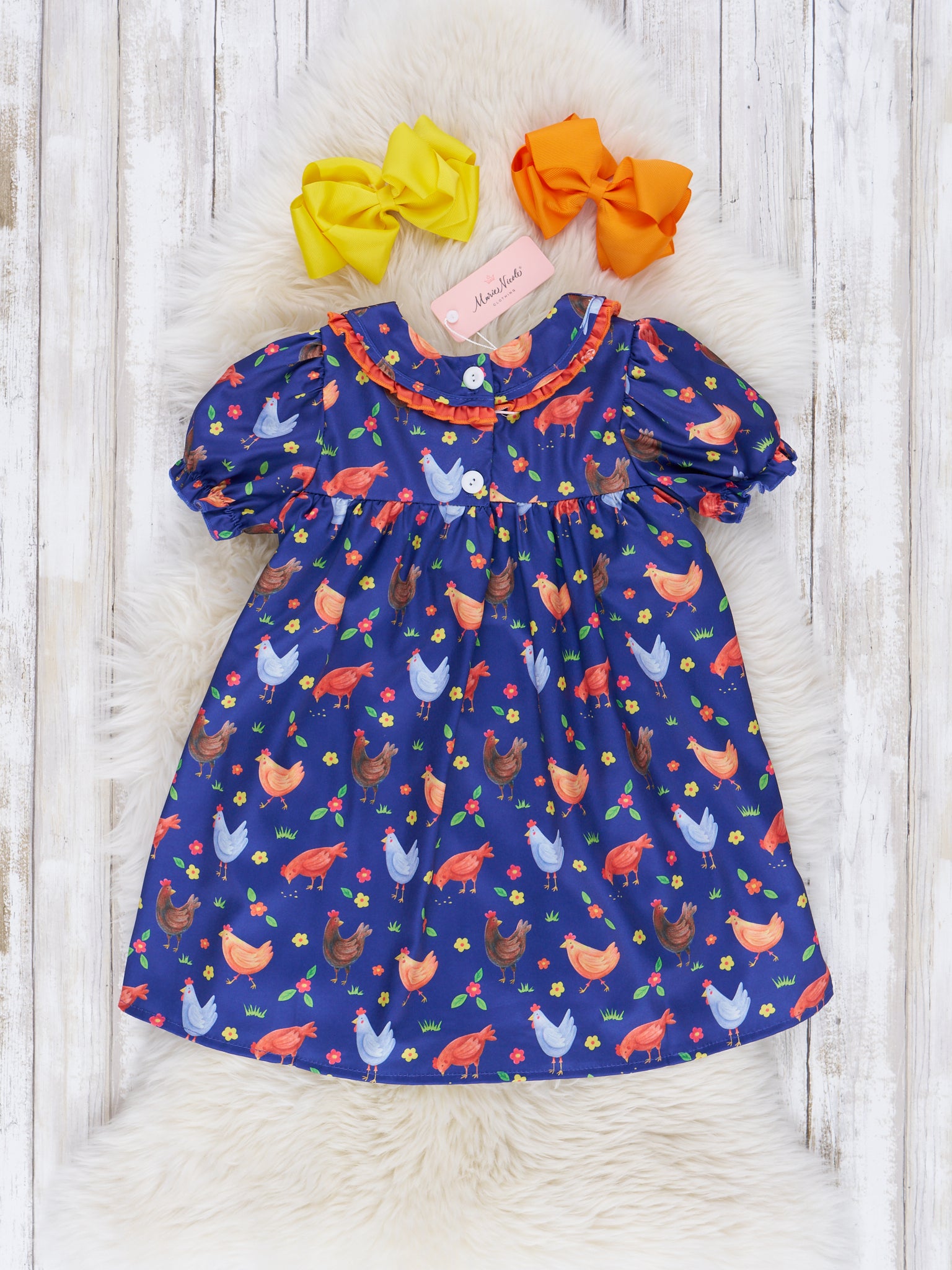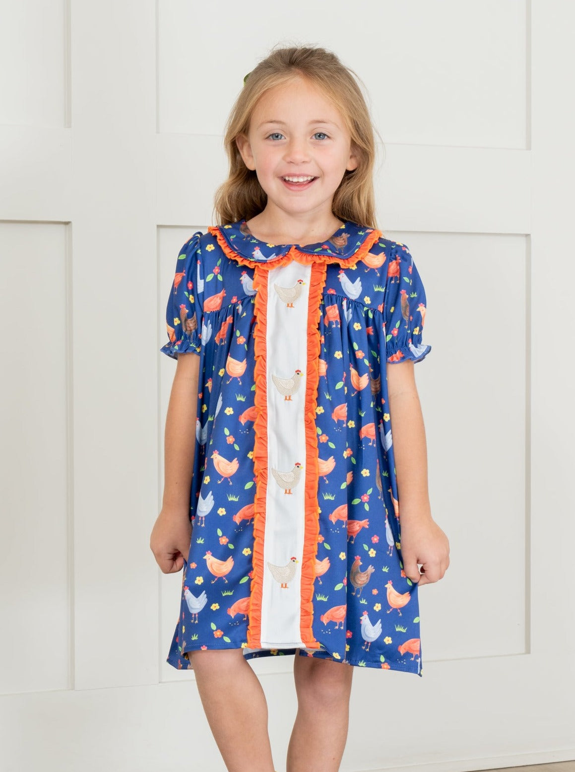 Navy & Orange Embroidered Chicken Ruffle Dress
