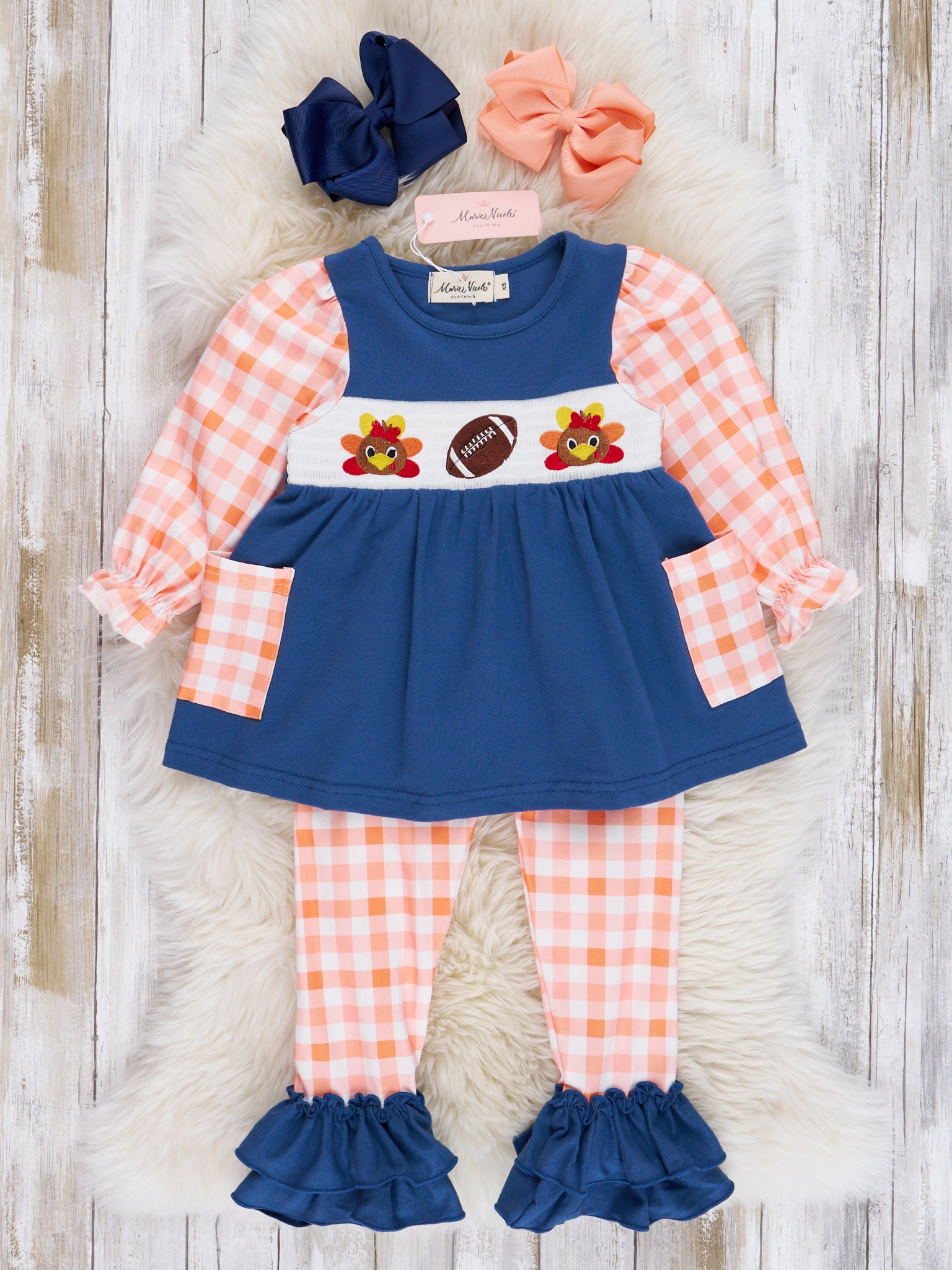 Score a touchdown in style with this Navy & Orange Plaid Smocked Football Sibling set! This fun and fashionable ruffle outfit features a cheerful orange plaid print with a smocked scene of a classic football game. Get your little ones ready for game day in the cutest way possible! 🏈