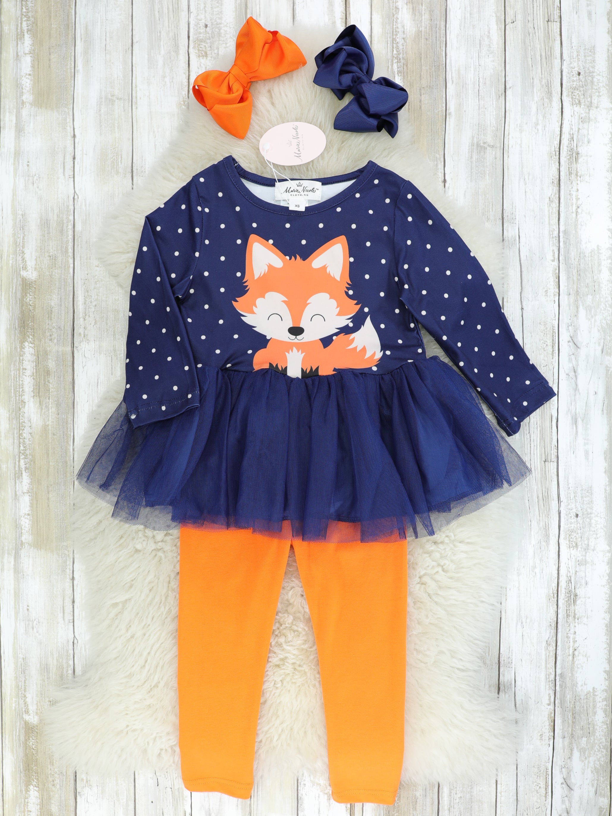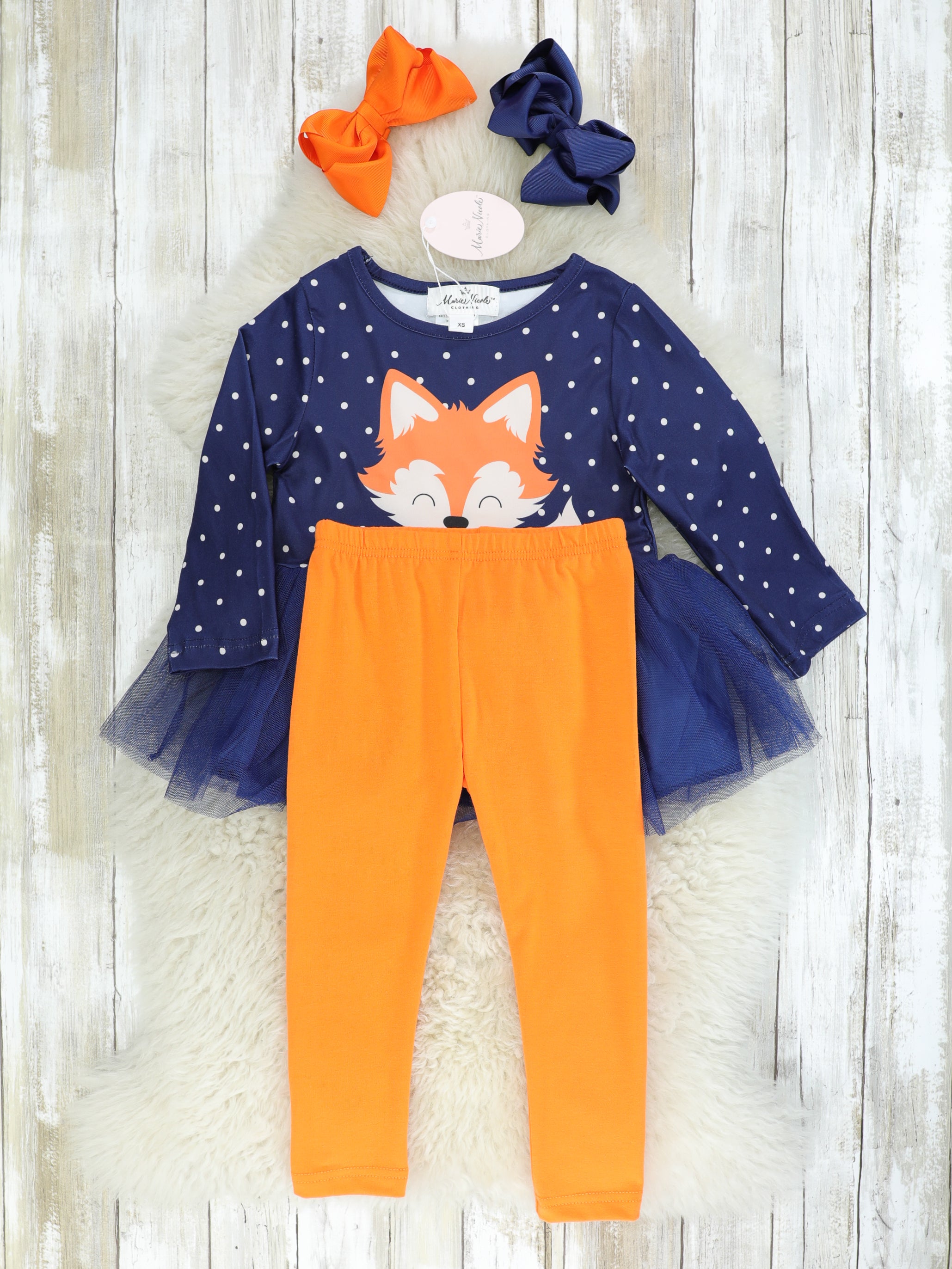 Navy Polka Dot Fox Tulle Top & Orange Bottoms Outfit