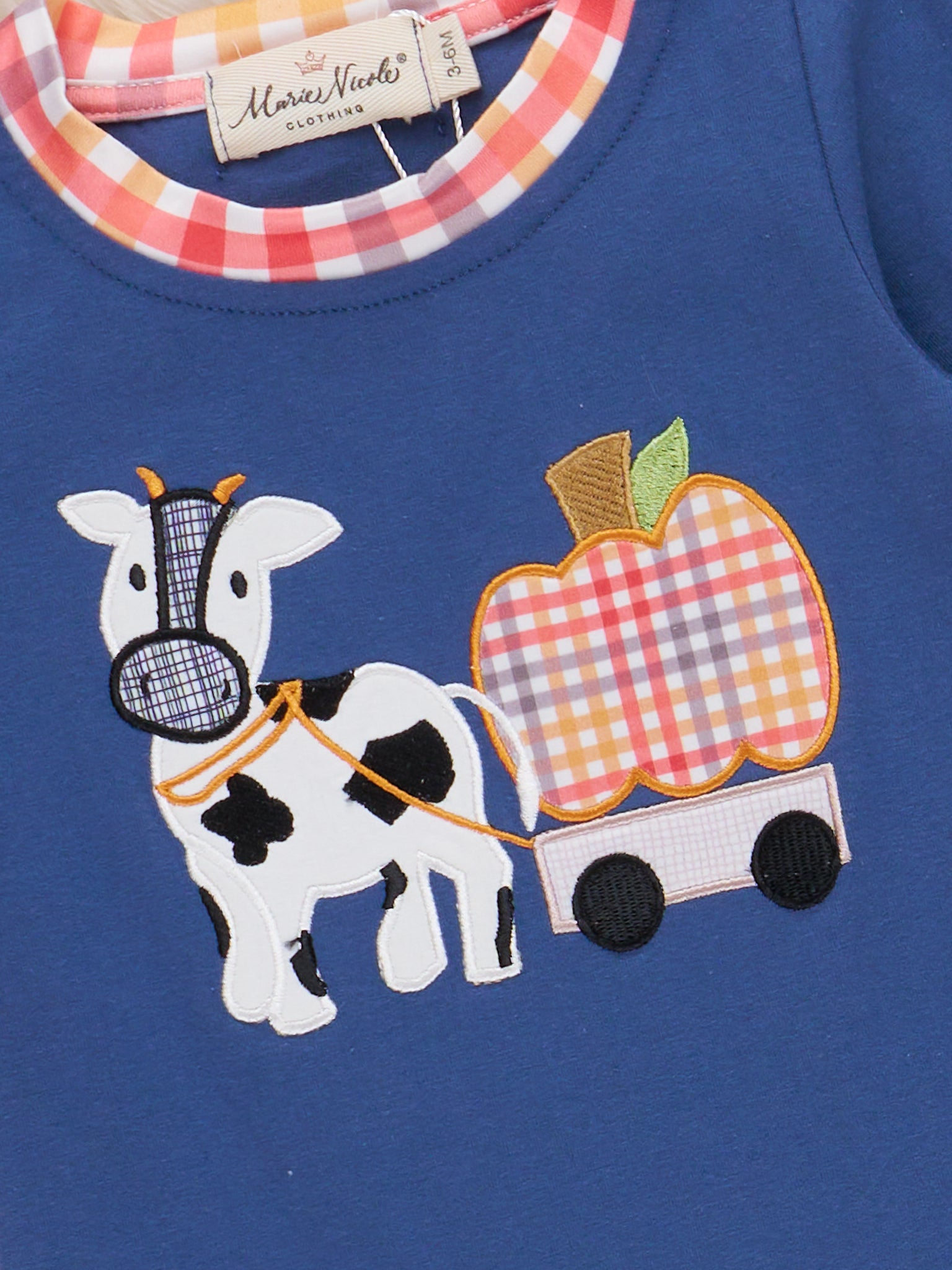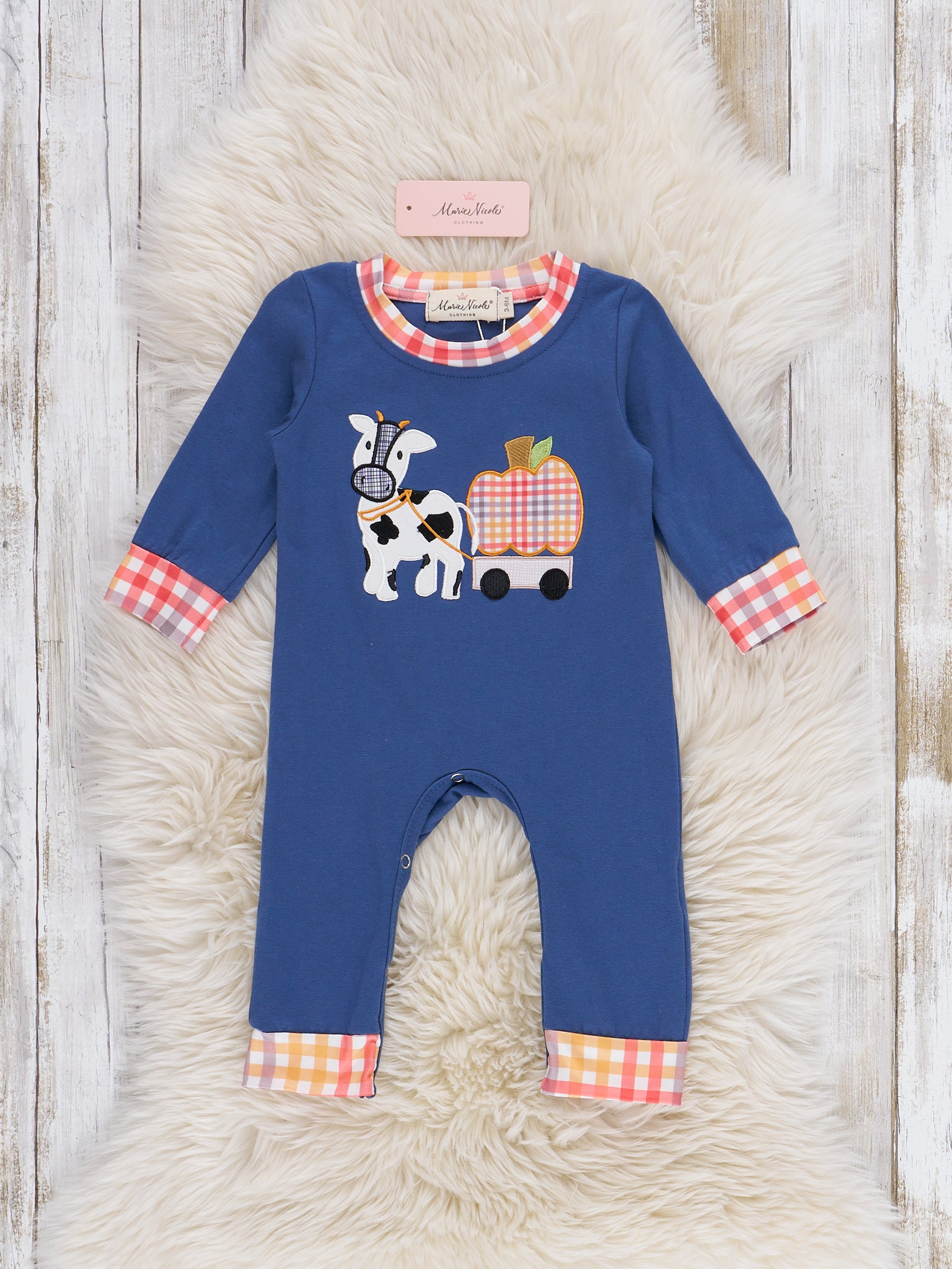 The Farm Friends Pumpkin Ride Embroidered Romper by Marie Nicole Clothing features playful appliqué of a cow and pumpkin wagon on the chest, with coordinating plaid trim at the collar and cuffs. This comfortable romper offers easy snap closures, making it perfect for seasonal outings, playdates, and capturing festive fall moments.
