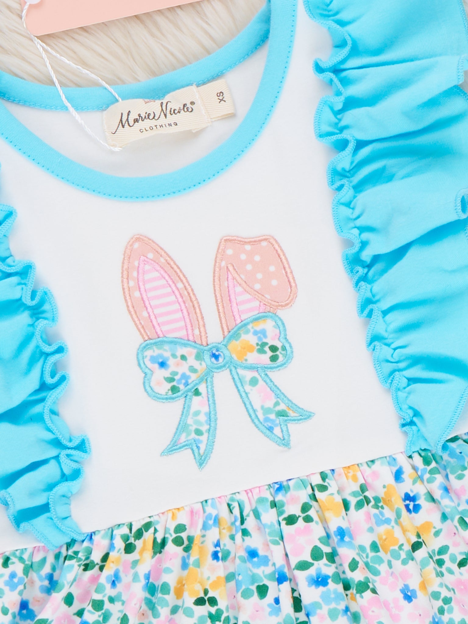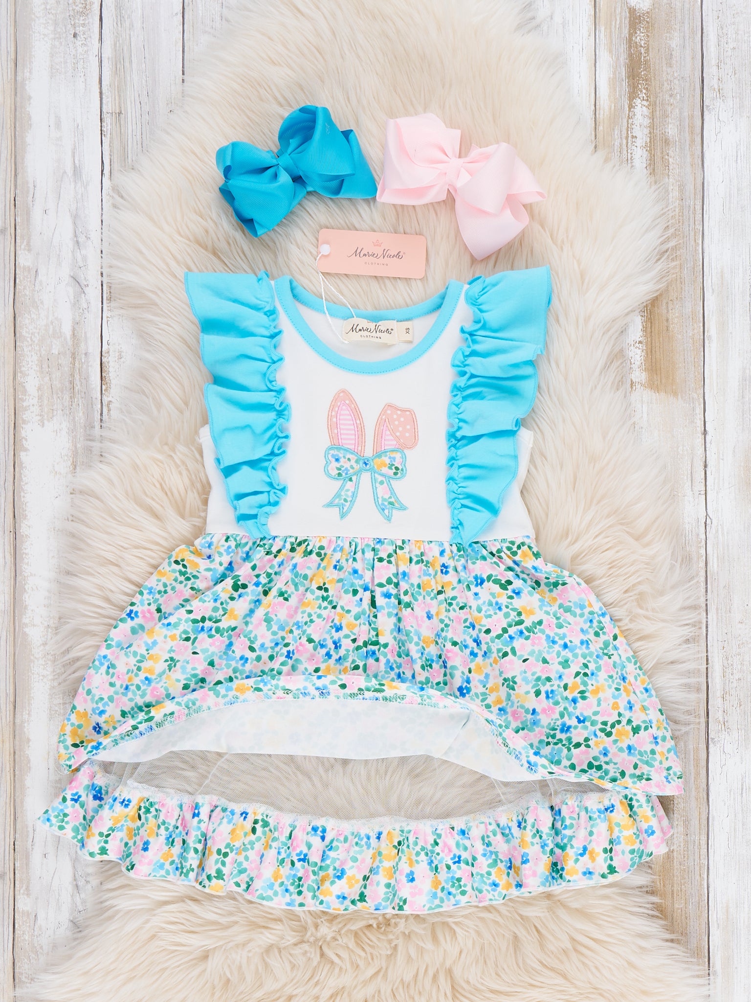 Bunny Ears Blooms Embroidered Cotton Dress by Marie Nicole Clothing features a flutter-sleeve bodice with embroidered bunny ears and bow accent, paired with a full floral skirt for a playful spring finish. Smocking at the chest offers gentle comfort and room for movement, making this style perfect for twirls, outings, or sweet seasonal celebrations. The charming mix of embroidered detail and floral prints ensures a cheerful, whimsical look for your little one.