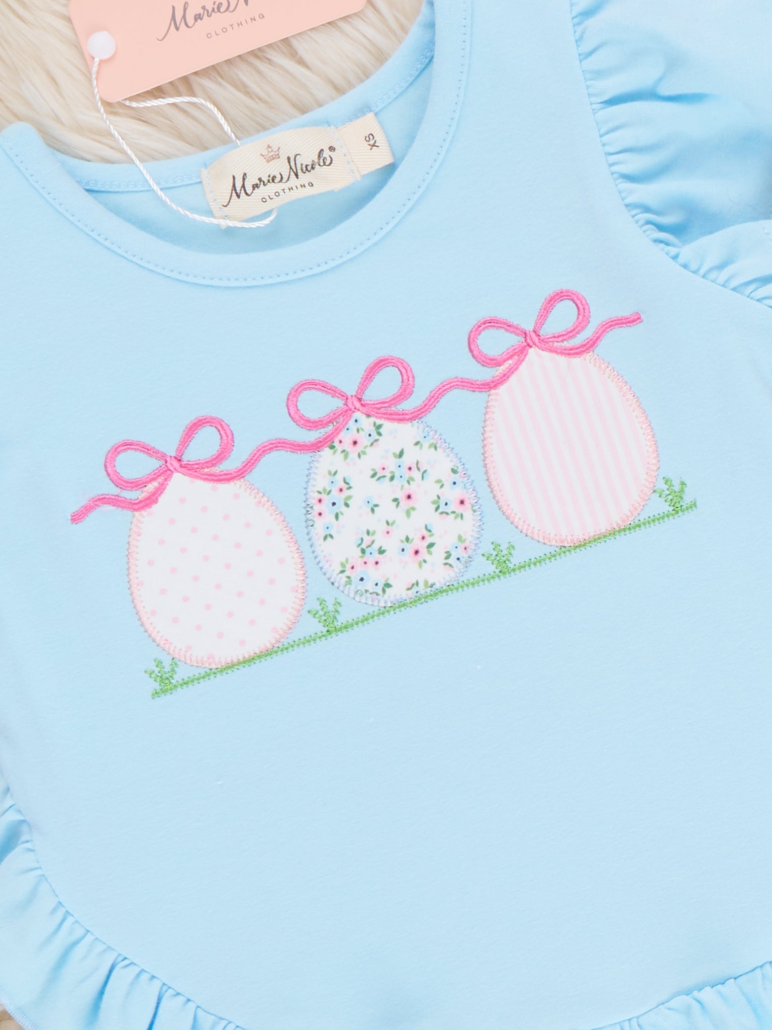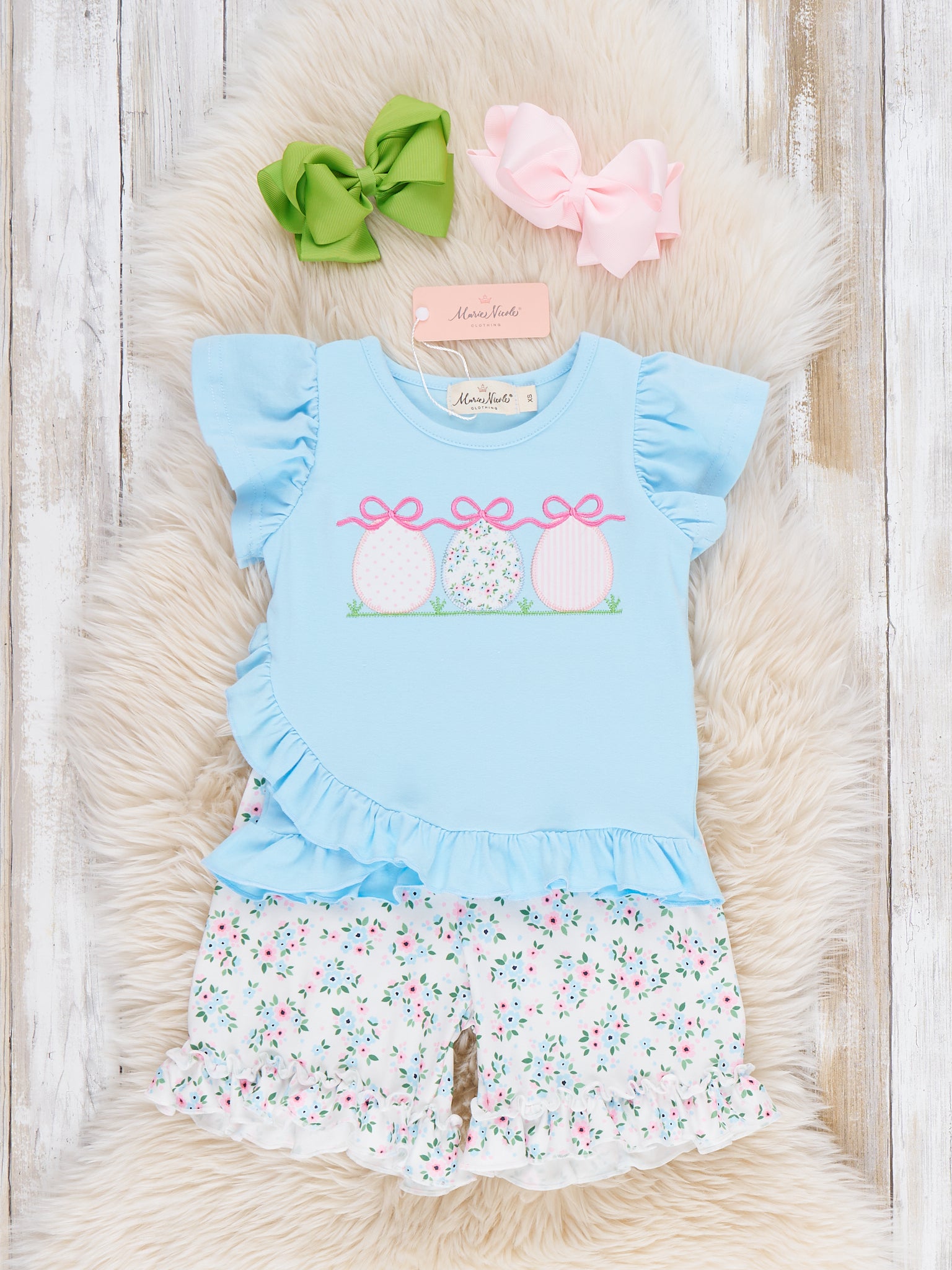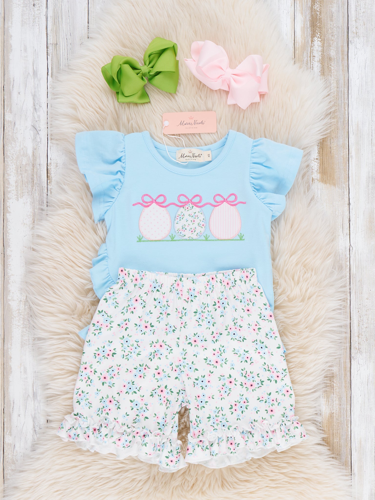 Ribbons & Eggs Garden Embroidered Ruffle Outfit by Marie Nicole Clothing brings together a flutter-sleeve top with embroidered Easter eggs and ribbon motif, and relaxed ruffle-hem shorts in a sweet floral pattern. The look is playful and cottage-inspired, ideal for Easter, garden gatherings, or spring playdates, with easy comfort and cheerful details for little ones.