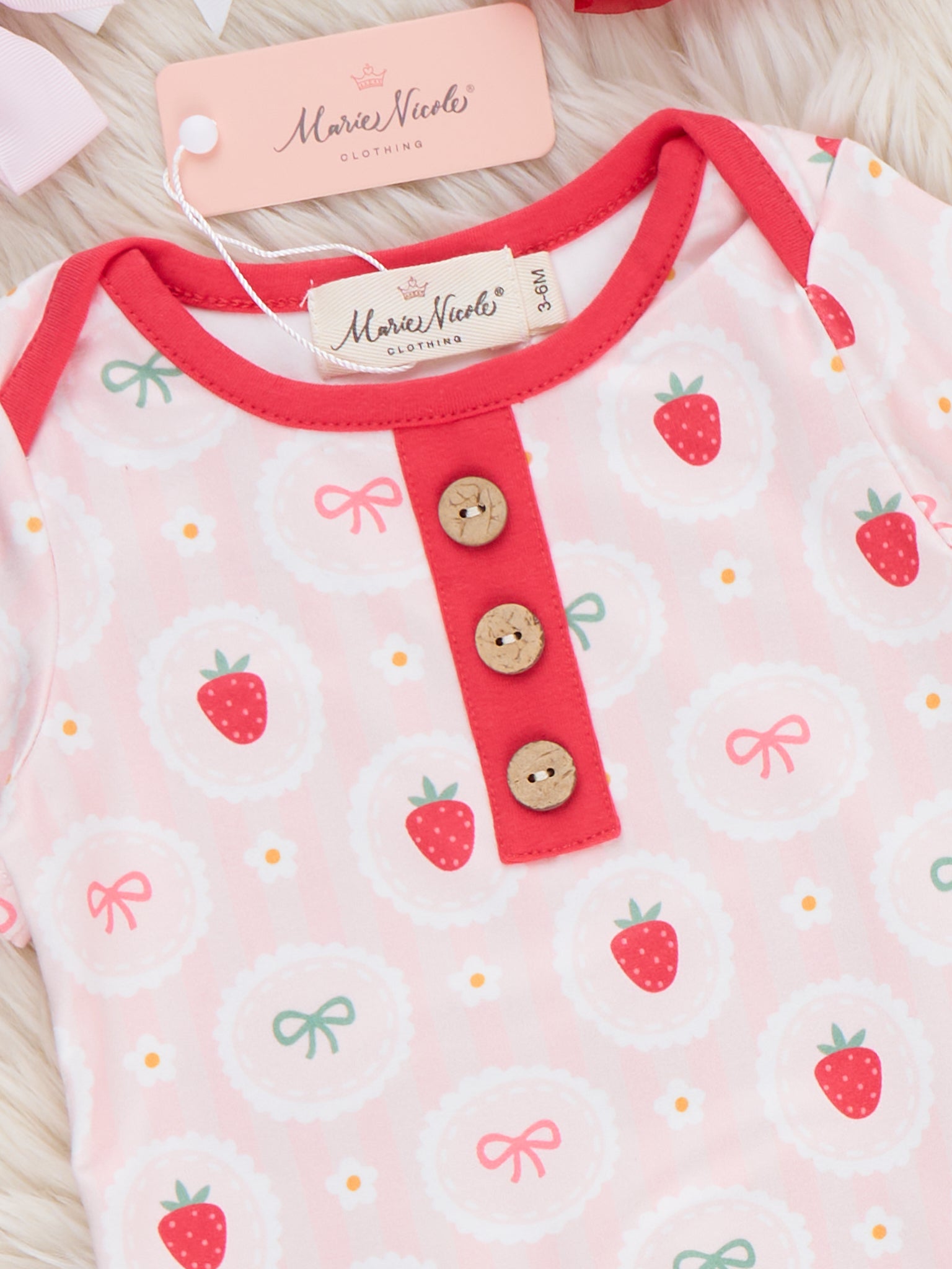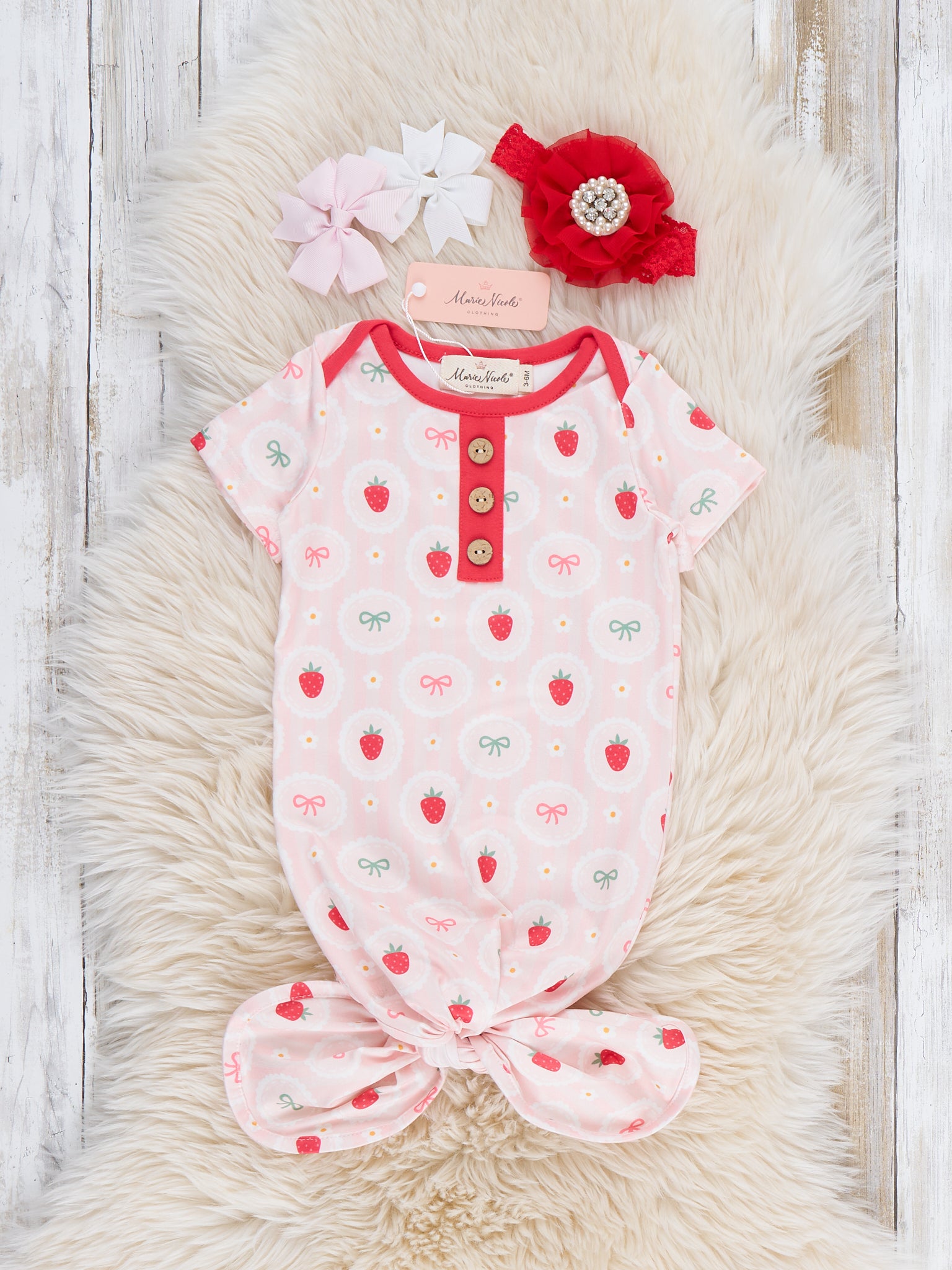 The Strawberry Dreams Knot Gown by Marie Nicole Clothing surrounds baby in soft sweetness with an allover berry print and contrast button placket detail. Gentle fabric and an open-bottom gown design make diaper changes quick and easy, keeping little ones cozy for nighttime snuggles, dreamy naps, and peaceful, strawberry-sprinkled sleep.