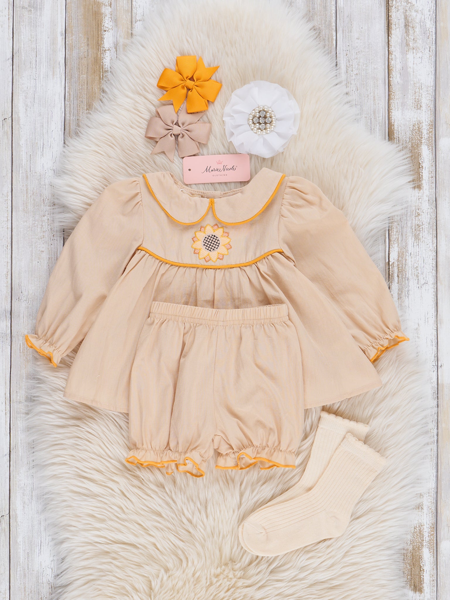☀️ Made with soft tan fabric and adorned with an embroidered sunflower, this bloomers set will make your little girl stand out in the crowd. Complete with a cute yellow trim and a peter pan collar, this outfit is perfect for fun in the sunflower field! By Marie Nicole Clothing.