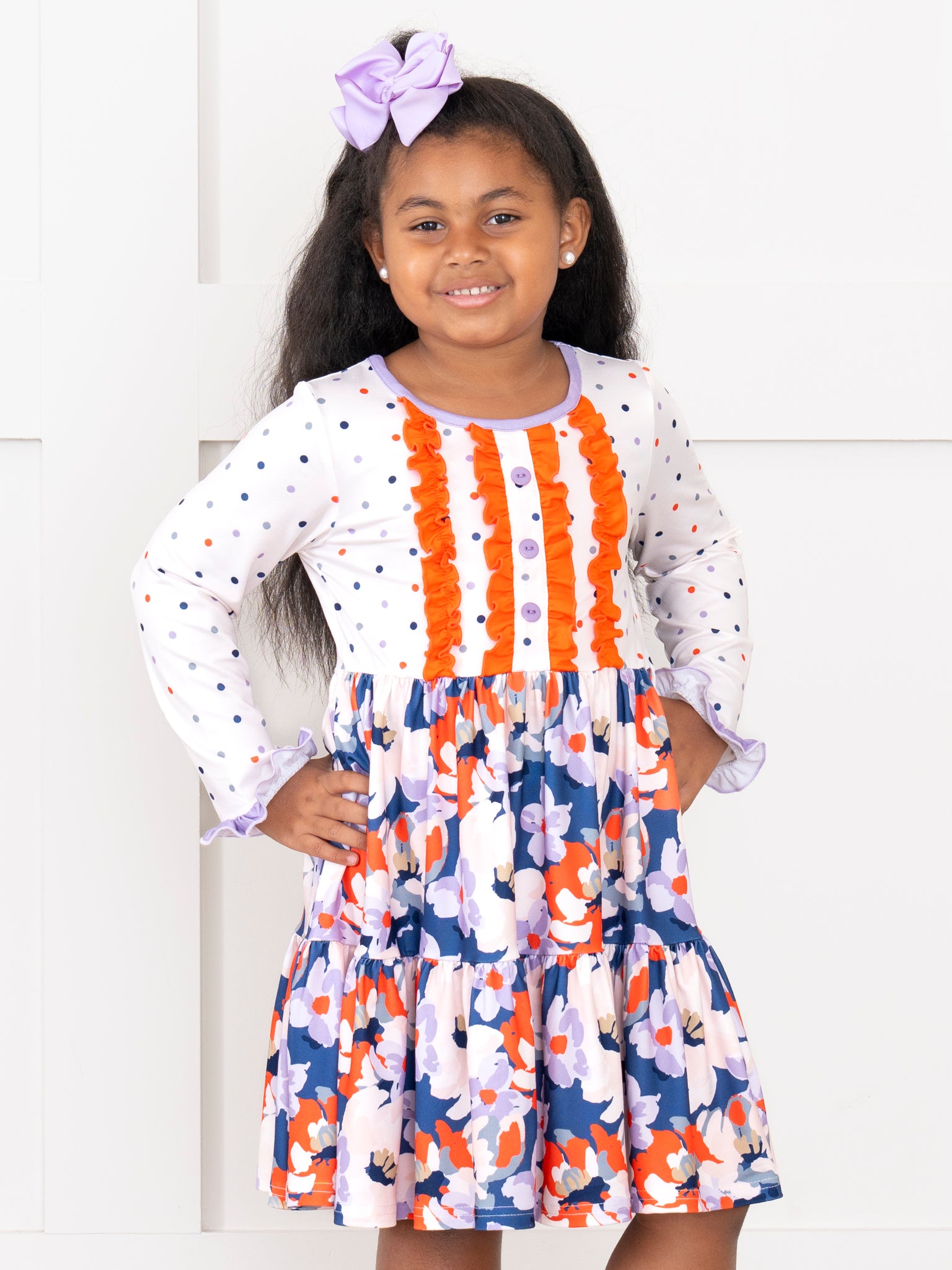 The Bloom & Dots Ruffle Dress is a sweet and playful pick for bright days and blooming adventures. Featuring a charming mix of floral blooms and classic polka dots, this dress from Marie Nicole Clothing is finished with soft ruffle details for added sweetness. Lightweight, breathable, and full of cheerful charm, it’s perfect for twirling through playdates, parties, or any day she wants to shine.