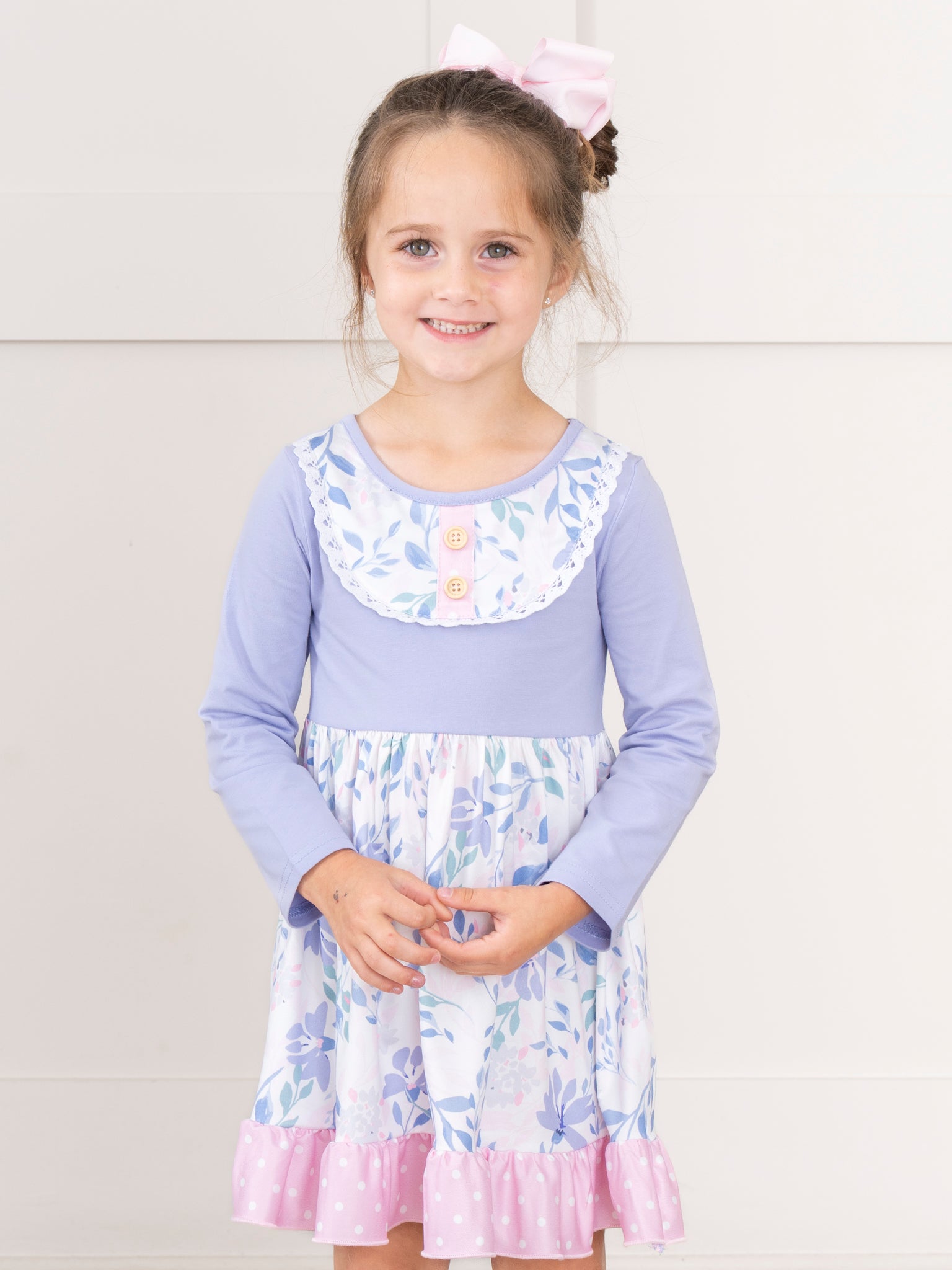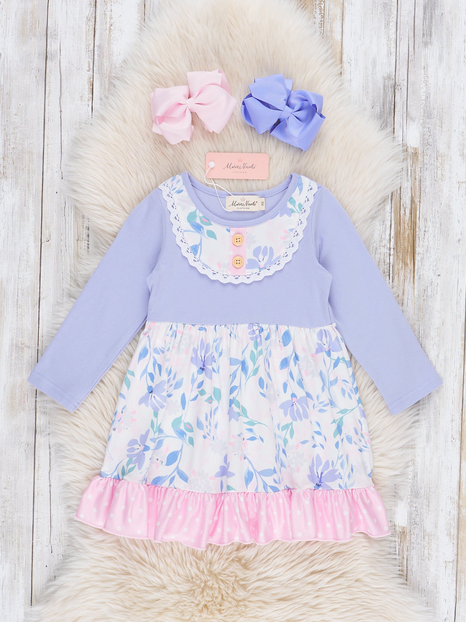 Bloom with sweetness in our Lavender Fields Ruffle Dress! This charming girls’ dress from Marie Nicole Clothing features a delicate lavender floral print paired with soft ruffle details for an effortlessly pretty look. Perfect for springtime outings, family gatherings, or any day she wants to twirl in style.
