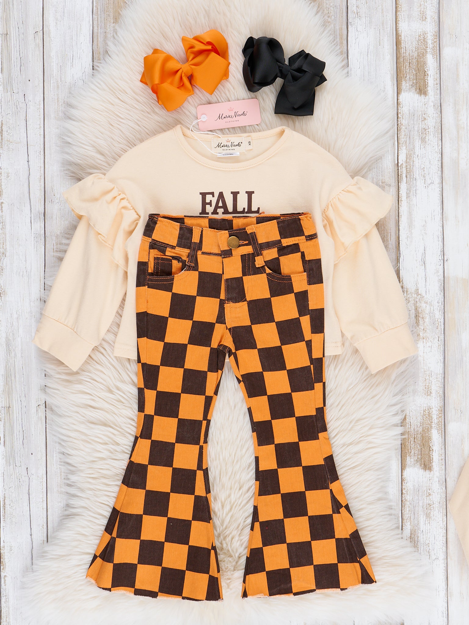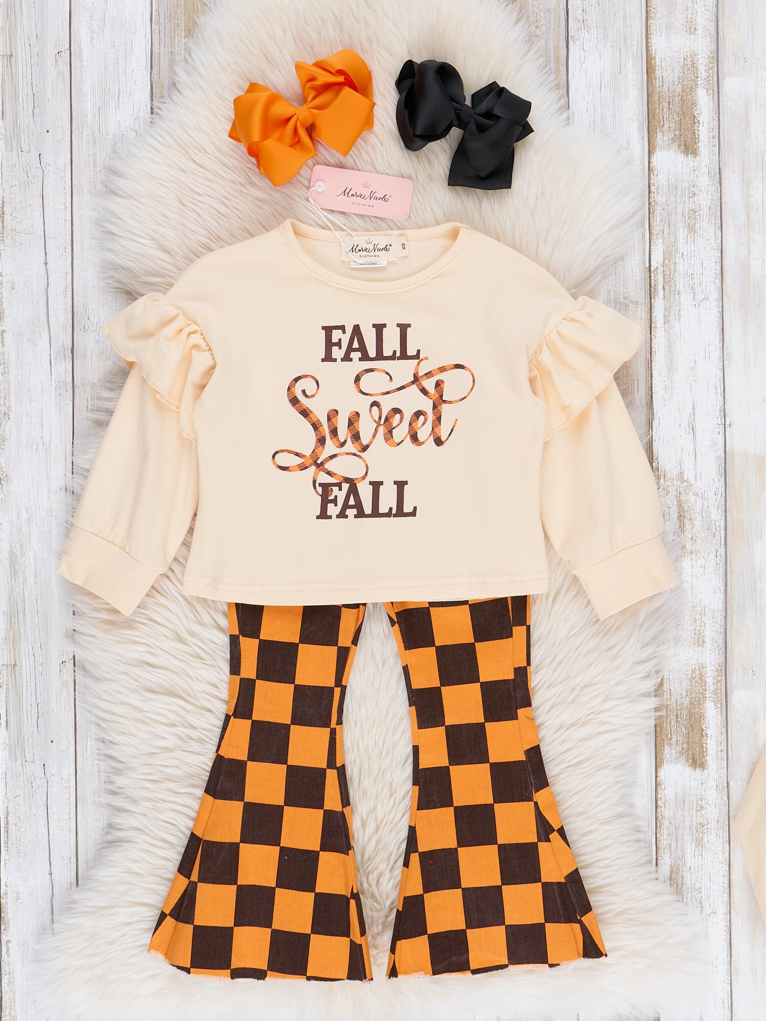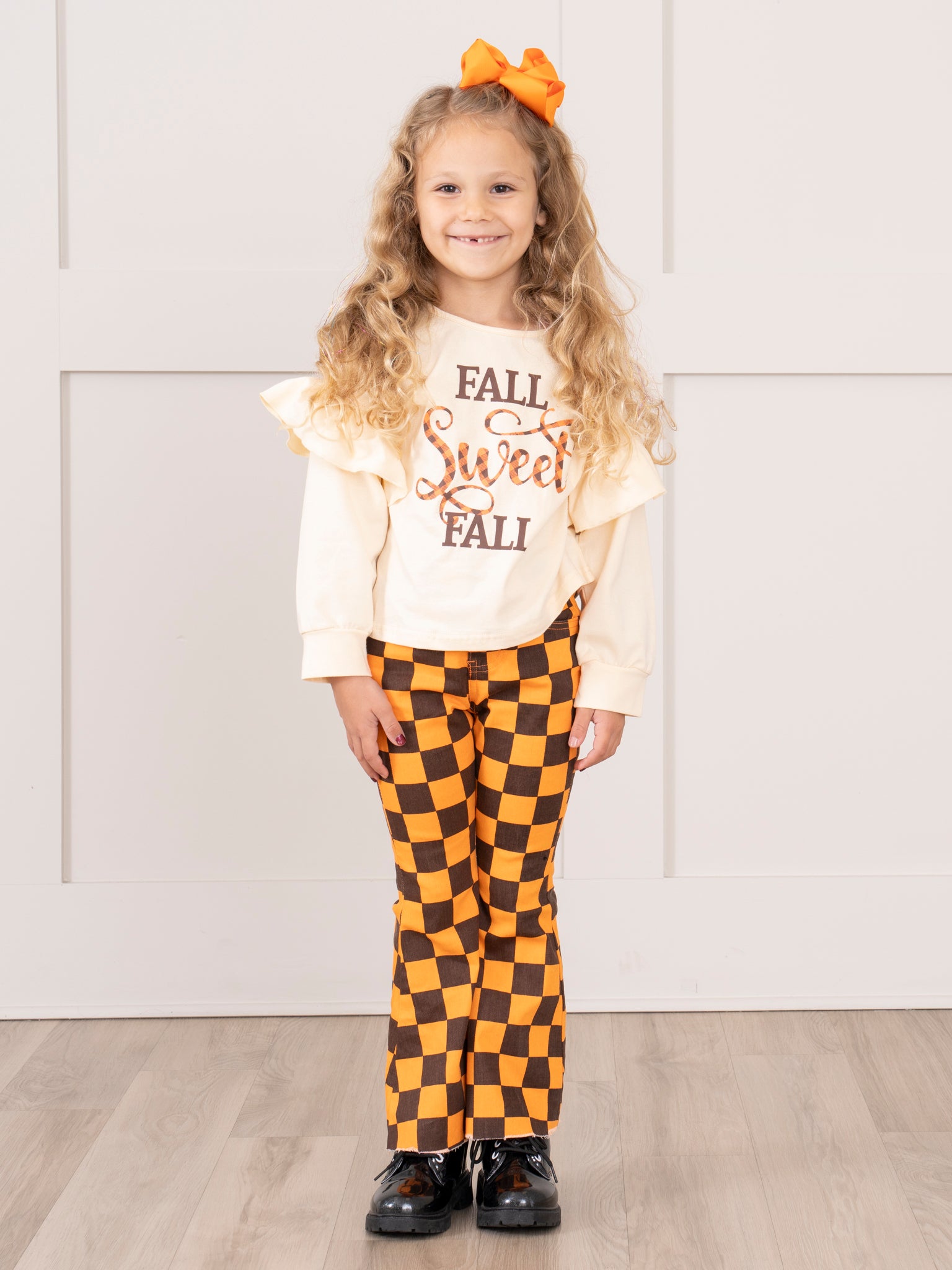 Get ready to rock the season in our 'Sweet Fall' outfit! This girl's set features a ruffle sleeve top with the playful slogan "Fall, Sweet Fall" and eye-catching orange & brown checker flare pants. Perfect for adding a touch of fun to any fall day. Don't miss out on this quirky and stylish ensemble!