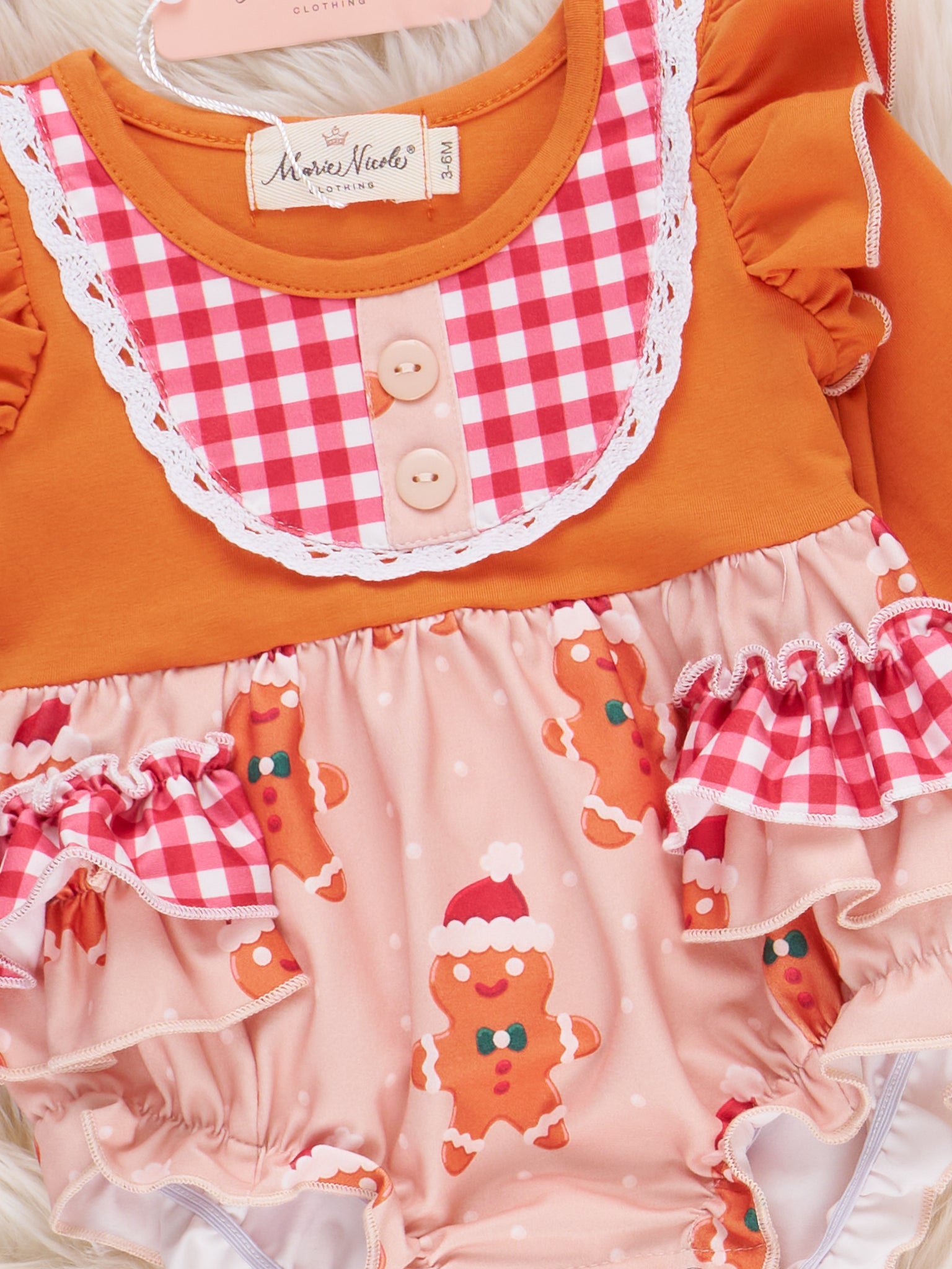 The Gingerbread Delight Plaid Ruffle Bubble is festively styled for the holiday season, featuring playful ruffle accents and delightful plaid trimming with gingerbread-inspired detailing. Crafted by Marie Nicole Clothing, this bubble is designed for easy movement and cheerful comfort, making it ideal for creating adorable holiday memories at family gatherings or seasonal events.